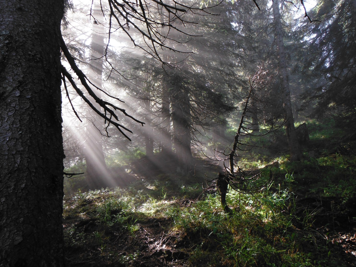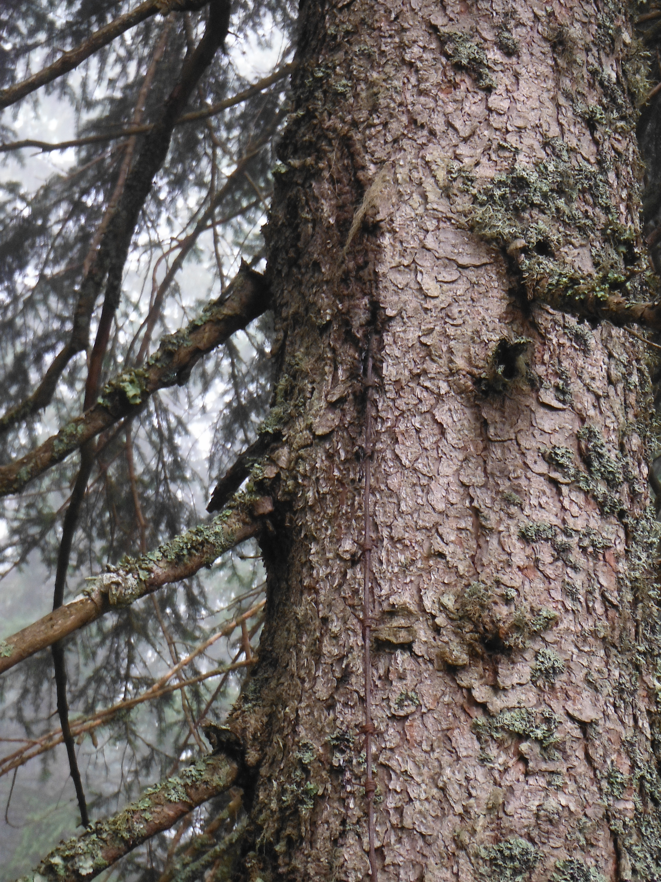 La salita in realtà è piuttosto monotona, complice una giornata bigia con nebbie e nuvole basse che riescono a ingrigire anche un pò del nostro umore, già piuttosto “stinto” dalle avventure di ieri sera. La strada forestale sale costante le pendici del Pal Piccolo, tagliandole completamente in leggera salita. Un’ascesa che va via regolare, fra boschi di vecchi faggi e abeti che in alto stanno subendo un taglio mirato. Qua ci sanno fare, la vecchia pianta abbattuta lascia subito posto a una nuova, piantata al posto della precedente. Si chiama ecosostenibilità, a 100m dal confine con l’Italia han capito parecchio, quello che non han capito i nostri..