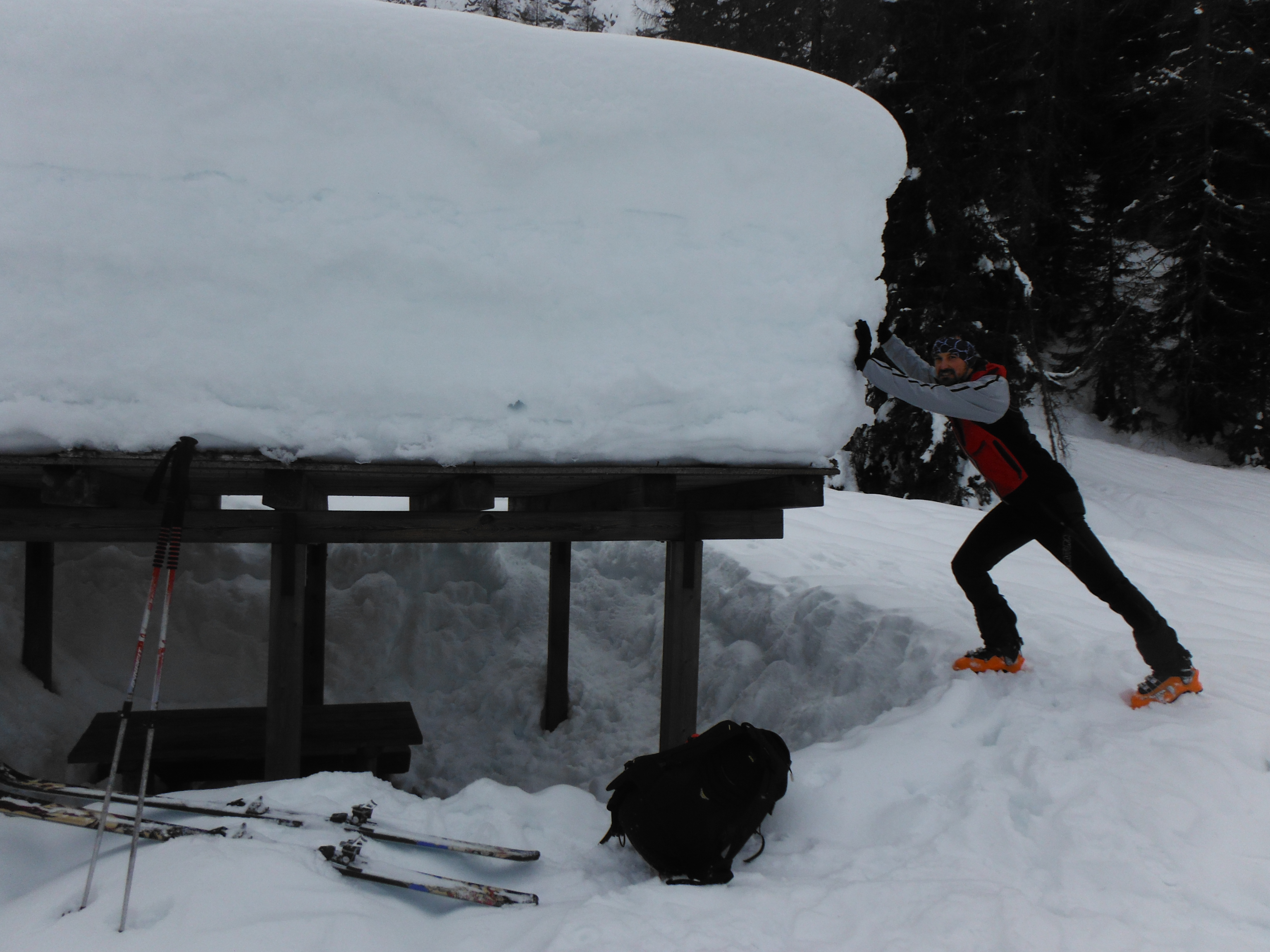 Neve ce n’è tanta, la struttura del gazebo presso il bivio regge, chi lo sa come..