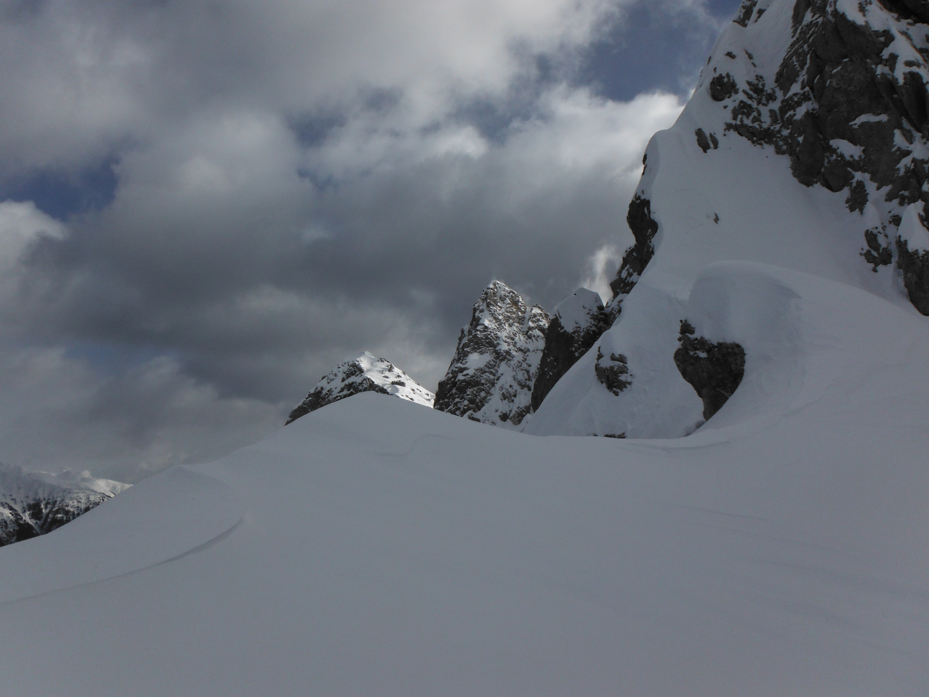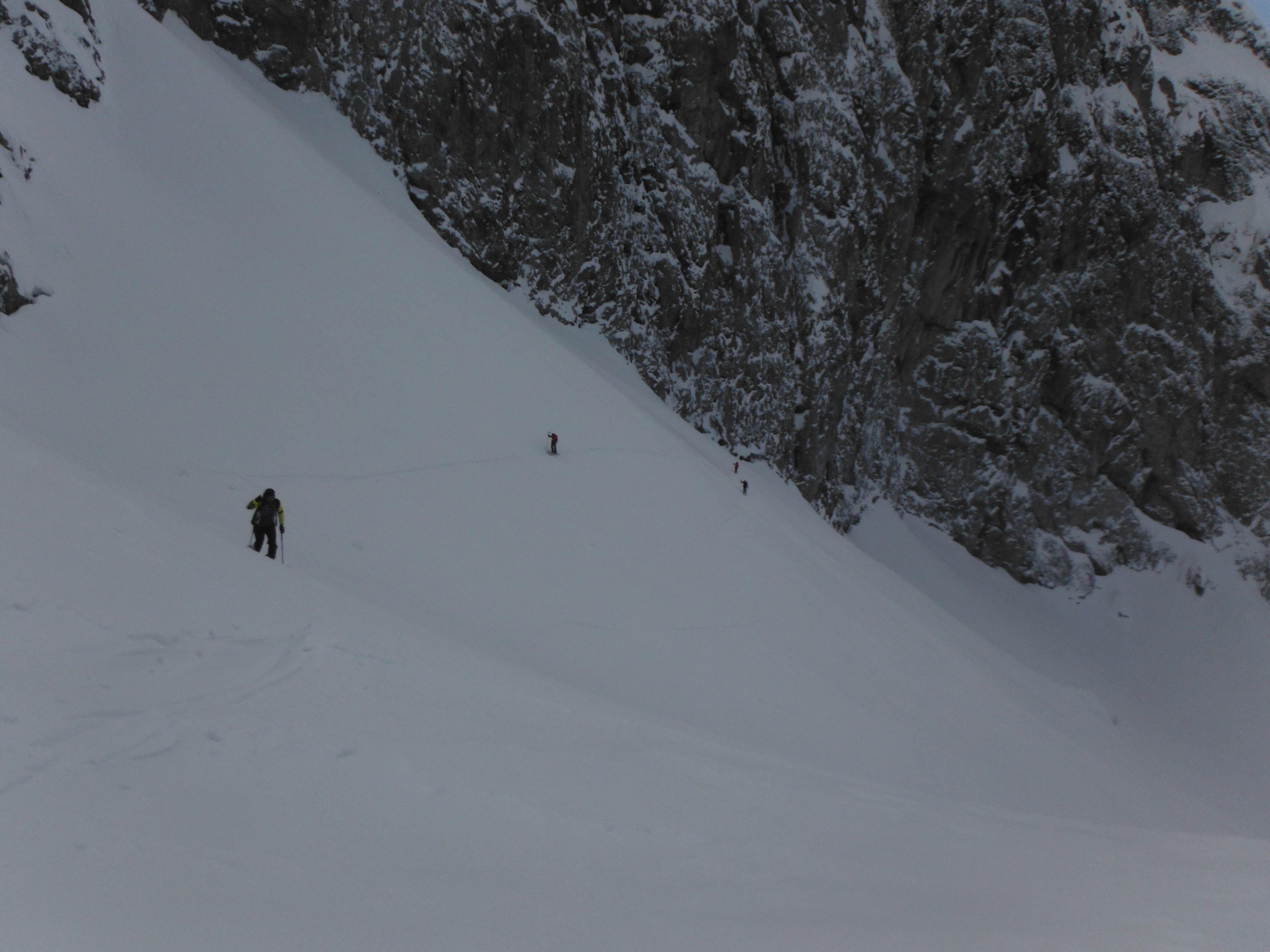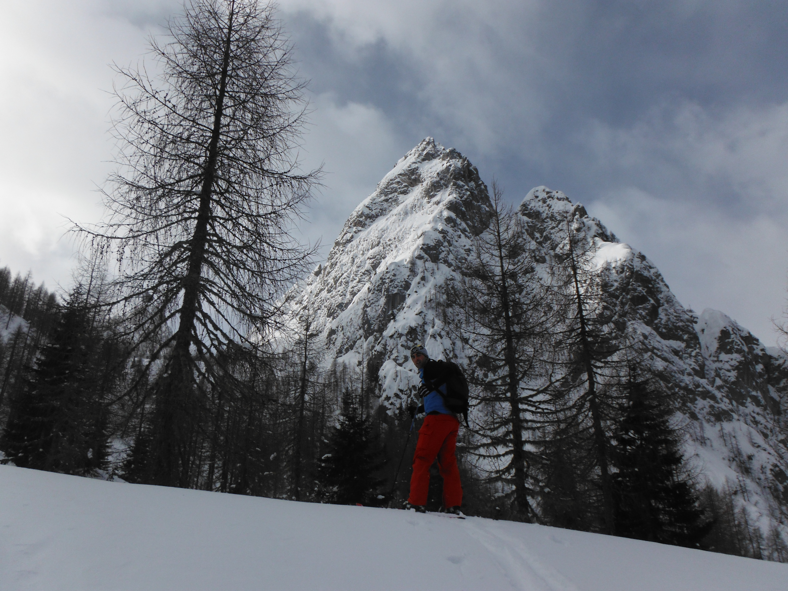Mi balza in testa un’idea di discesa, dimenticata in qualche angolo della mia testa, quel fazzoletto bianco ripido, visto tante volte scendendo da Sappada.. addirittura lo credevo essere il passo di Entralais qualche anno fa.. Perchè non provare a proporre agli amici di deviare e andarci? Da qui si comincia ad intravedere e lo spettacolo è piuttosto invitante tanto che non ci saranno esitazioni o obiezioni in merito.