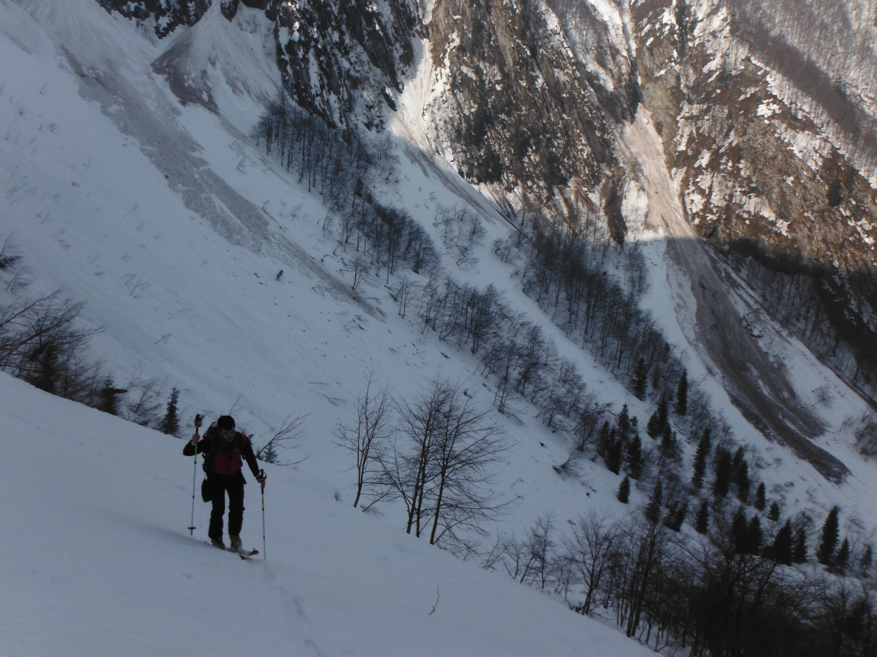 Da qua il canale si delinea, sulla sinistra, con pendenze crescenti verso la sommità. La vegetazione è stata coperta dalla tanta neve, condizioni migliori dell’anno scorso.