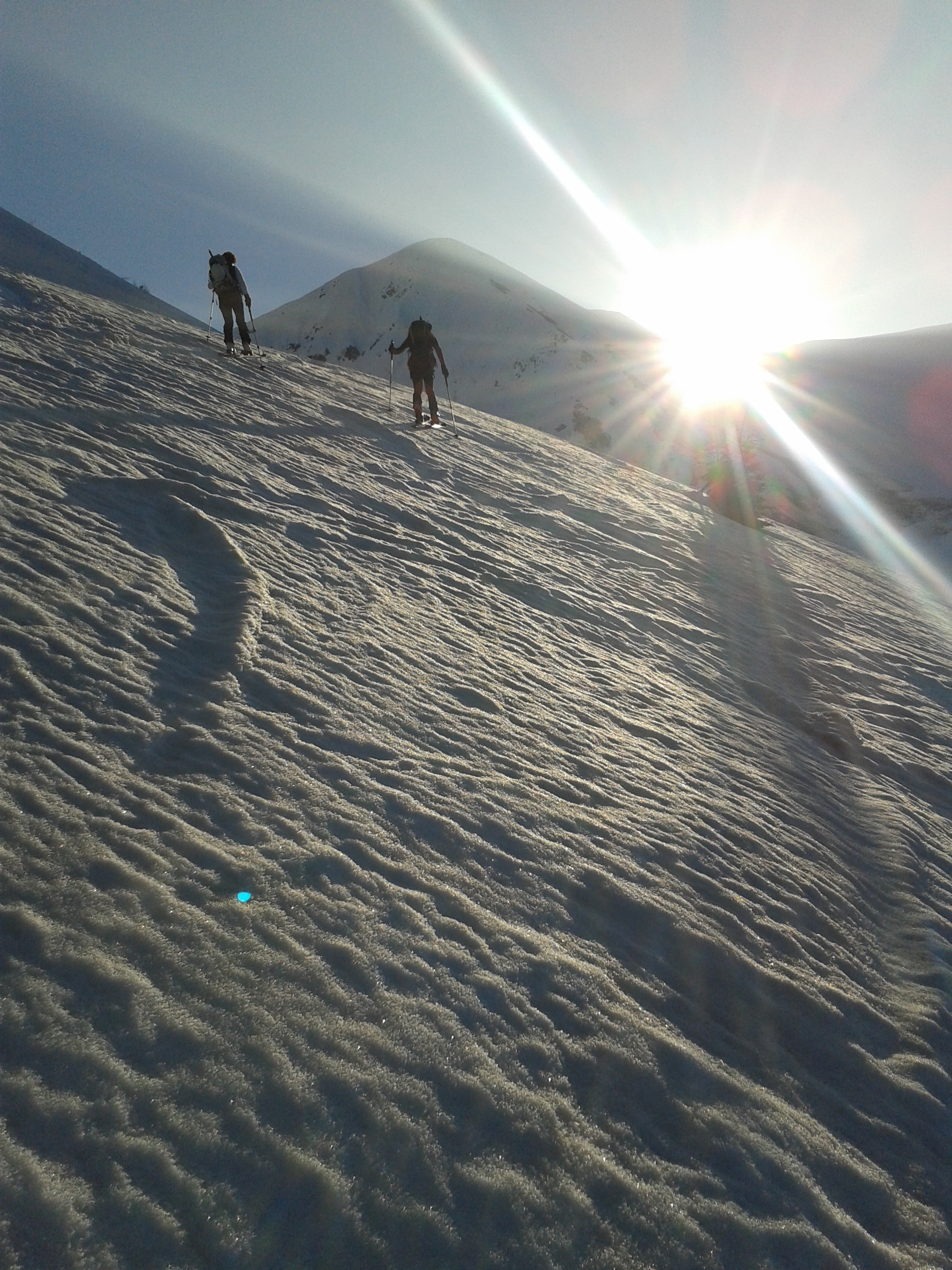 Procedo senza rampant, Cri li tiene. Max è avanti. La neve comincia a fare pappa e scivolare sotto le tavole al passaggio dell’ultimo, ossia io.