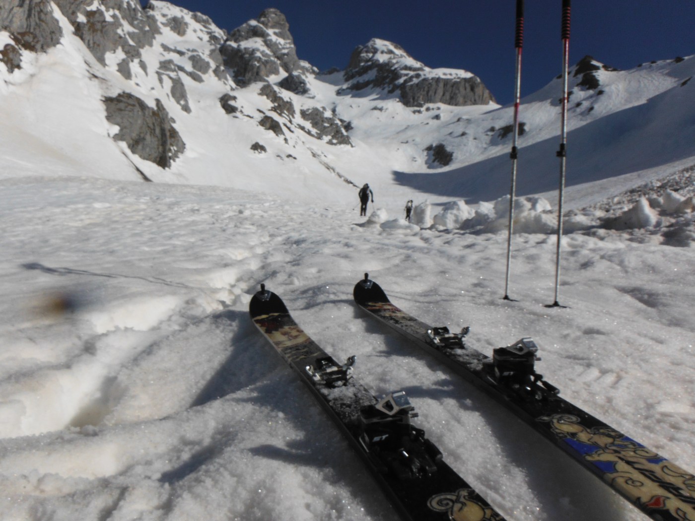 Gente scende dal Coston di Stella, mi pare di coonscere le voci, già in rientro alle 9?! Che mattutini, e poi la neve è bella dura ancora. Loro han dato, traversano verso la valanga e spariscono nel canale. Noi il “nostro” dobbiamo ancora farlo, il duro della Cima di Mezzo comincia più su, passata la barra rocciosa di forcella Monumentz si entra nel tratto ripido, almeno così dice la relazione che ho in testa. Non avendola mai percorsa prima posso solo immaginarmelo, da qui la cima si vede bene, solitaria testa di pietra e roccia a capo del vallone.