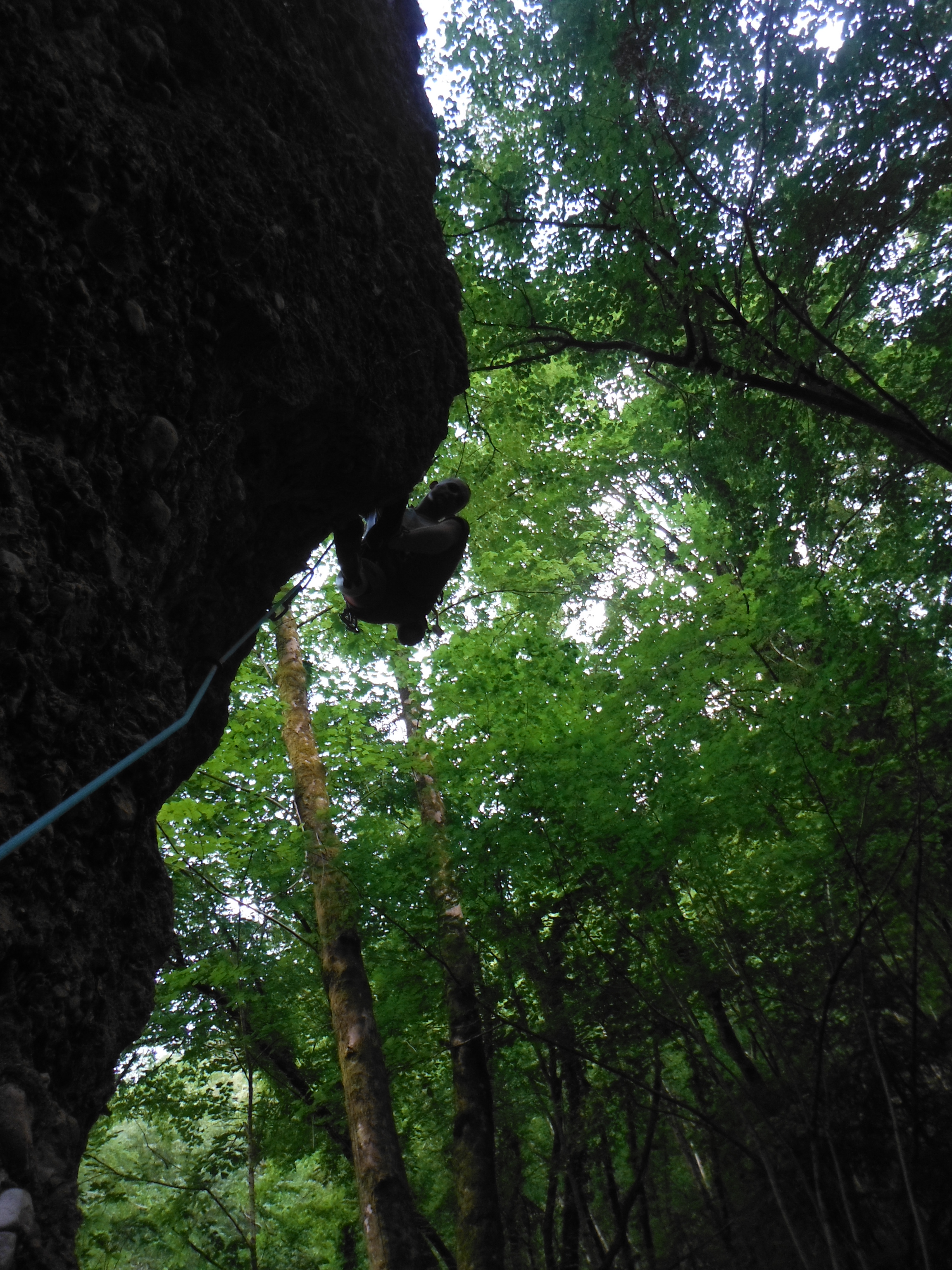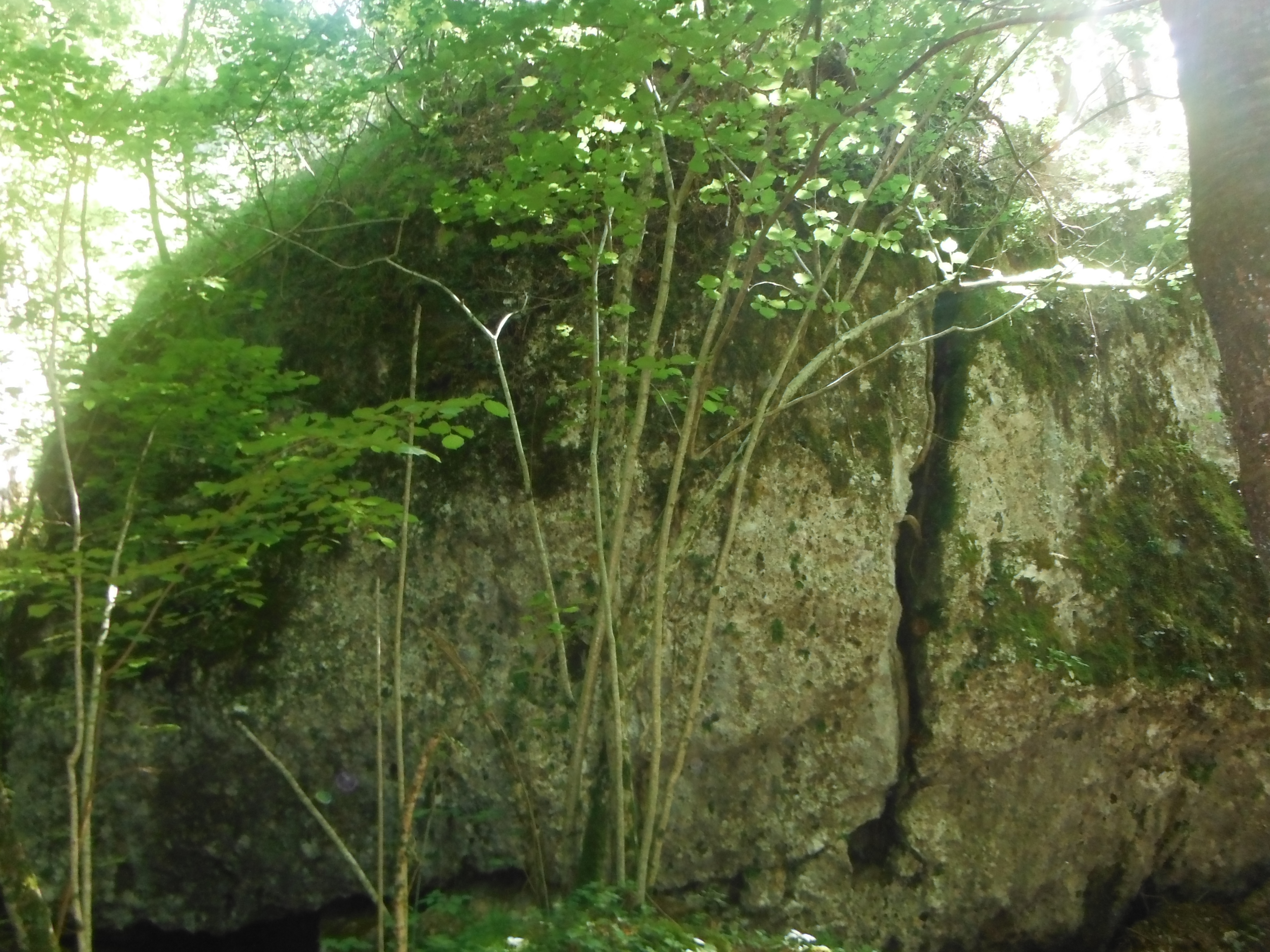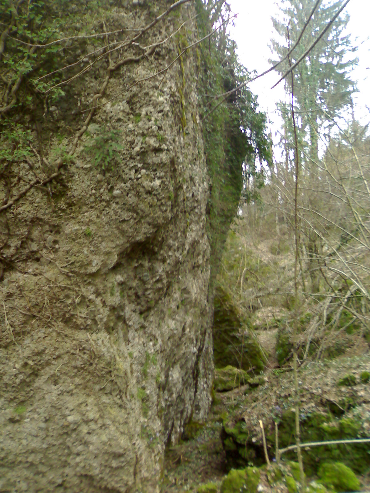 A dir la verità, a vederlo così, non mi lascia molto entusiasta ma poi giriamo l’angolo e già il versante Ovest prende quota, conglomerato strapiombante avvinghiato fino all’osso da grosse edere che dalla base della parete salgono su fin’oltre la parete. Il bello ha da venire e il colpo di scena si attua ai piedi del versante Sud dove si apre un ampio spazio e una parete che seppur di altezza non da capogiro potrebbe costituire di per se un bel posto per scalare. La parete tuttavia è quasi interamente tappezzata da un soffice muschio verde che ricopre tutto.. Ora sono piuttosto curioso di vedere cosa c’è nei dintorni, qua è tutto un fiorire di sassoni appoggiati, addossati tra loro a formare piccole grotte, scale di muschio verde, torri addossate a grossi alberi. Proprio un bel posto, non c’è che dire!