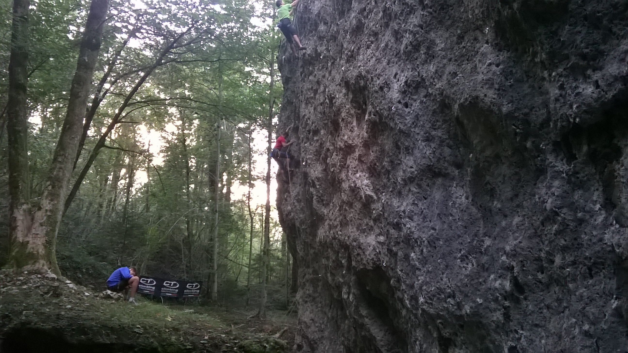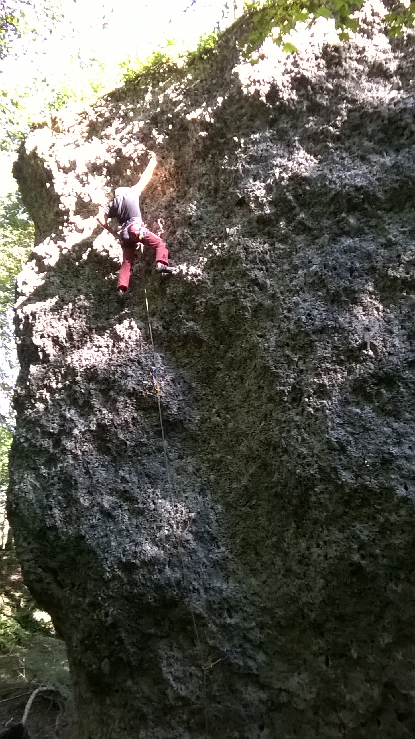 Torniamo al masso principale, per un OK su tutto il fronte con la promessa di cominciare i lavori all’approssimarsi della bella stagione. Le giornate passano e i lavori procedono grazie soprattutto a Manuel che si impegna a fondo nella pulizia del sito, nel domandare il permesso ai proprietari, nel pulire il sopra e il sotto dagli arbusti, le pareti dal muschio e dalle tenace edera che stringe il lato Ovest del masso, insomma – si fa un mazzo così! Tanto che al mio ritorno sul posto, per contribuire alla pulizia dei tracciati, quasi non riconosco più quello che fu oramai un masso verde lontano dal verbo arrampicare. L’ha tirato a lucido passando le mattine appeso a pulire buchi, tacche e quant’altro.. A me non resta che indovinare i tracciati, pulirli un pochino e chiodare il tutto sfidando la primavera monsonica di questo 2014.. Ora che i lavori sono terminati posso dire che ne è valsa la pena e se i frequentatori futuri apprezzeranno sarà valsa ancora di più! Manuel non ha fatto mancare nulla per il popolo dei climbers: striscia di ghiaia larga un metro dalla parete per non sporcare le scarpette, tutto rastrellato, gradini per salire al pulpito fronte-parete ed erbetta da prato inglese seminata nei dintorni, insomma, un grande! Conferma delle mie valutazioni positive mi viene data una mattina di maggio quando convinco una guida alpina a vedere il posto in cui sto lavorando… Positivamente colpita apprezza il tutto e si augura anche la pulizia/chiodatura del lato E del masso. Per ora ne abbiam “piene le sporte”, come si suol dire, ma non è detto che in un futuro prossimo si possa attrezzarla assieme agli altri sassoni delle vicinanze. Ad avere voglia, inoltre, il circondario nonchè il lato N del sasso potrebbero esser terreno fertile per il bulder e la tribù dei crash pads.. Con oggi la spazzolatura generale dei monotiri è terminata, è chiaro che le vie devono pulirsi con la frequentazione dei climbers per cui consiglio un pò di pazienza ai maniaci della pulizia delle prese e se porterete uno spazzolino appeso all’imbrago, perorate la nostra causa! Ci vediamo al Giardino dei clapons…