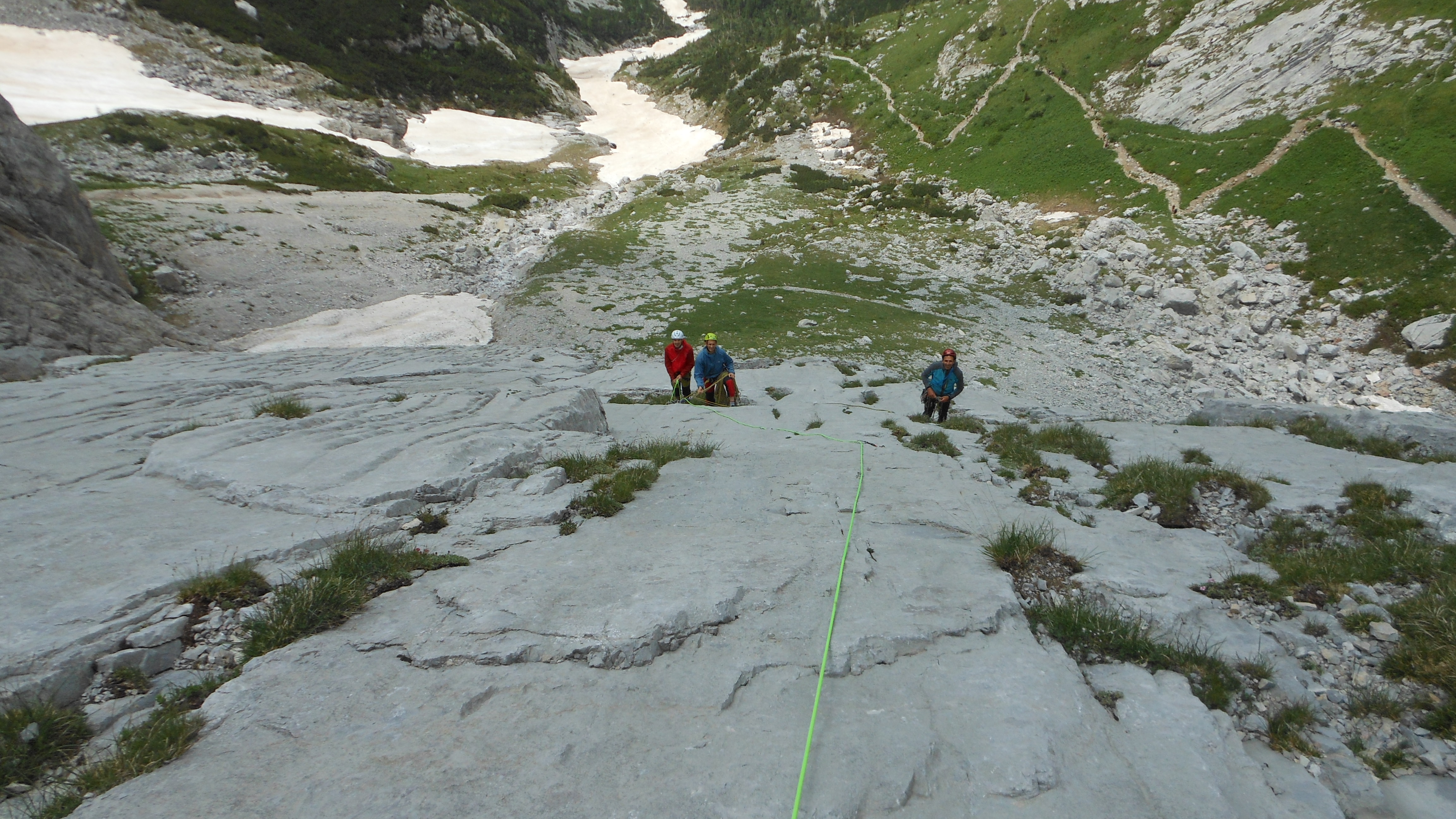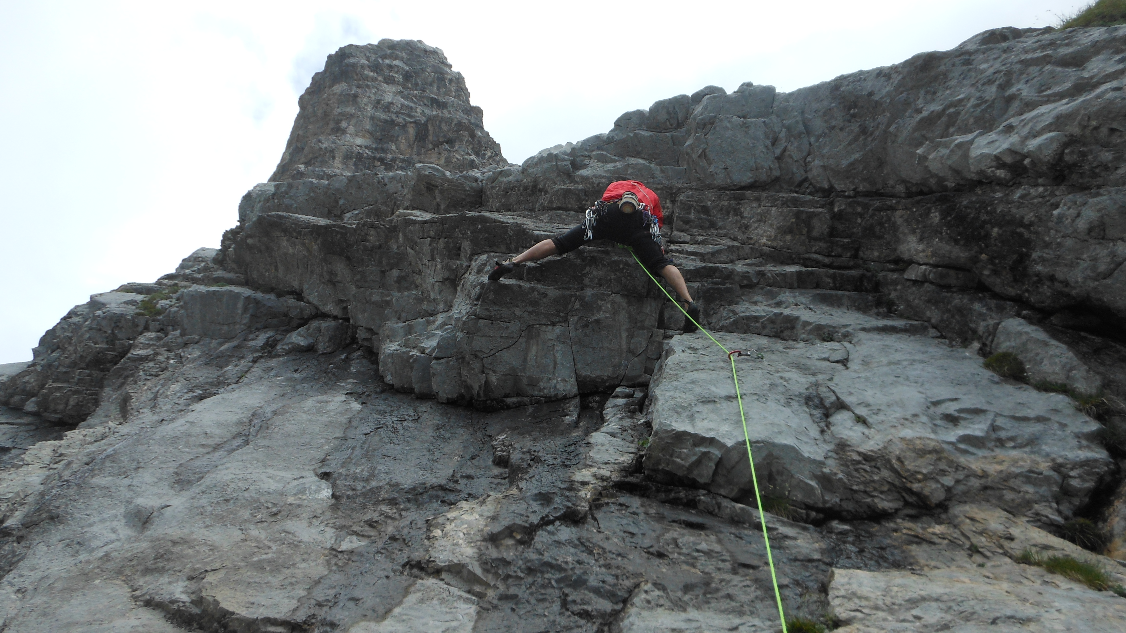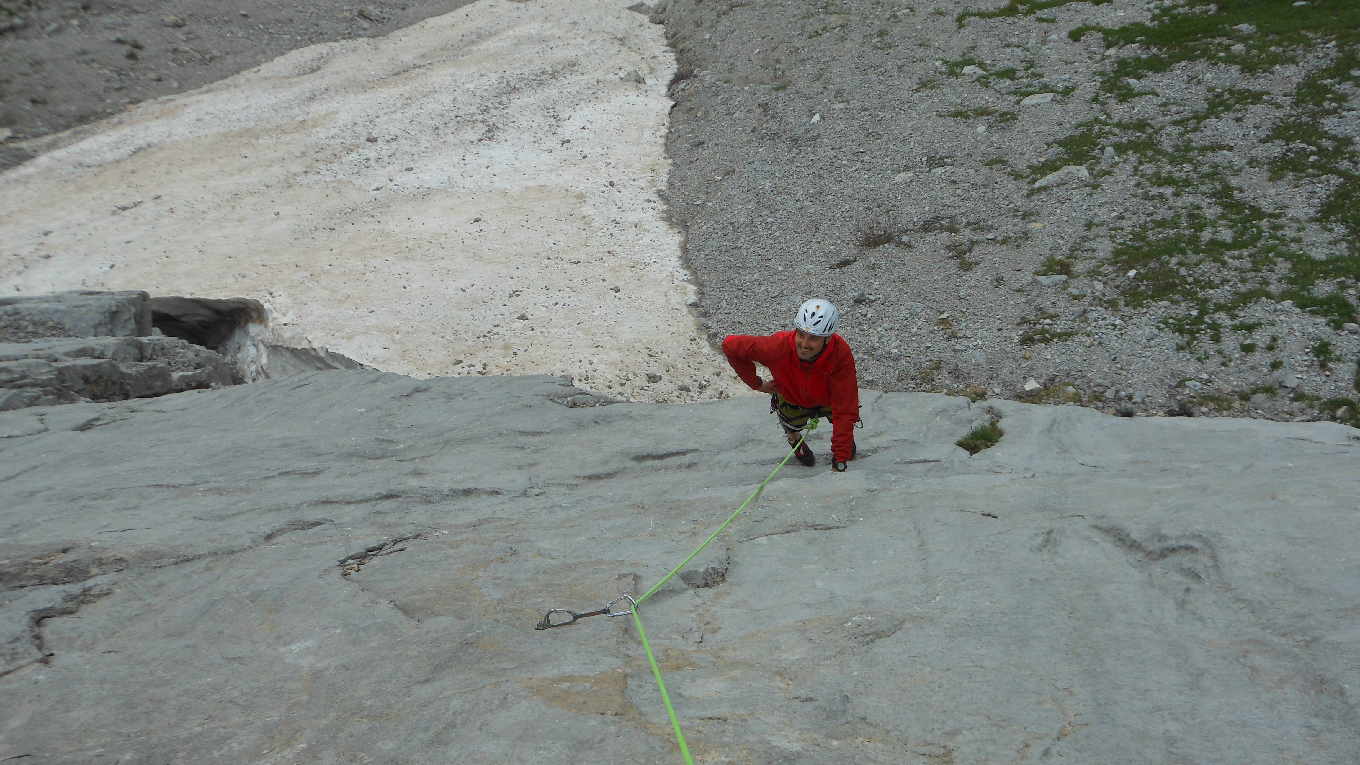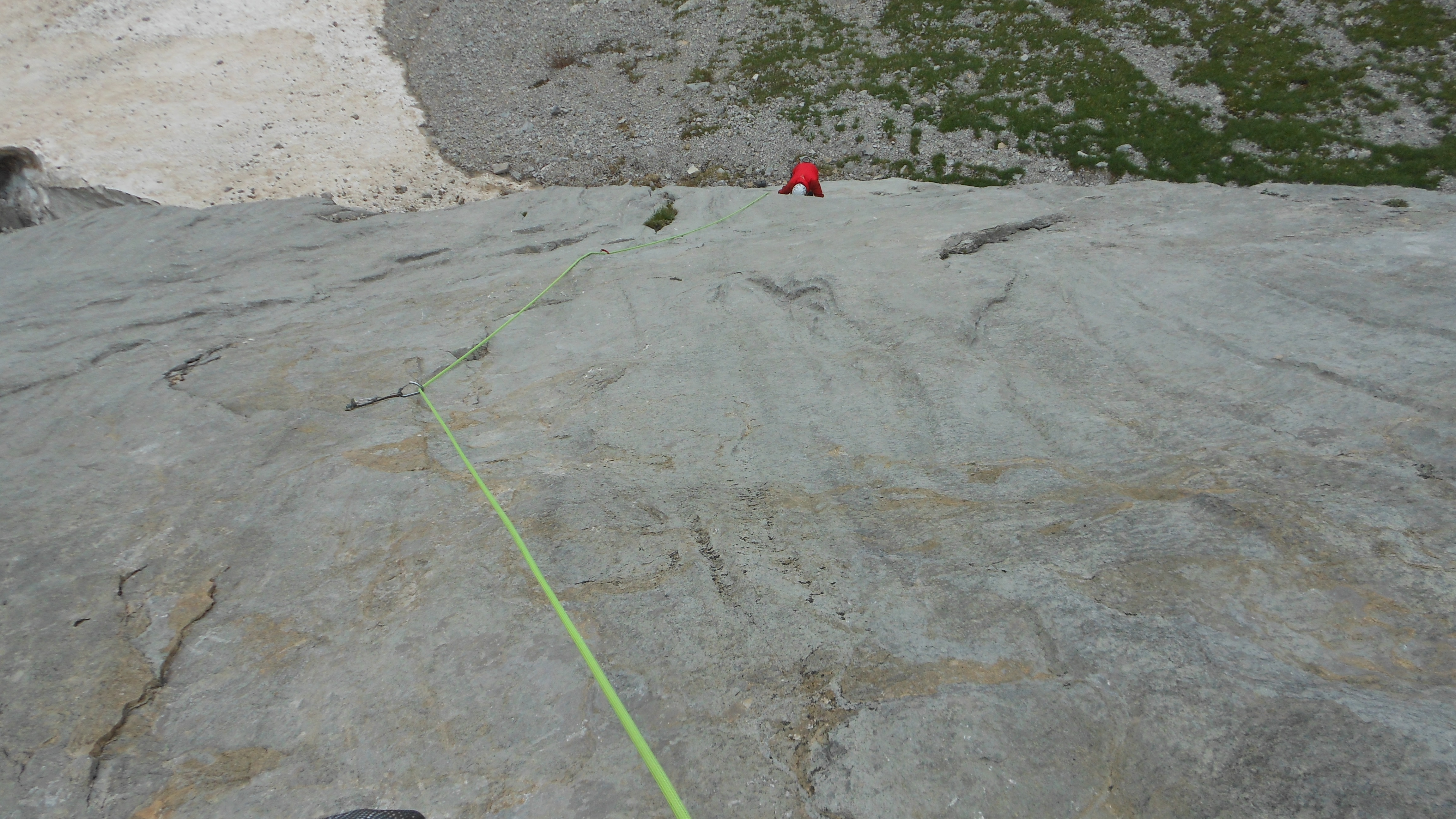Attacco la via “Alessandra”. 4 lunghezze con un passaggio chiave di 5c o A0. Mi legherò con Luca mentre gli altri saliranno “il Valzer delle tartarughe” più a sinistra.