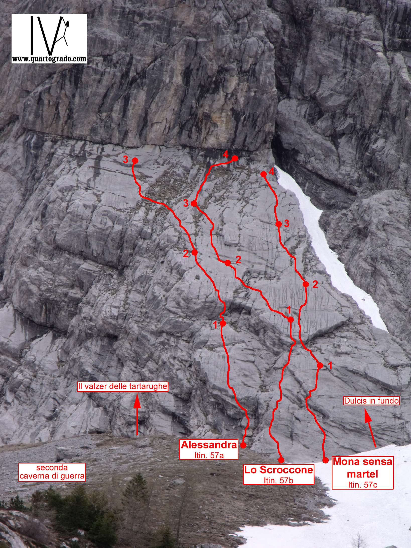 In questo settore le vie presentano 4 lunghezze di corda e grado massimo di 5c – prevale comunque il grado 4.