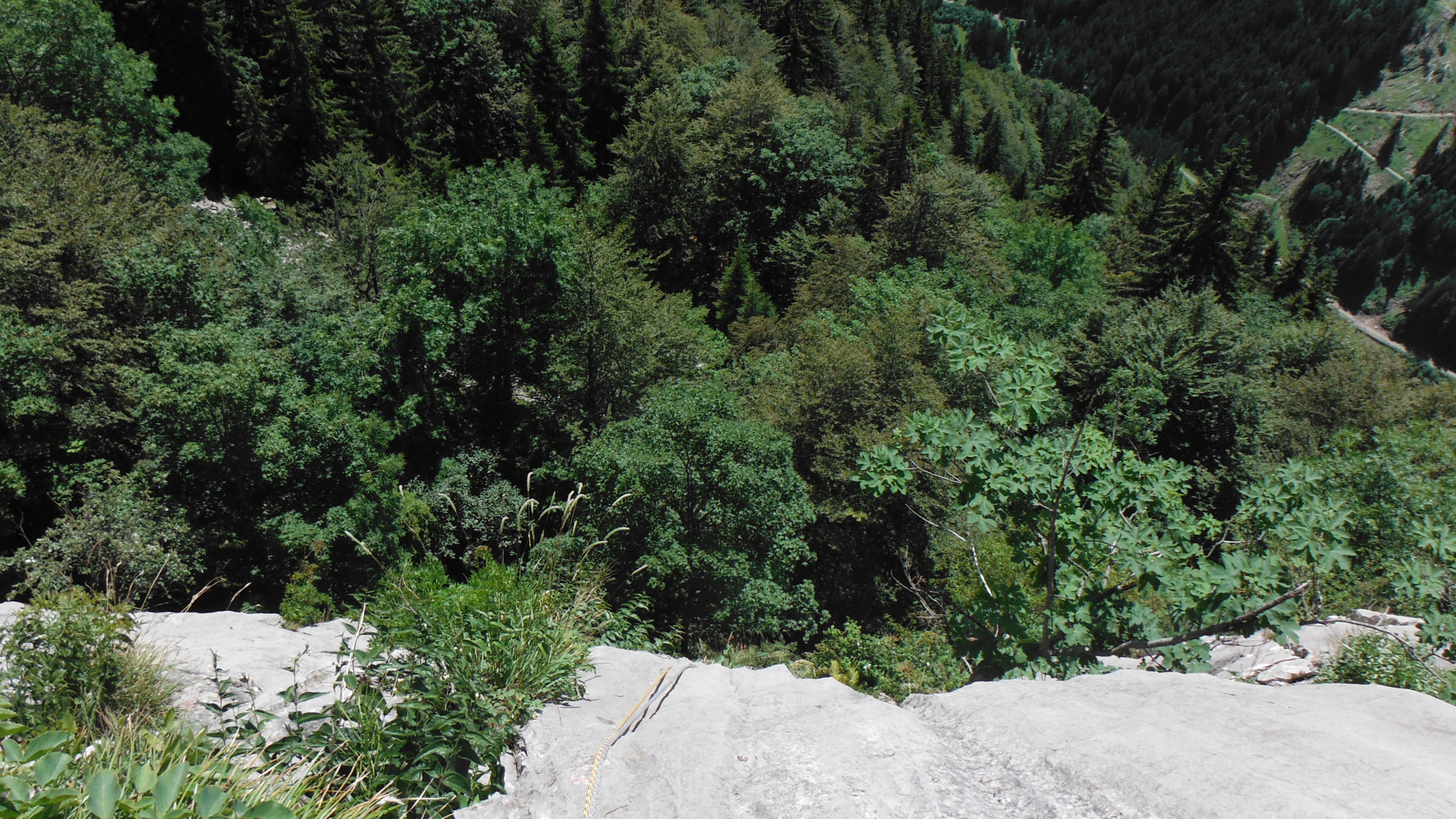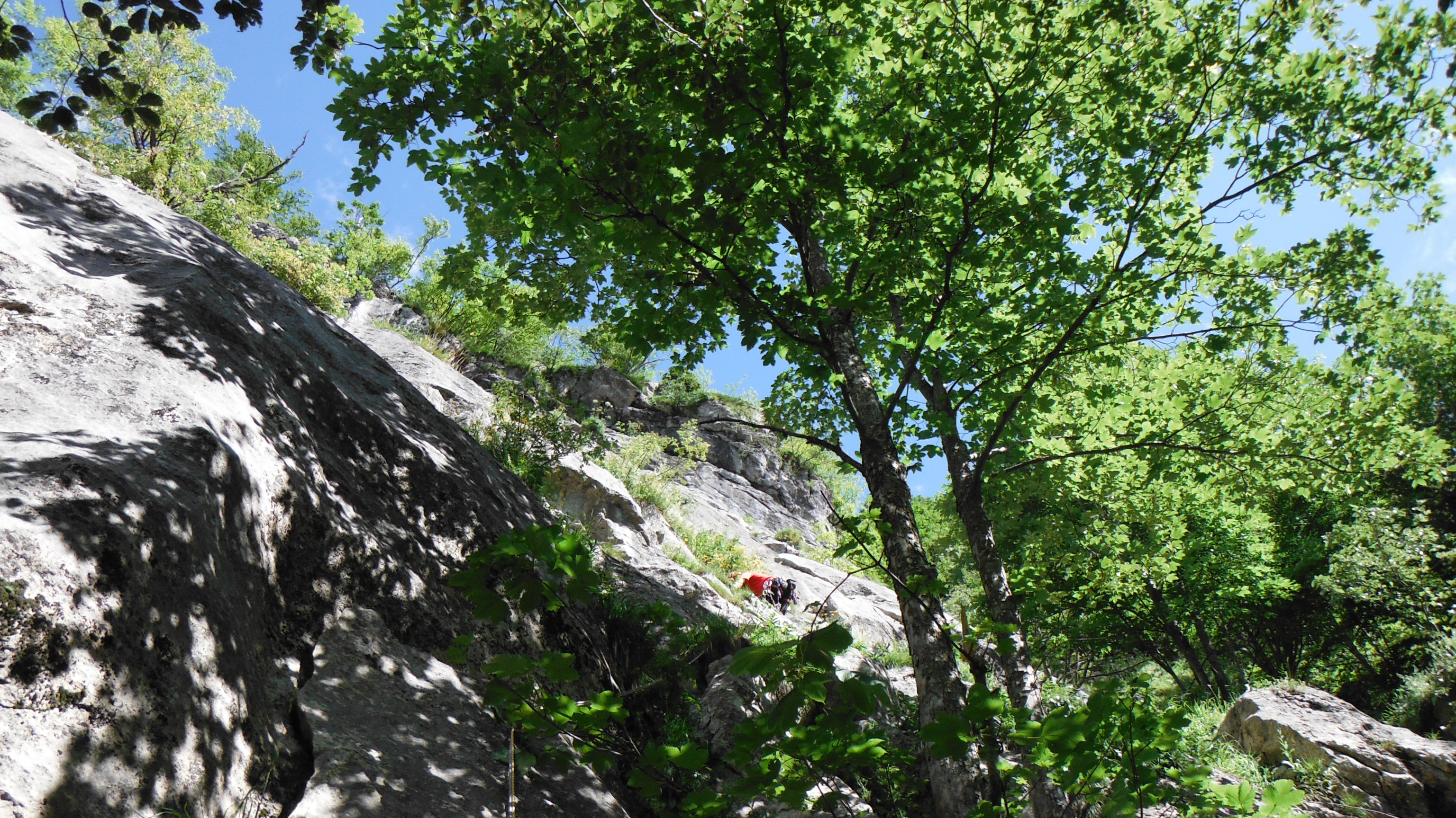 Oltre non si vede nulla, solo la fascia di strapiombi alla sommità di questa porzione di parete, di lì non passiamo di sicuro. Verso sinistra tuttavia pare esserci un accenno di terrazzino, dovremmo passare di là ma l’ipotesi renderebbe di fatto impossibile rientrare a corda doppia alla base. Concordi decidiamo di alzarci un pò per valutare meglio. Riparte N, altro passaggio serio, ci mette un pò ma poi riesce a prendere la maniglia in alto a destra per issarsi fino alla sosta successiva in un terrazzino che sembra fatto apposta.. Non ci fosse stato l’attrito probabilmente il primo tiro finirebbe qui. Altra sosta a chiodi e, salito anche io con i miei soliti fastidi odierni, scambiamo 4 chiacchiere.. E’ tardi e oltre lo spigolo c’è l’ignoto.. Decidiamo per la ritirata a doppie per ritornare una volta binocolata la parete dal fondovalle, per capire effettivamente la possibilità di passare verso sinistra. Mentre N si gode il panorama preparo la calata. Saranno 45m di discesa in mezzo ad un mare di calcare perfetto, una struttura che merita di diventare qualcosa di più che una parete semisperduta nel bosco..