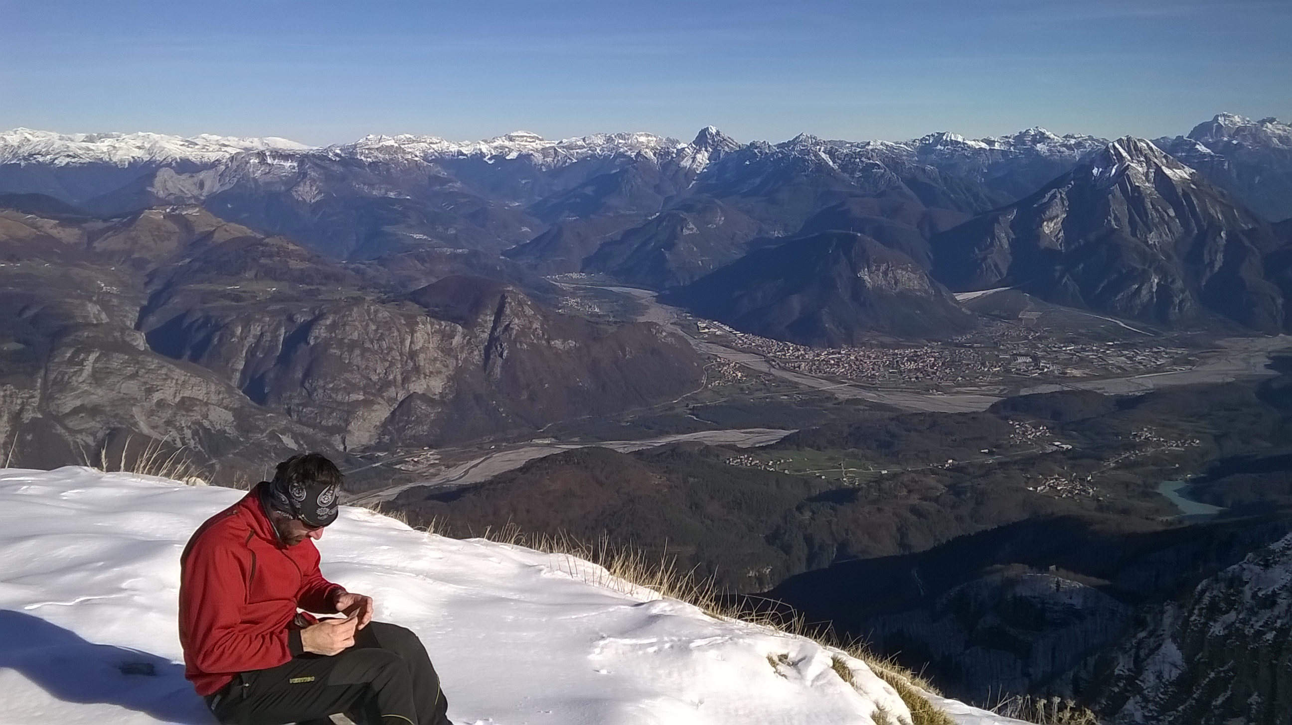 Da qui il panorama si fa incredibile, il gruppo del Lovinzola gode di un punto di vista unico su quanto sta attorno ai versanti Ovest, Nord ed Est. Il Tagliamento ha fatto il suo e le valli distanziano il gruppo da quelli “vicini”, pare stesa davanti a noi la cartina della Carnia. Dall’altro lato, un pò offeso ed altezzoso, il Piombada ha una dignita che non avevo mai considerato. Con Max ripercorro nei ricordi la sciata della scorsa stagione. Visto da qua il picco finale è un triangolo bianco che punta dritto al cielo, con i paravalanghe sommitali a delinearne le criticità.. Bei ricordi, immagino che gli sci alpinisti che abbiano nel curriculum questa cima siano pochissimi, ovviamente non per la difficoltà ma per non essere la classica da inserire nelle guide.