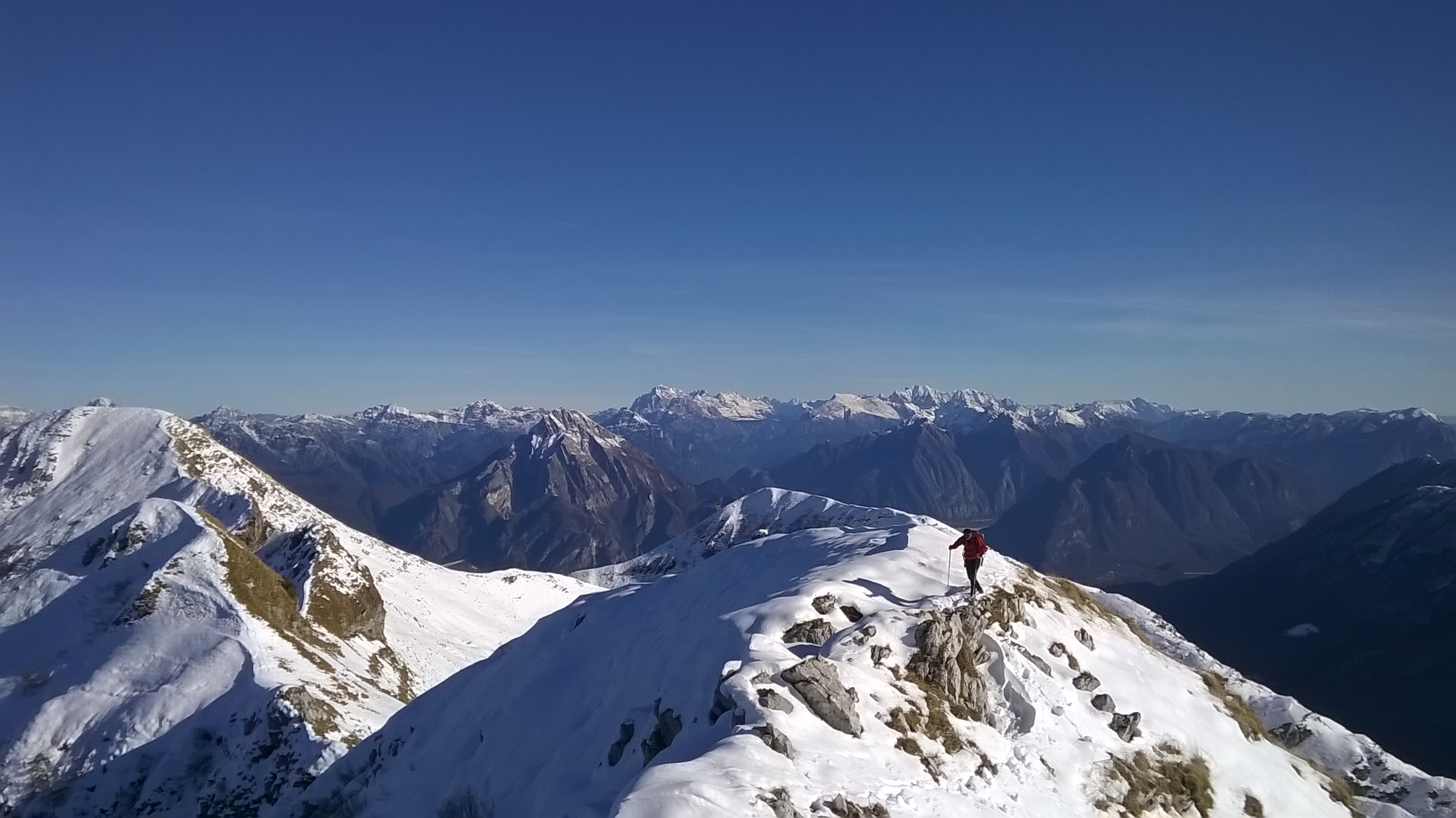 Ora non ci resta che percorrere la displuviale sul filo di cresta, tra cime più alte e bernoccoli appena accennati. Verso Ovest l’andare si fa pù guardingo sebbene a terra la neve fresca non imponga l’uso dei ramponi e nelle mani bastino i bastoncini a dare stabilità.