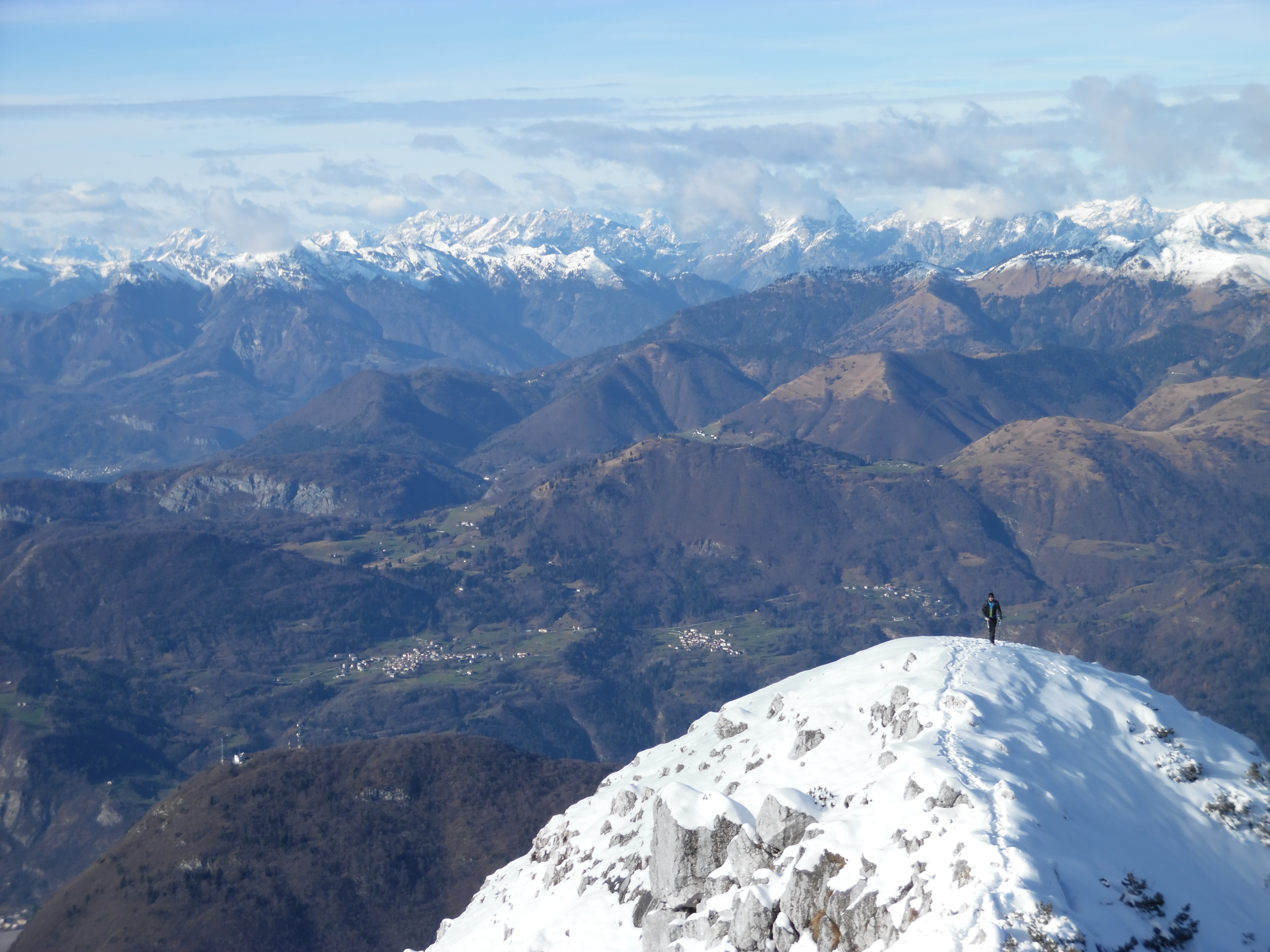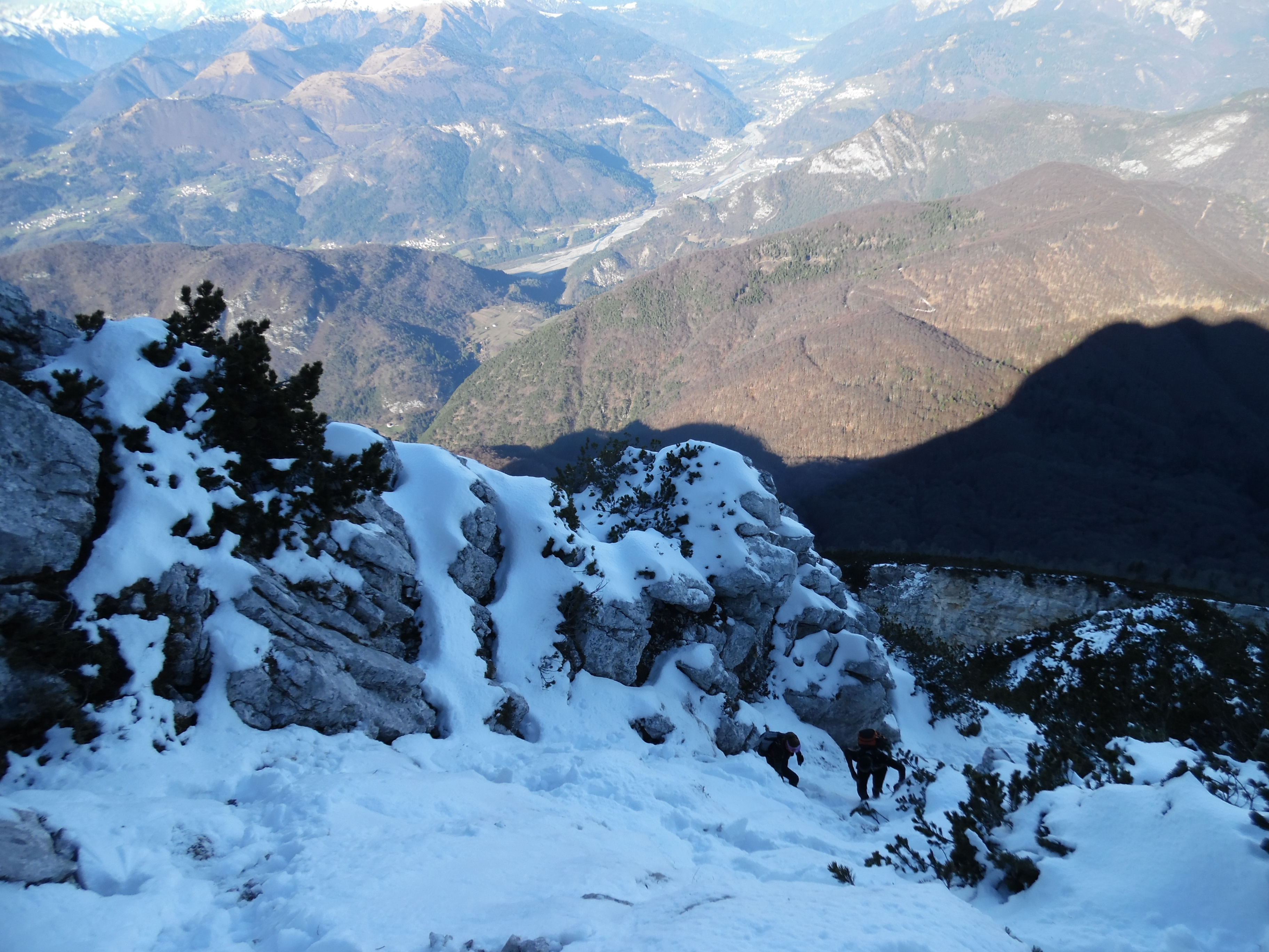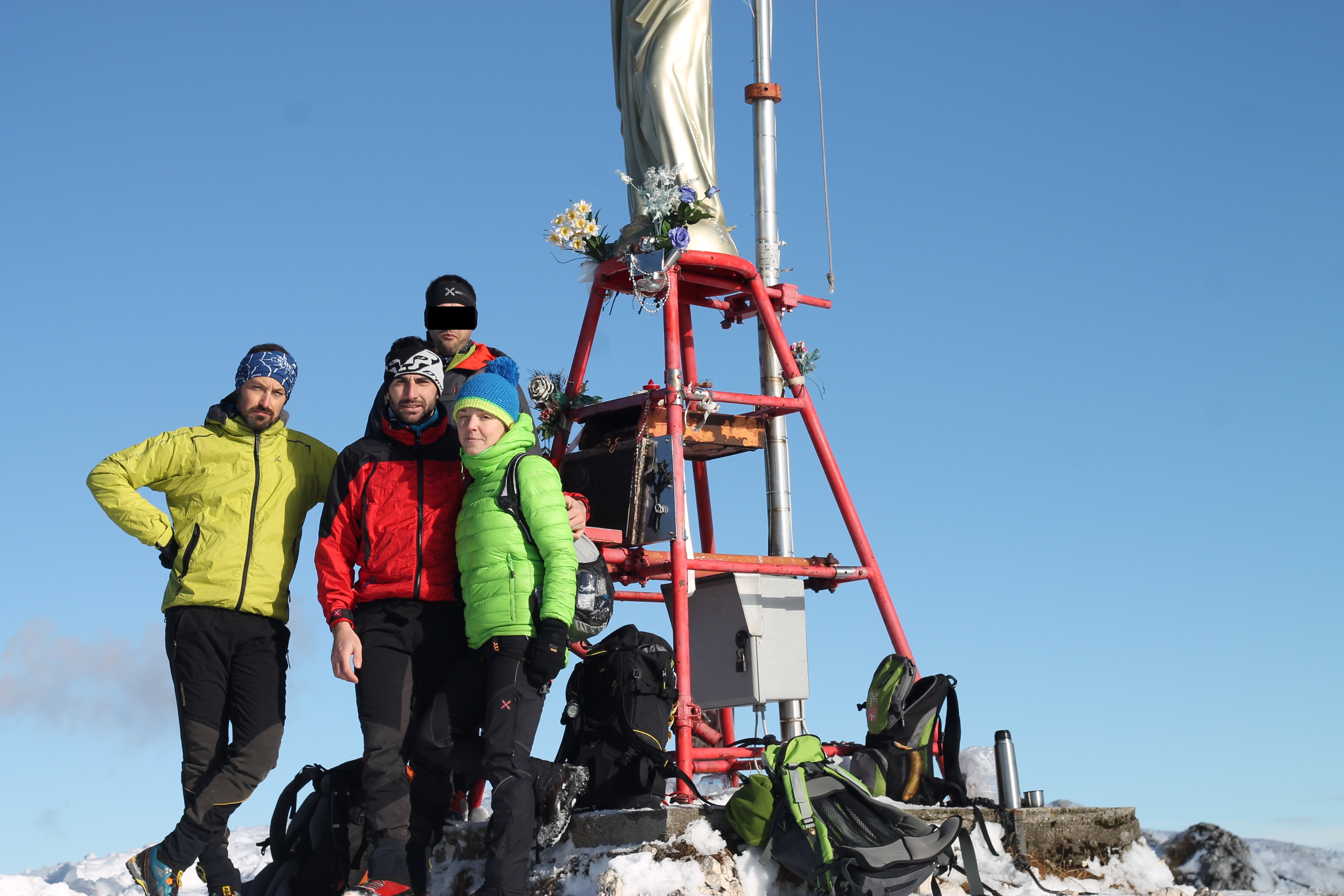 Niente di troppo complicato seppur sufficiente per un paio di amici della comitiva che oggi provano quest’esperienza “invernale”. Sul primo tratto ripido è presente un tondino di ferro che fa da guida, ne deve aver viste parecchie a giudicare dall’età apparente. Poi attrezzature recenti tolgono ogni pensiero e procediamo sulle tracce dei passaggi precedenti. Lo spessore della neve va aumentando, di ramponi non se ne sente la necessità. La parte alta è una pista di bob tra rocce e mughi che va salita fino al sole invadente che giunge da Sud e che ti coglie a breve dall’antecima, all’uscita del sentiero Dalla Marta, oramai in vista delle persone che soggiornano sulla cima e dei rintocchi della conosciuta campana di vetta.
