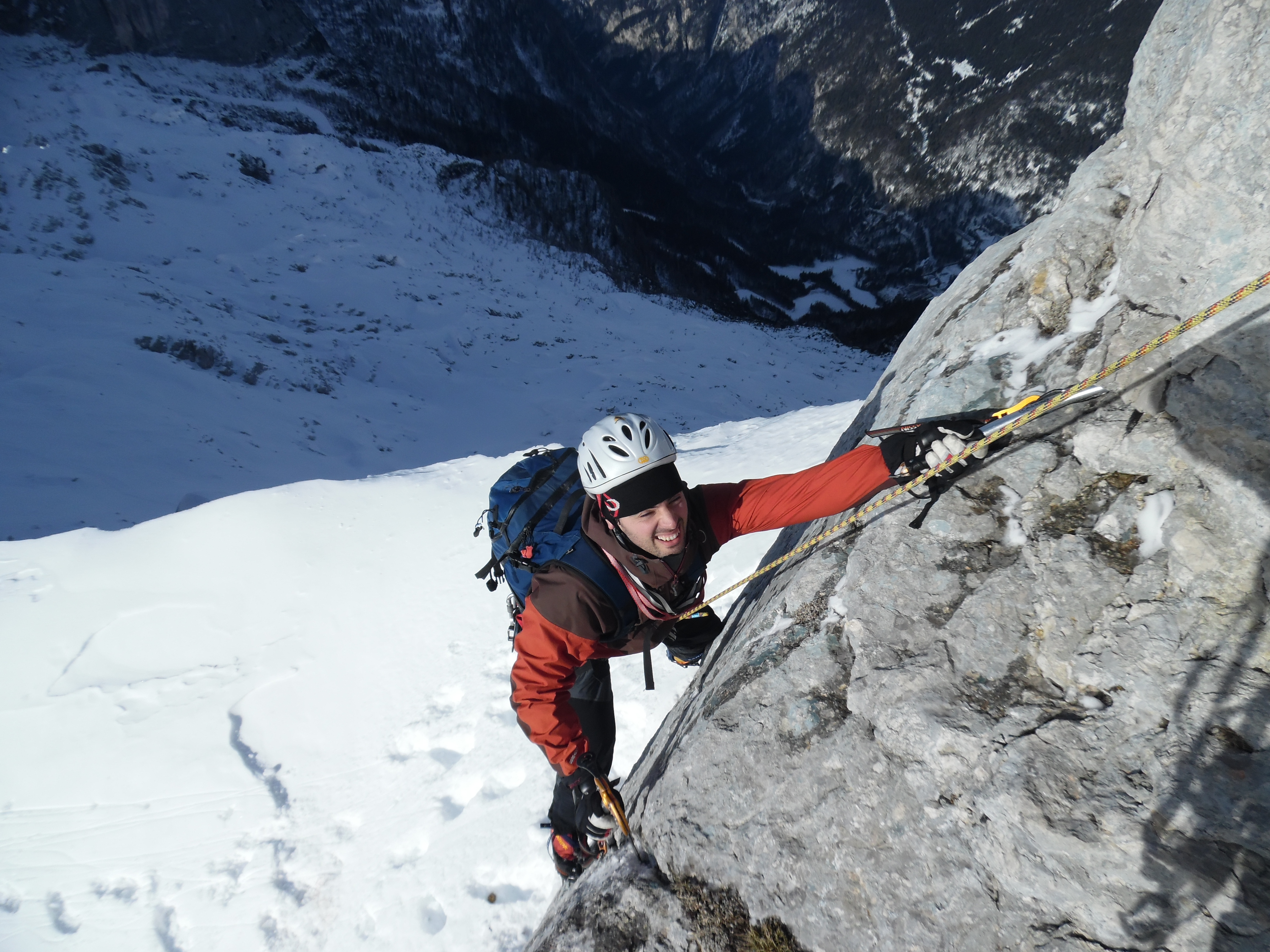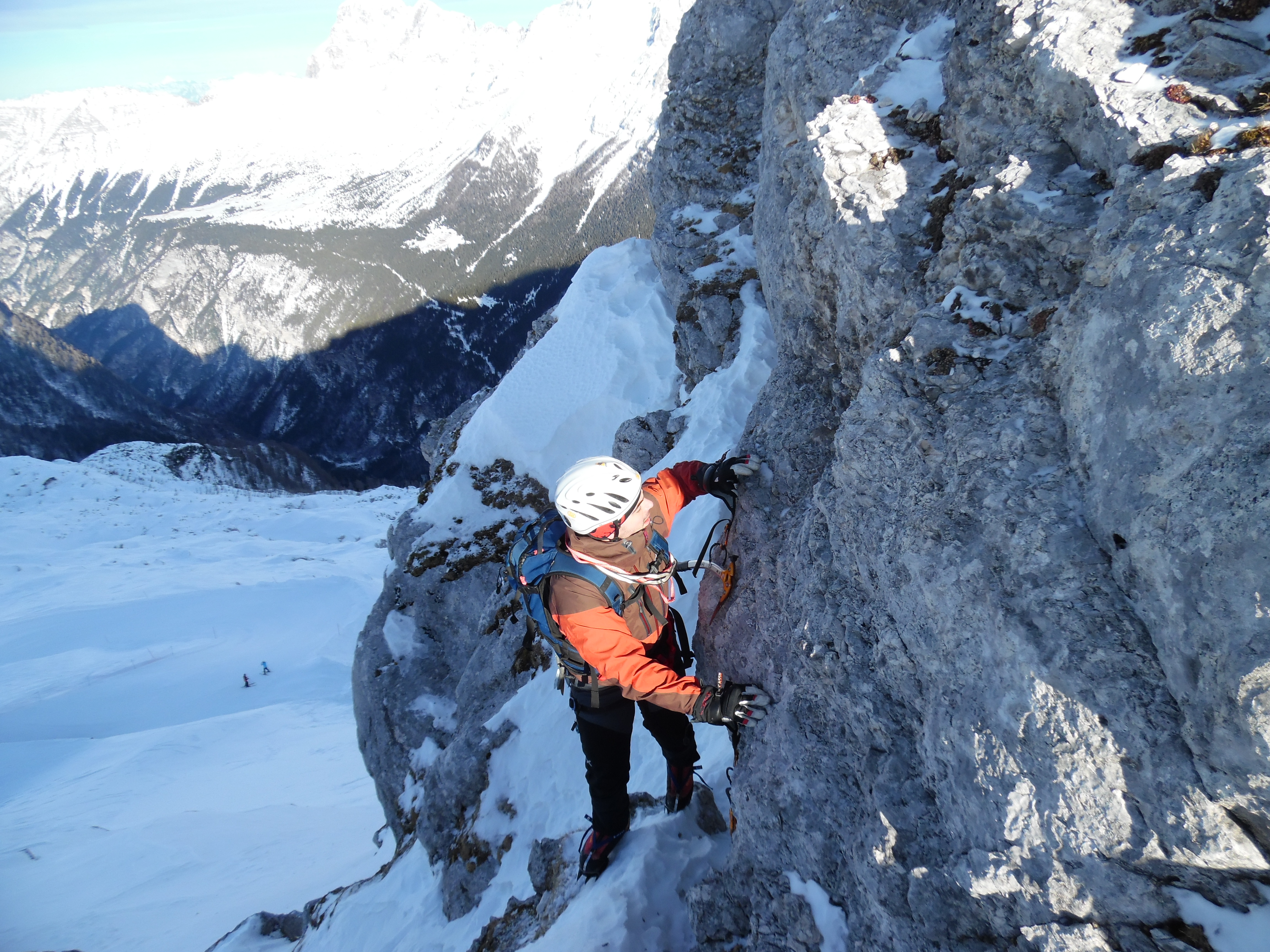 Procediamo con la corda filata a mò di ghiacciaio ma nel tratto successivo è meglio svolgerla. Una ventina di metri semi verticali con 2 spit impongono di proseguire con cautela visto anche il terreno un pò marcio di roccette che tendono a restare in mano. Il Pelle sale tranquillo, prosegue oltre la placchetta inox più lontana e dopo una quarantina di metri mi urla l’ok alla salita. Recupero il frend messo, un appiglio mi resta in mano e mi fa perdere per un attimo l’equilibrio, benedetta corda, e poco dopo raggiungo il Pelle nel suo nido d’aquila e procediamo. Guardiamo con sospetto la mole della cima che si para davanti, se quello è il Golovec le tempistiche indicatemi dall’amico non mi tornano, o siamo lenti noi o sono stati delle schegge loro. Nel dubbio proseguiamo e chissà perchè mi incaponisco in un passaggio che chiamerò “il muro sbucciaramponi”: una placca liscia, alta circa 2,5m e rigata da numerosi passaggi di ramponi si para davanti e, di primo acchito, pare insuperabile. Il passaggio sarebbe velocemente evitabile scendendo una cengia verso destra e risalendo poi il canalino accennato retrostante ma questo passo, su cui vigila ben in alto uno spit, me lo prendo come sfida personale. Per evitare disgrazie, dopo 5 minuti di ricerca, trovo finalmente la fessura buona per un chiodo universale attaccato al quale il Pelle con espressioni perplesse vedrà il sottoscritto arrivare al limite con prestazioni circensi. Primo tentativo, rampone sx su tacchetta, destro in spalmo su svaso, picca dx di punta in un buchetto e picca sx che vaga in cerca di qualcosa… Rientro sui propri passi. Tentativo secondo, prima della completa lessatura dei bicipiti, con estro suggerito dal compagno riesco a ficcare in appoggio la picca sx in un buco alto, ad alzare per un millisecondo il rampone e, prima che questo scivoli, a buttare il ginocchio al di là “del muro”. Una faticata mostruosa per 2,5metri di parete ma tronfio recupero l’amico che sale assicurato alla piastrina e saranno anche per lui “cavoli amari” (probabilmente con 50cm di neve in più la cosa si risolverebbe in maniera alquanto facile).