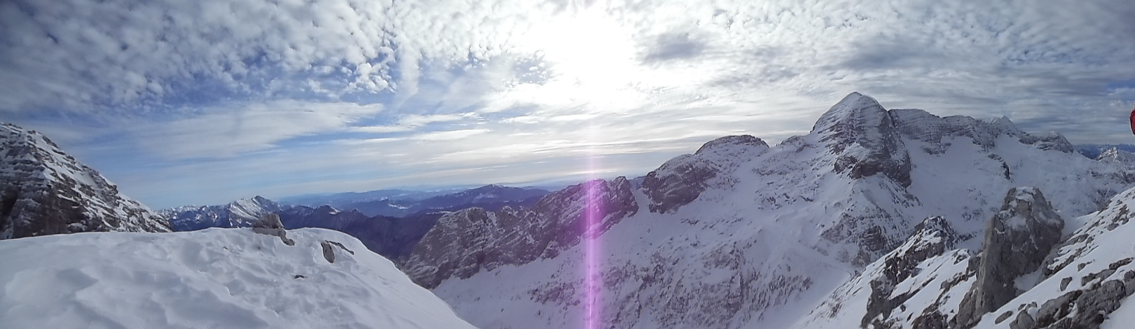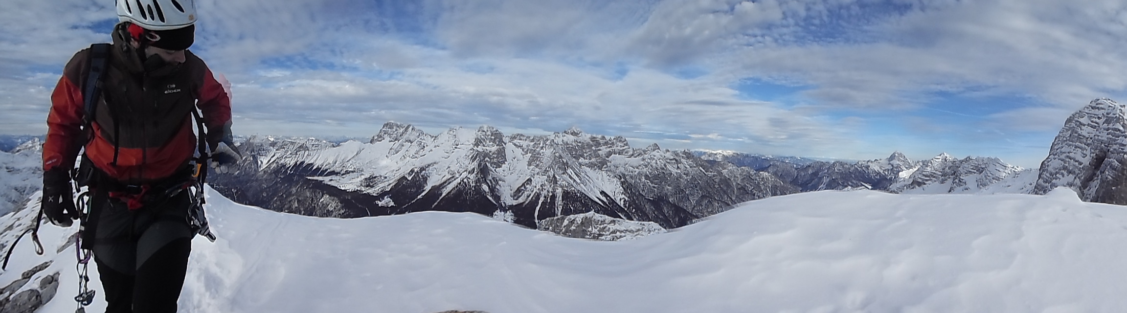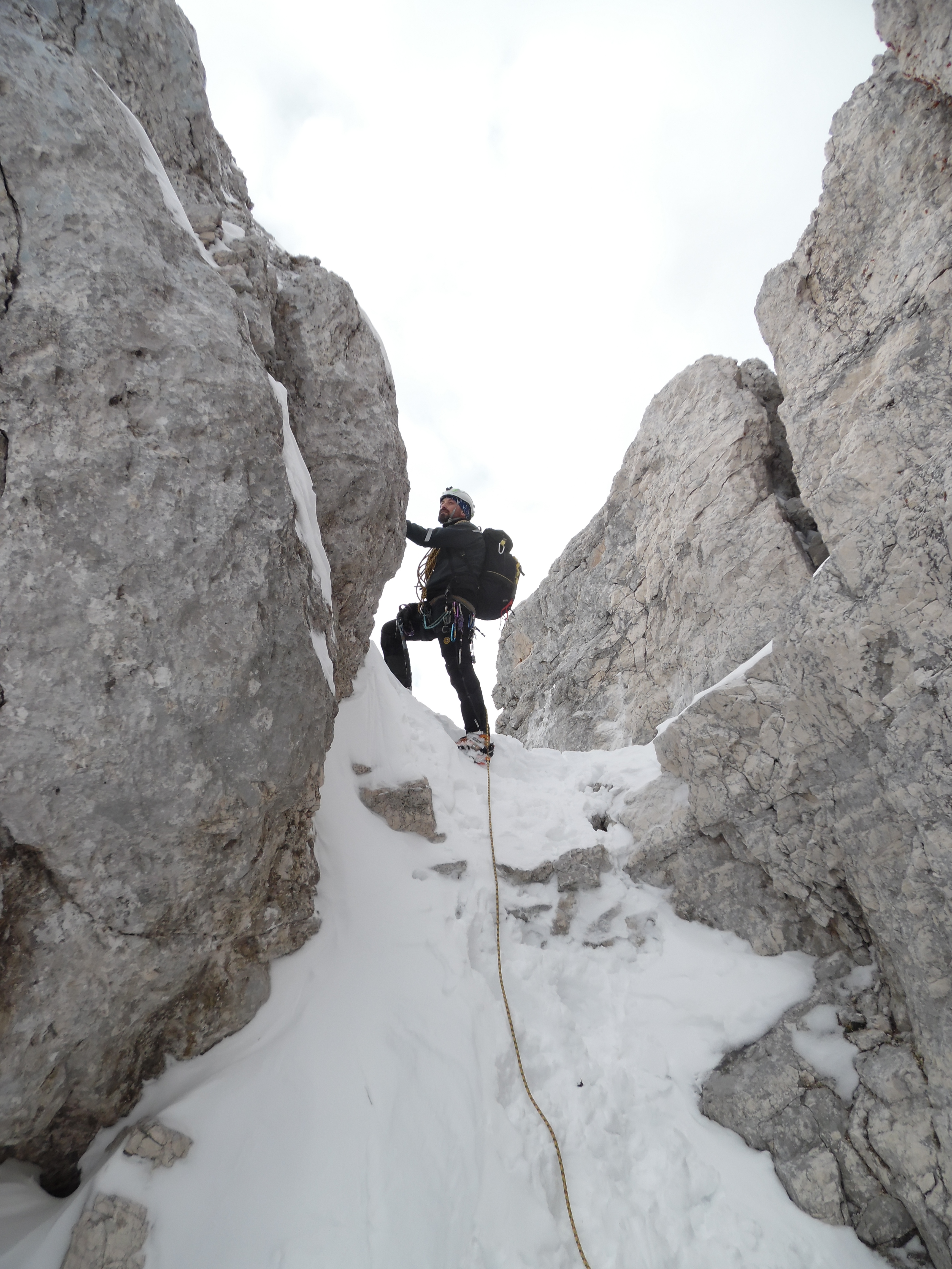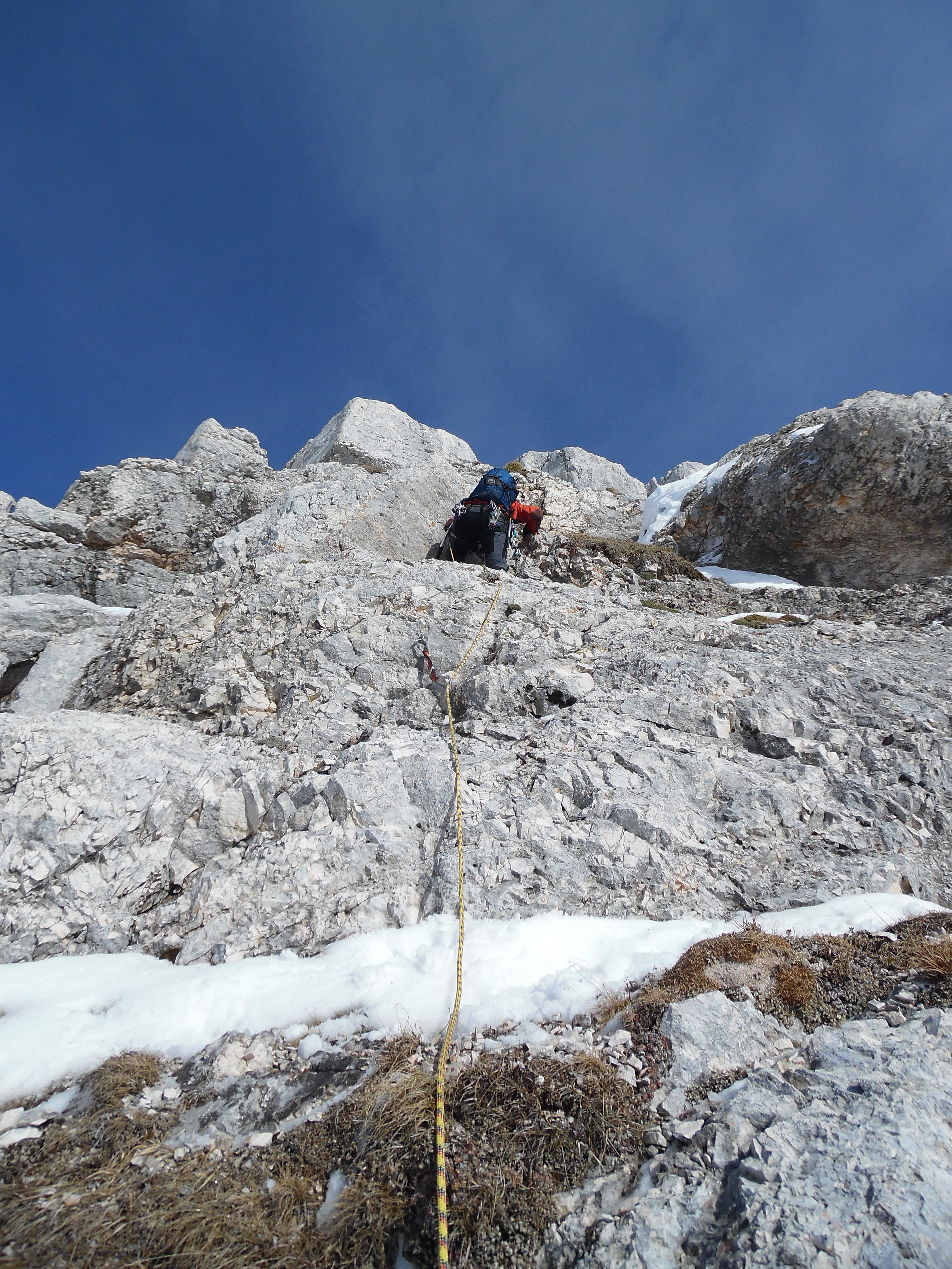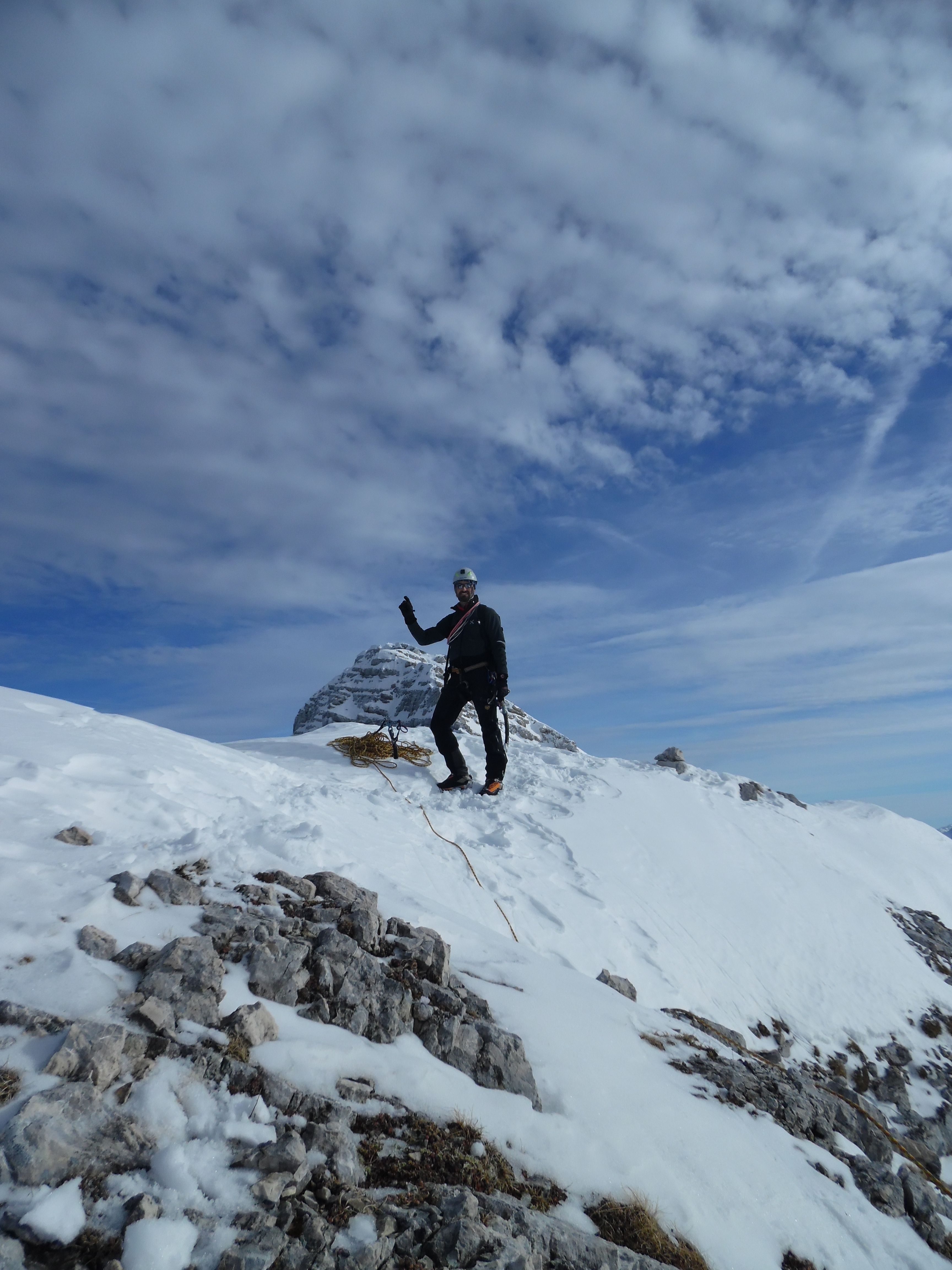 Non avendo relazioni precise ci affidiamo all’intuito, vado avanti io in quello che sembra un passaggio ostico quantomeno per l’orientamento. Sfruttando una stretta cengetta innevata con salto sui nevai sottostanti, mi alzo verso un tipico gendarme di pietra, guardingo per non fare la fine del topo.. Mentre cerco un modo per assicurare un’eventuale caduta noto in alto sulla destra una placchetta Inox che fa al caso mio e affronto il passaggio rincuorato giungendo in breve al sole della cresta. Nei pressi è semisommerso dalla neve un altro ancoraggio che terrò buono per la calata finale. Sulla cima in vista del residuo di una girante, pianto un buon chiodo in questa roccia bianca e recupero in sicurezza l’amico. Gli orizzonti che si aprono da quassù oggi han dell’incredibile e spaziano fino al mare Adriatico, essere in montagna in mezzo alla neve e godere del luccichio lontano del golfo di Trieste non capita tutti i giorni ma le montagne friulane offrono anche questo, fortunatamente.