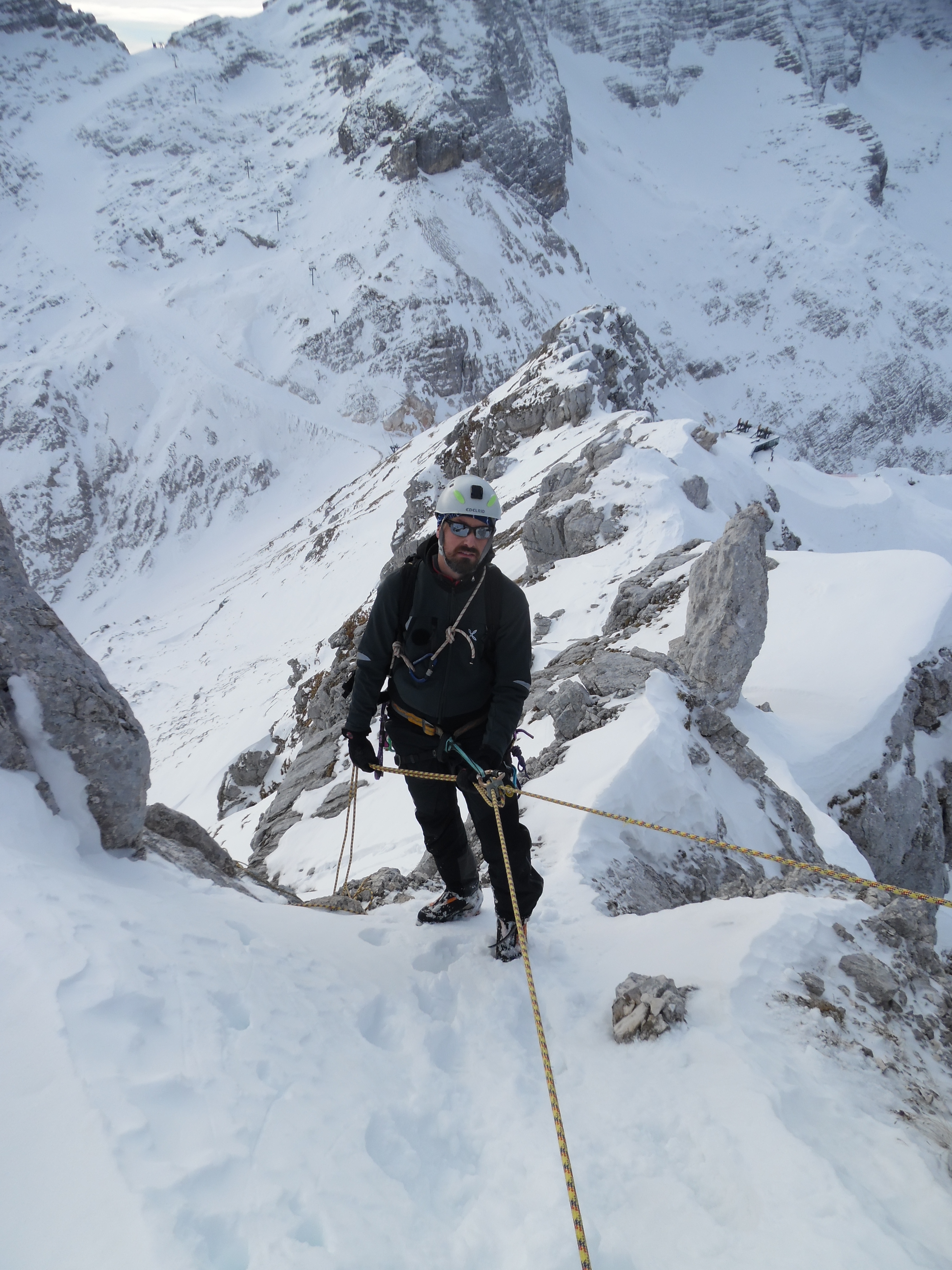 La seconda calata che facciamo viene predisposta sulla piastrina che sovrasta la paretina dove c’è il passaggio di II° ed infine con l’ultima calata da 30m arriviamo sullo scivolo di neve del versante N sopra alla stazione di arrivo della cabina. Sulla piastrina dell’ultima calata, non fidandoci di un cordino di nylon piuttosto sbiadito, lasciamo una maglia rapida delle nostre.
