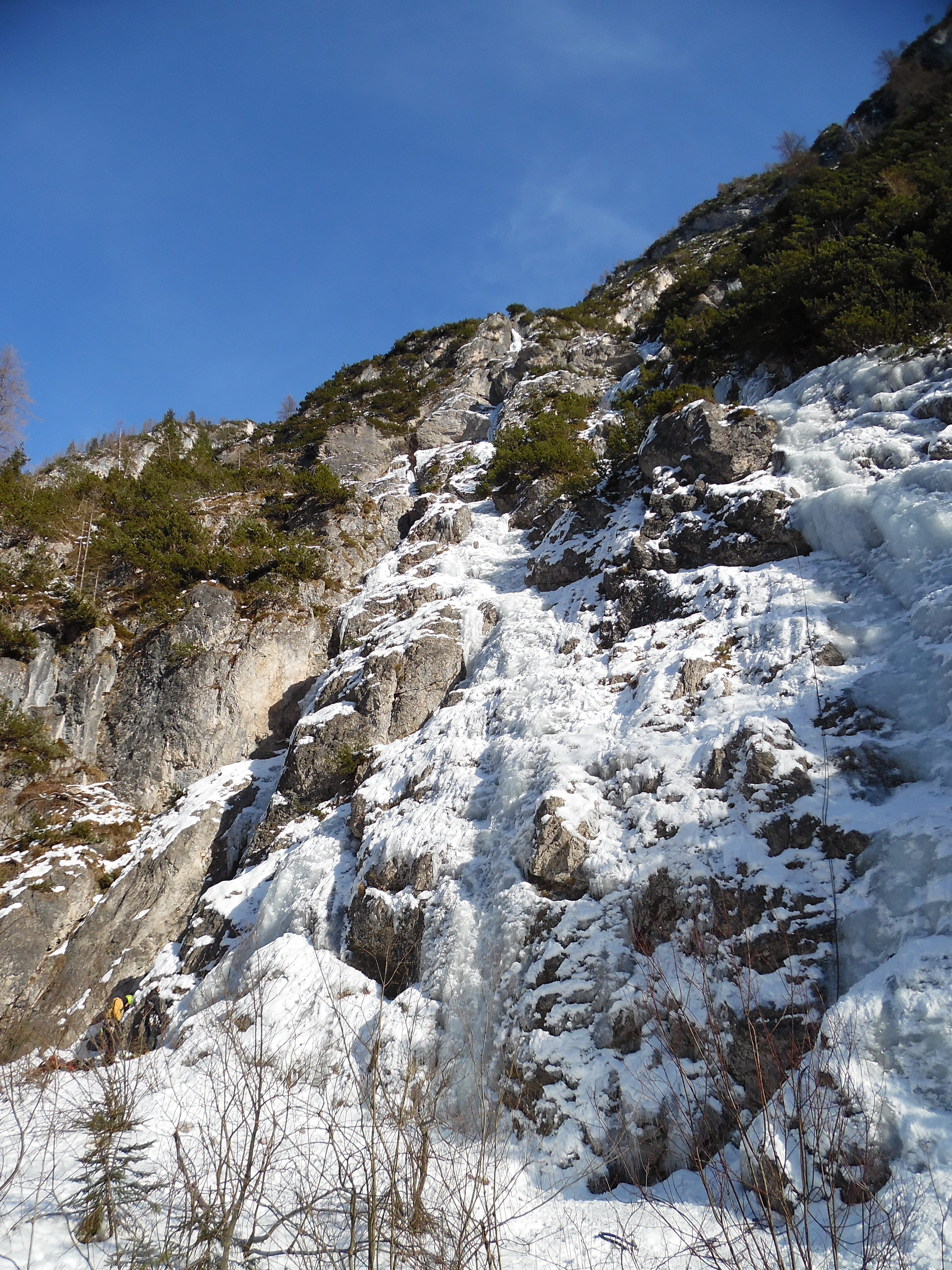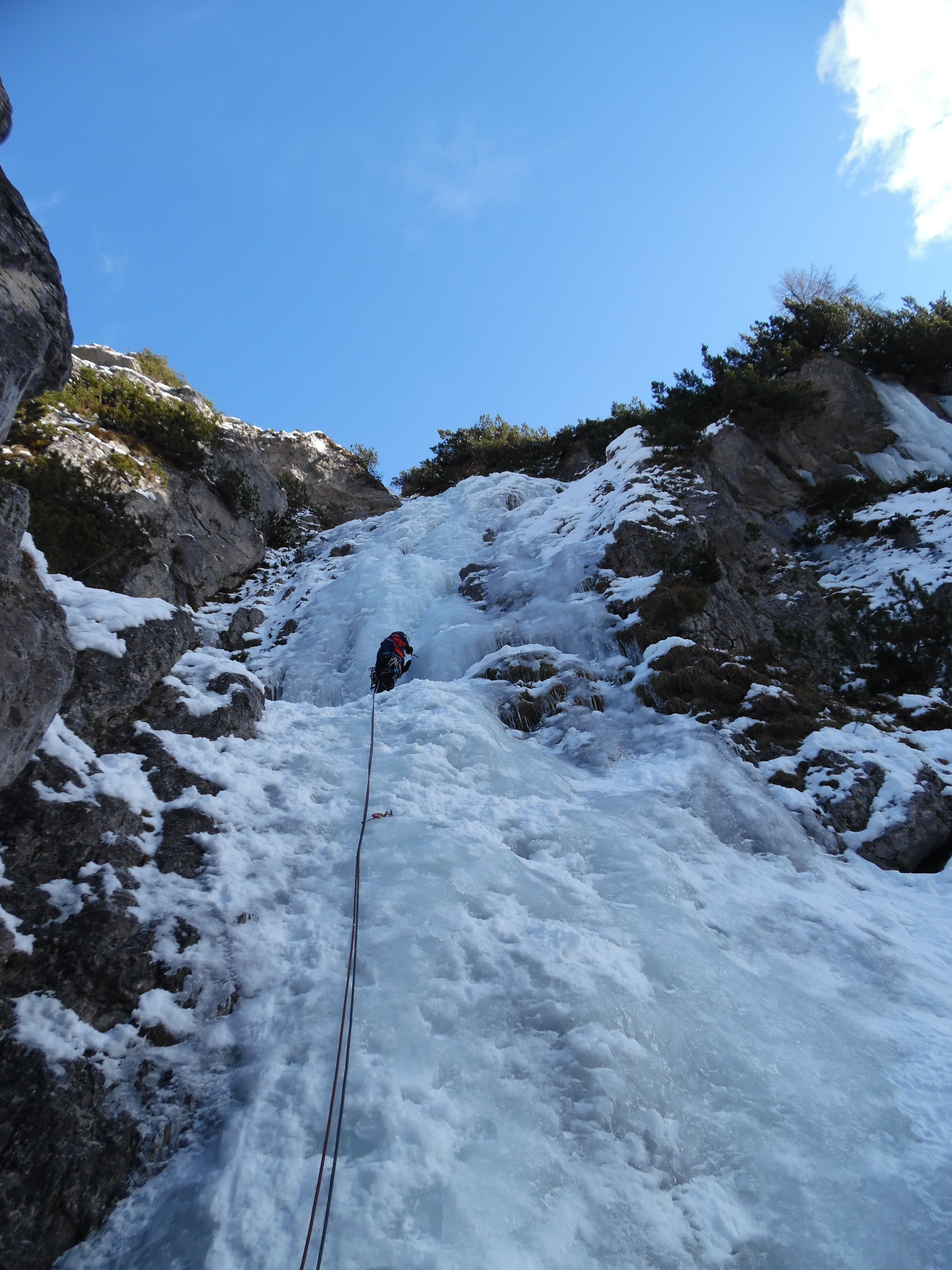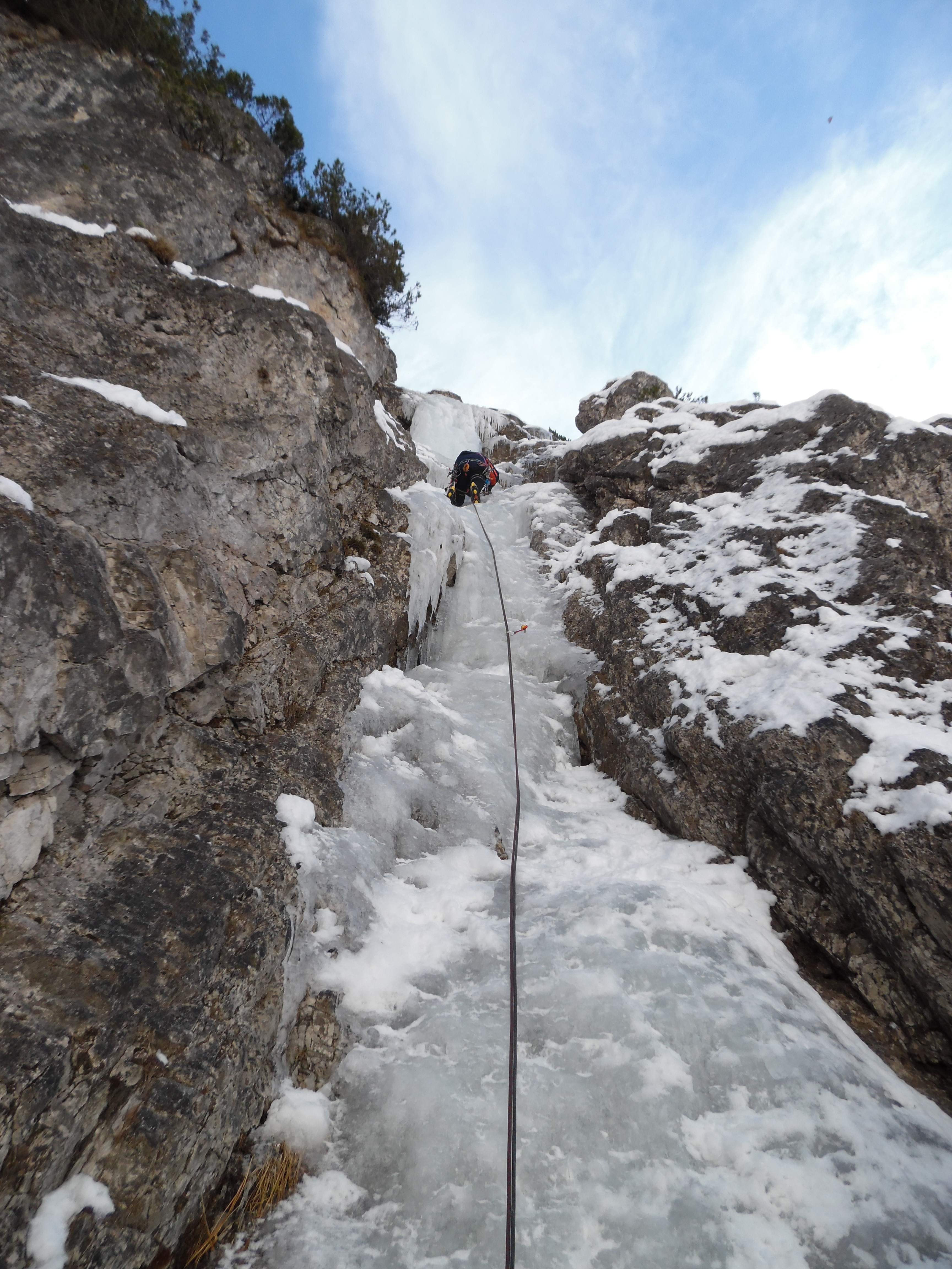 Attacchiamo quindi il secondo tiro, partenza verticale, piccola sezione appoggiata e bellissimo lungo muro di ghiaccio dove piantarci gli attrezzi equivale a soddisfare il proprio IO al meglio. La sosta, anche qua, è di quelle da manuale, riattrezzata da poco con materiale inox.