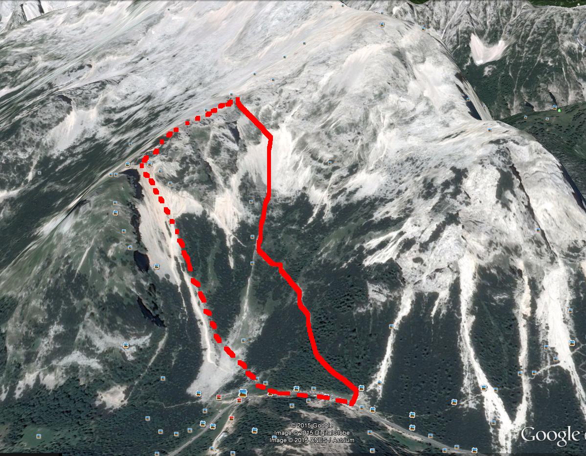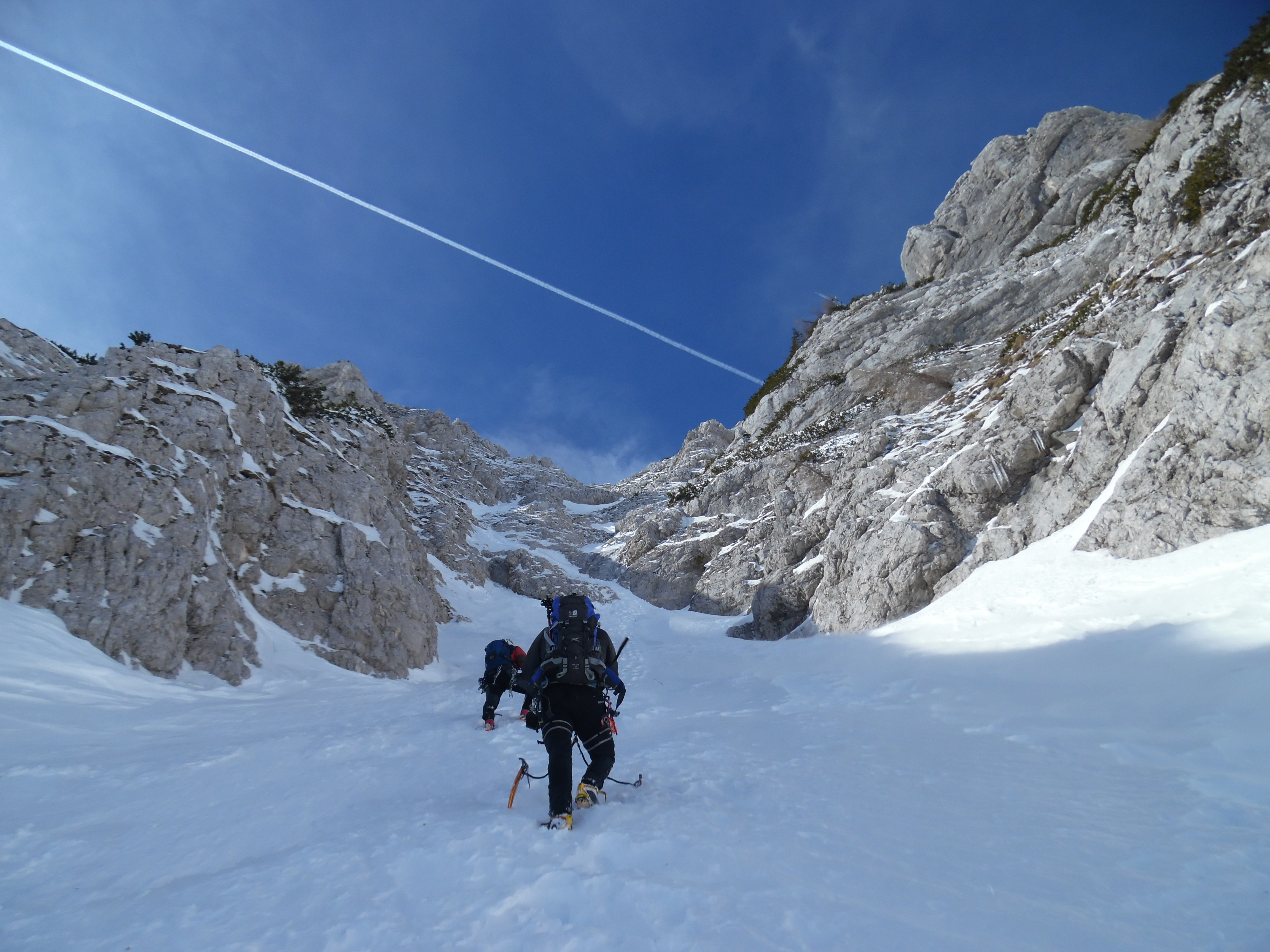 Info utili: il canale Pripravniska alla Mala Mojstrovka è un percorso simpatico dal dislivello moderato e di rapido accesso dal passo Vrsic (kraniska Gora) solitamente transitabile anche nella stagione invernale. Avvicinamento in un’oretta mirando alla parte alta della parete, il canale aspetta girando l’angolo (vedi foto). Canale di 200m con pendenza media di 45°, 1 passaggio sopra i 50°. Necessarie picozza e ramponi, corda superflua. tempo di percorrenza 30min. Per il rientro è consigliabile scendere sul versante opposto mantenendo la sinistra e rientrando verso il passo Vrisc con il “canale” più evidente dove passa la classica sci alpinistica (evidente).