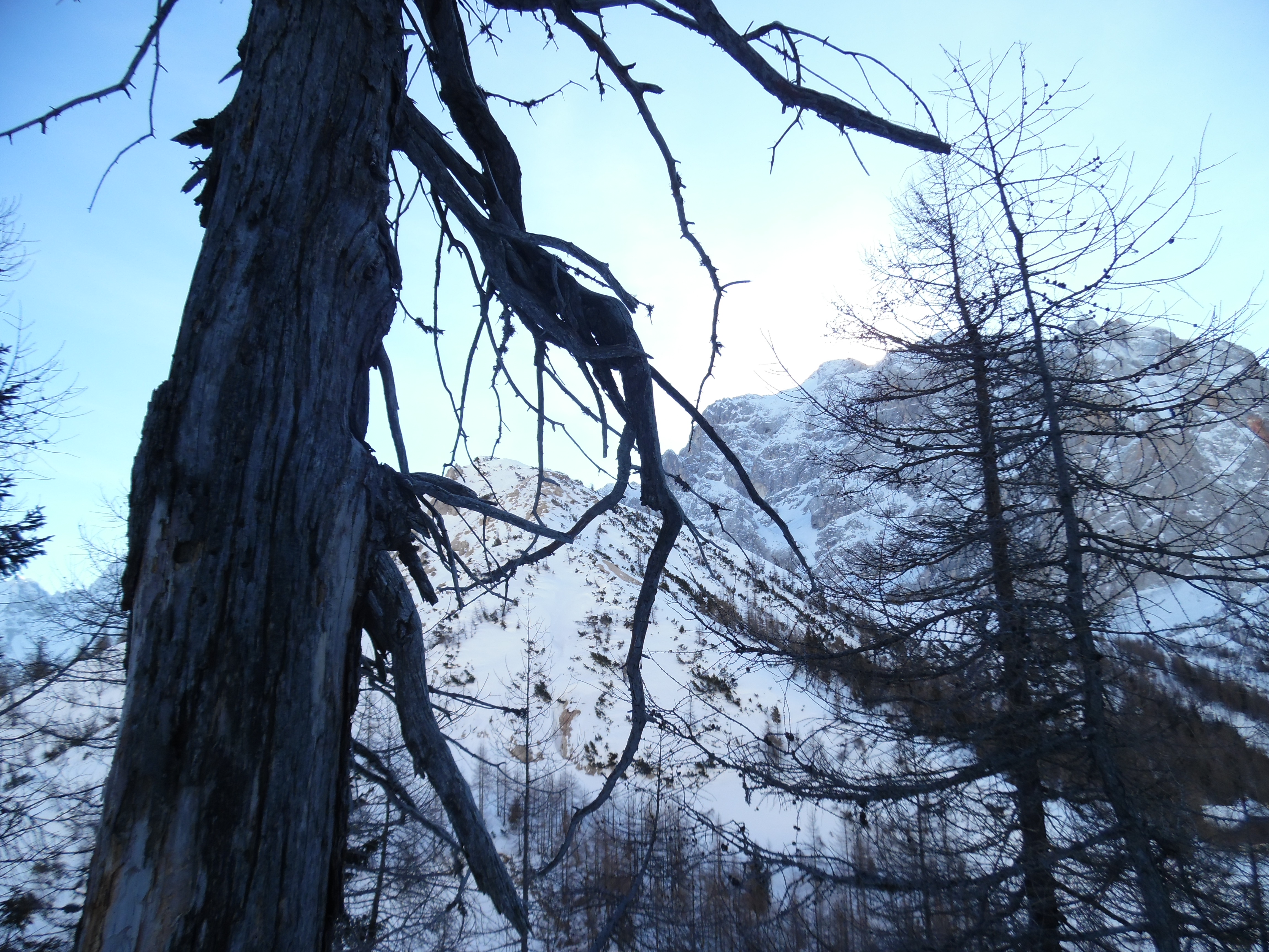 In fila indiana risaliamo boschetti di pino e larice sulla traccia degli sci che ci han preceduto, la giornata pare stupenda. La parete N del Prisojnik lascia estasiati nella sua grandezza, nessuna parola potrebbe in questo momento rappresentare la bellezza della corona di cime che si mette davanti al nostro sguardo verso N-E. Cime dai nomi duri, Razor, Spik, Skrlatica, cime che magari un giorno avrò la fortuna di salire ampliando i miei orizzonti.
