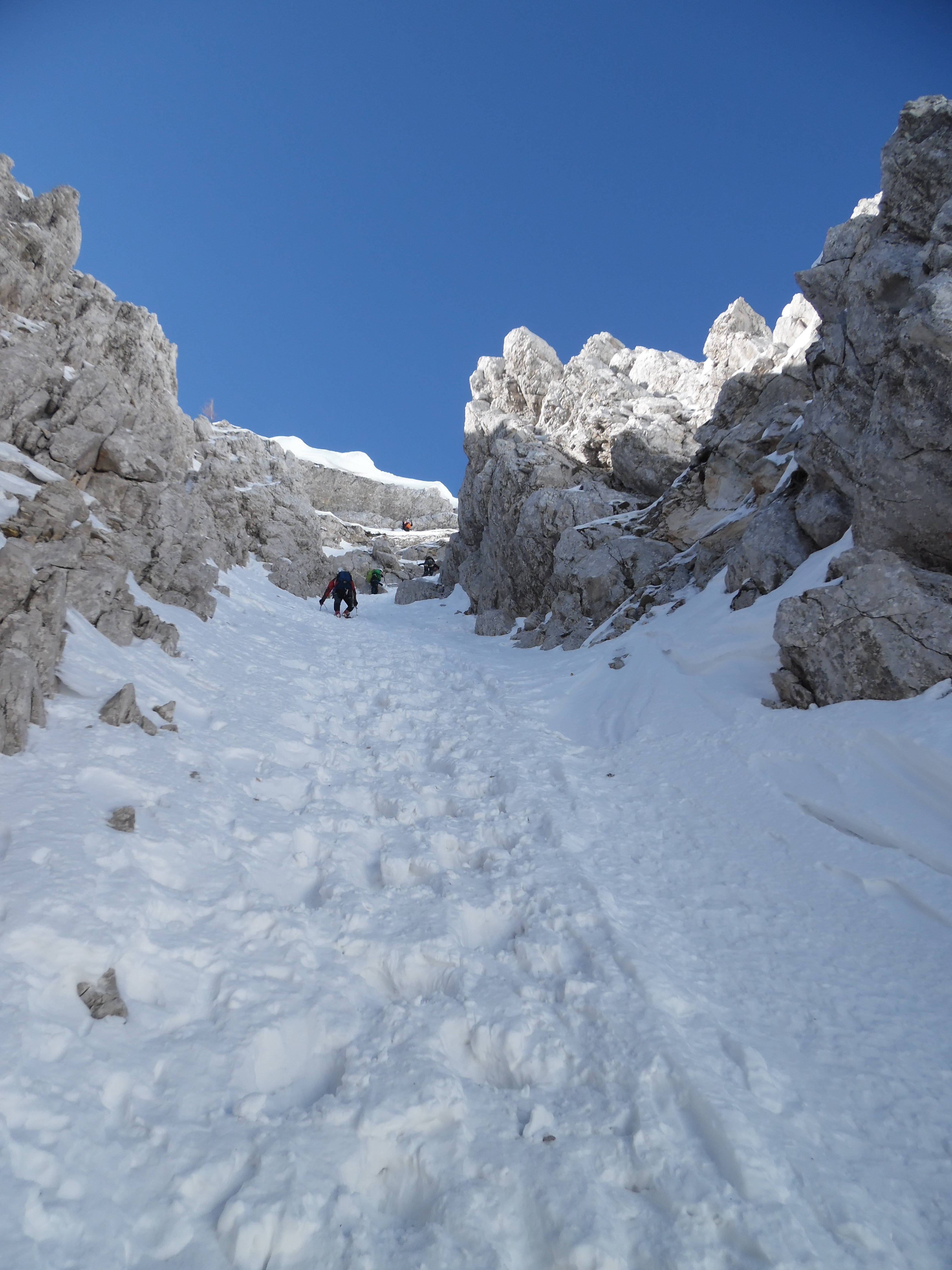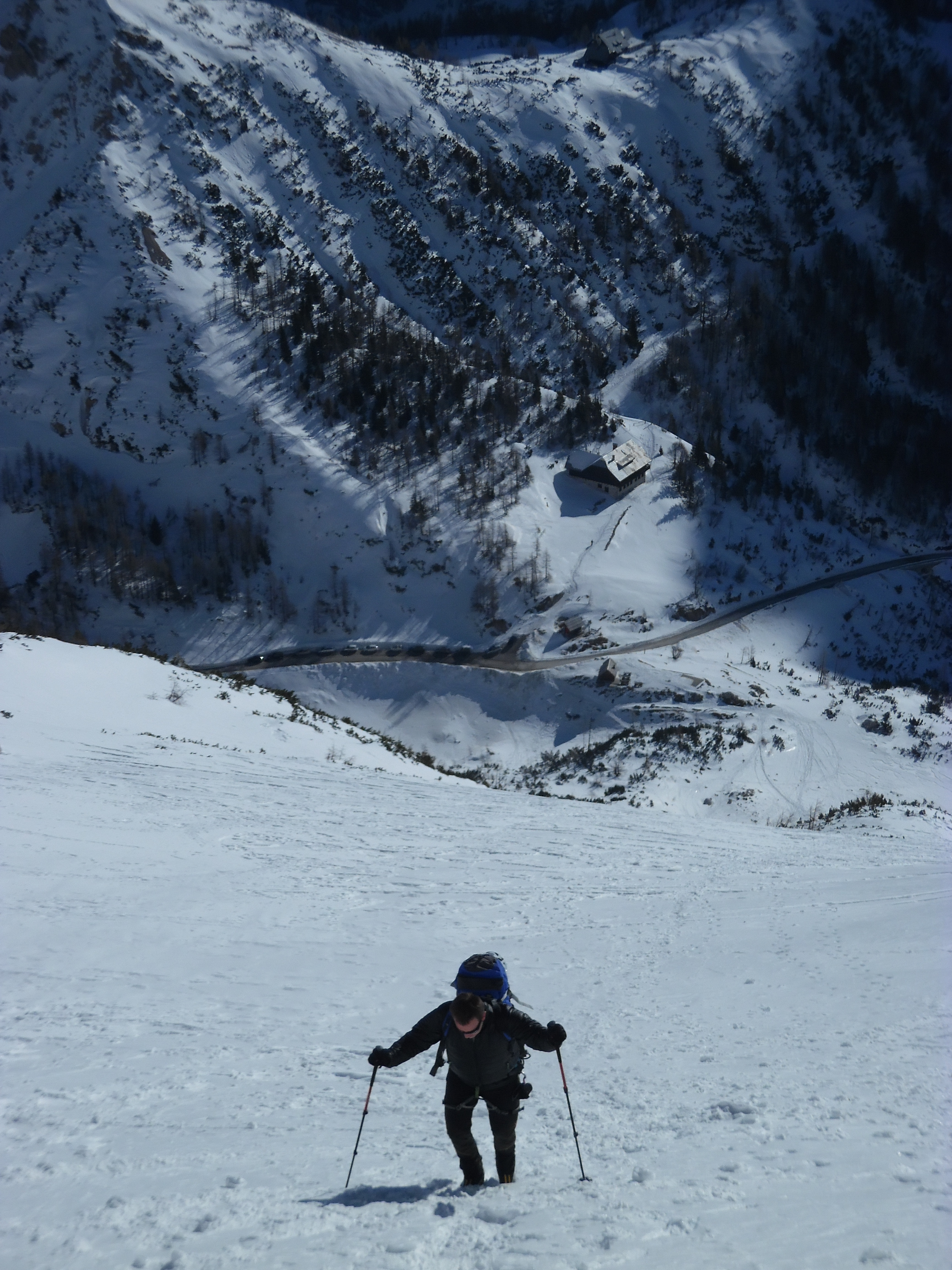 Qua sul passo Vrsic le condizioni sono quelle ottimali per le invernali, canali, gulottes e chi più ne ha più ne metta. Pellegrini multicolore prendono vie diverse, qua se ne vedono di tutti i tipi.. I più tradizionalisti forse siamo noi assieme ad un gruppo di scialpinisti.. Poi vengono quelli che c’hanno gli sci sulla schiena e i ramponi ai piedi ma al posto degli scarponi da sci calzano pedule leggere. Oppure sci alpinisti che risalgono i pendii, anche di neve farinosa piuttosto fastidiosa, sempre a piedi con gli sci sulla schiena. Ma che senso ha? Avranno un paio di pelli di foca a casa o devono allenarsi?