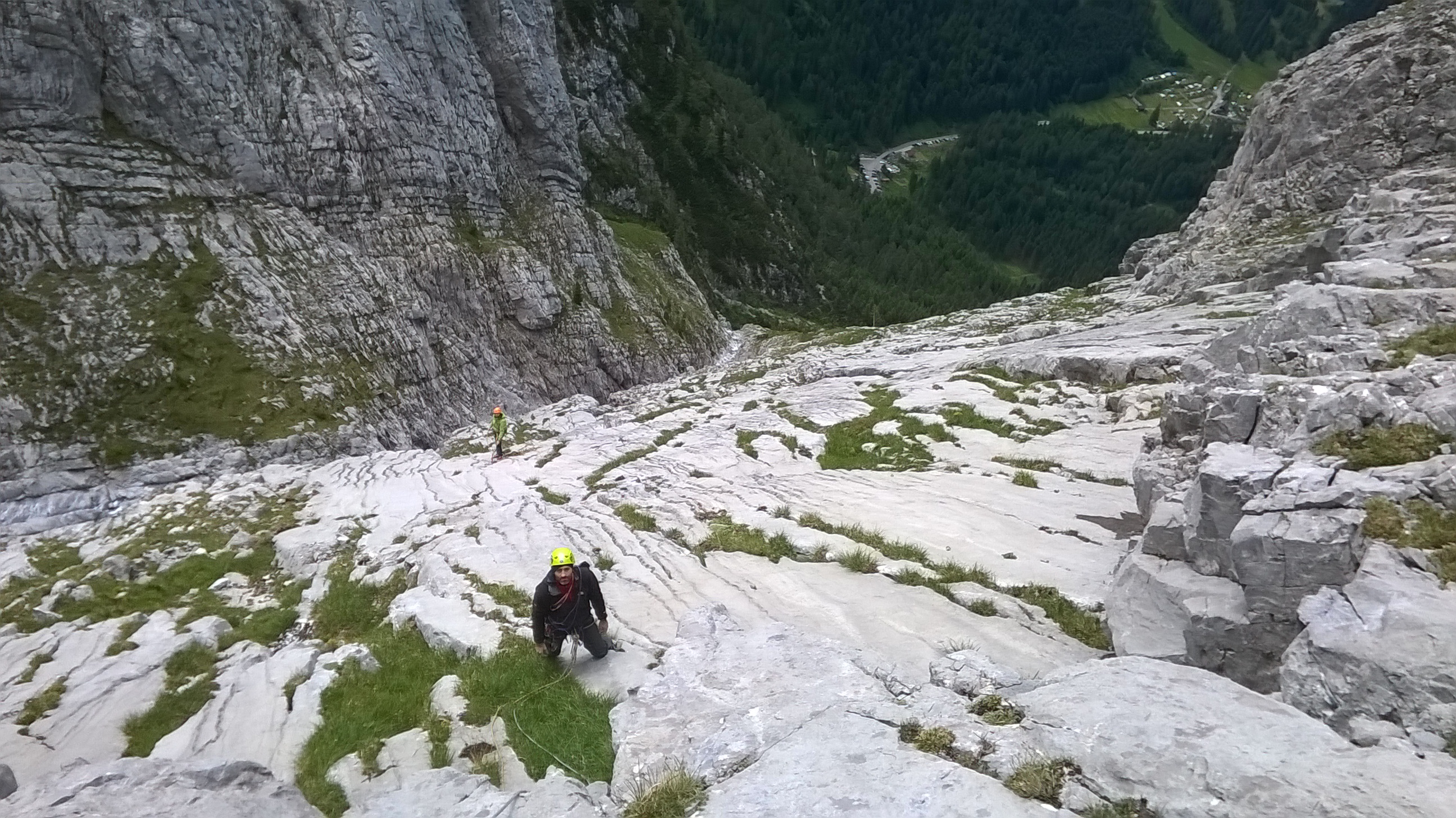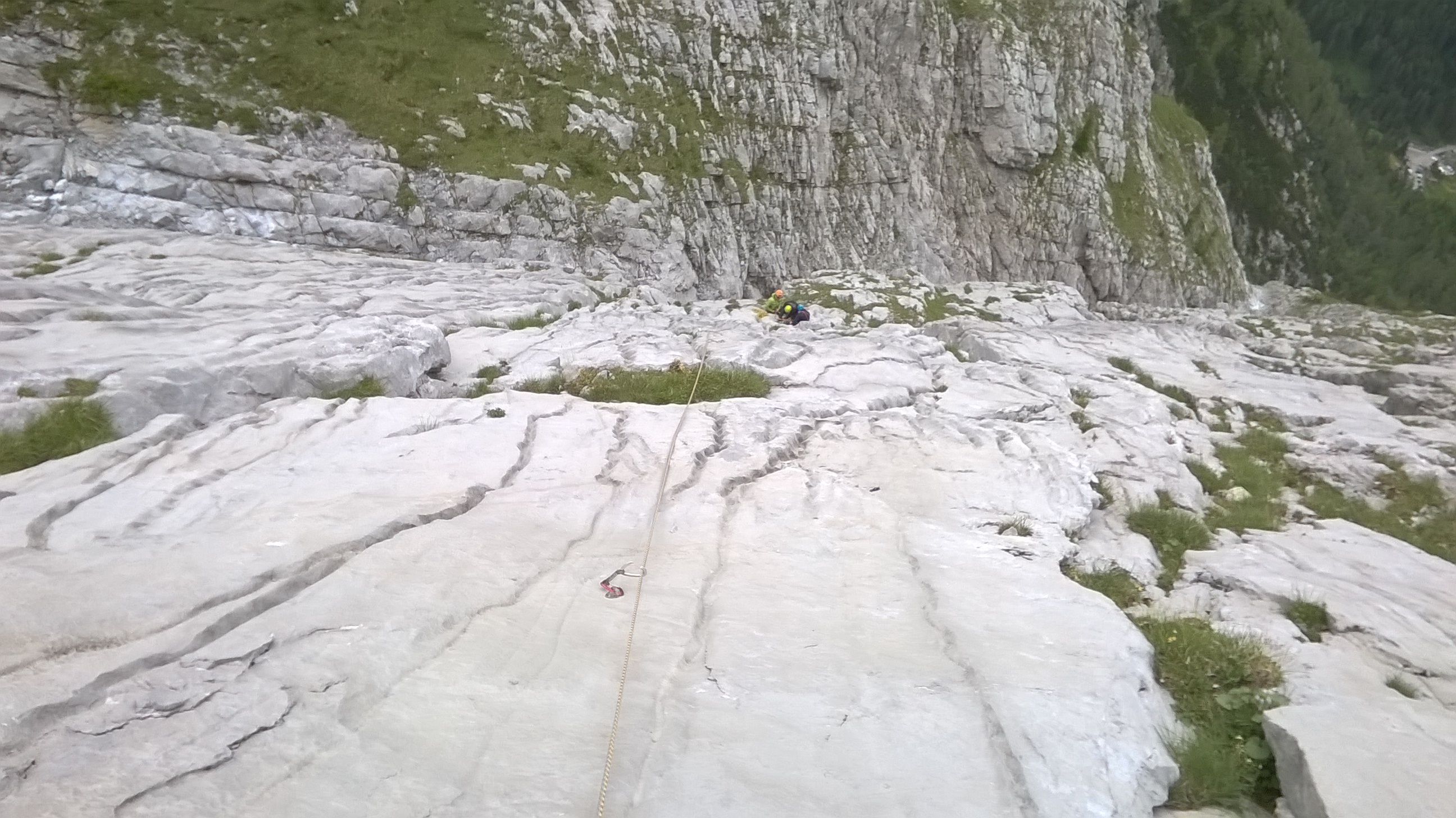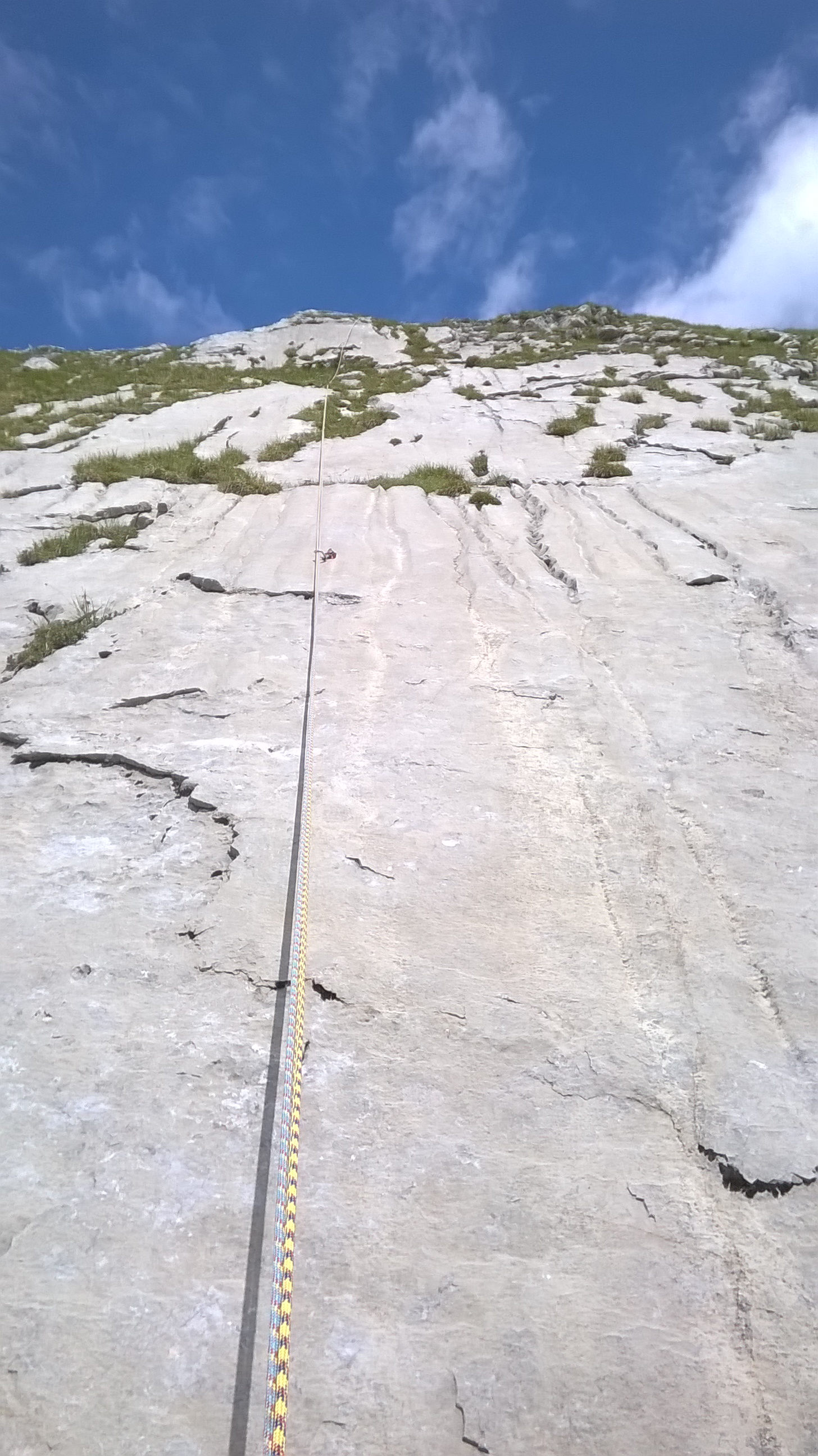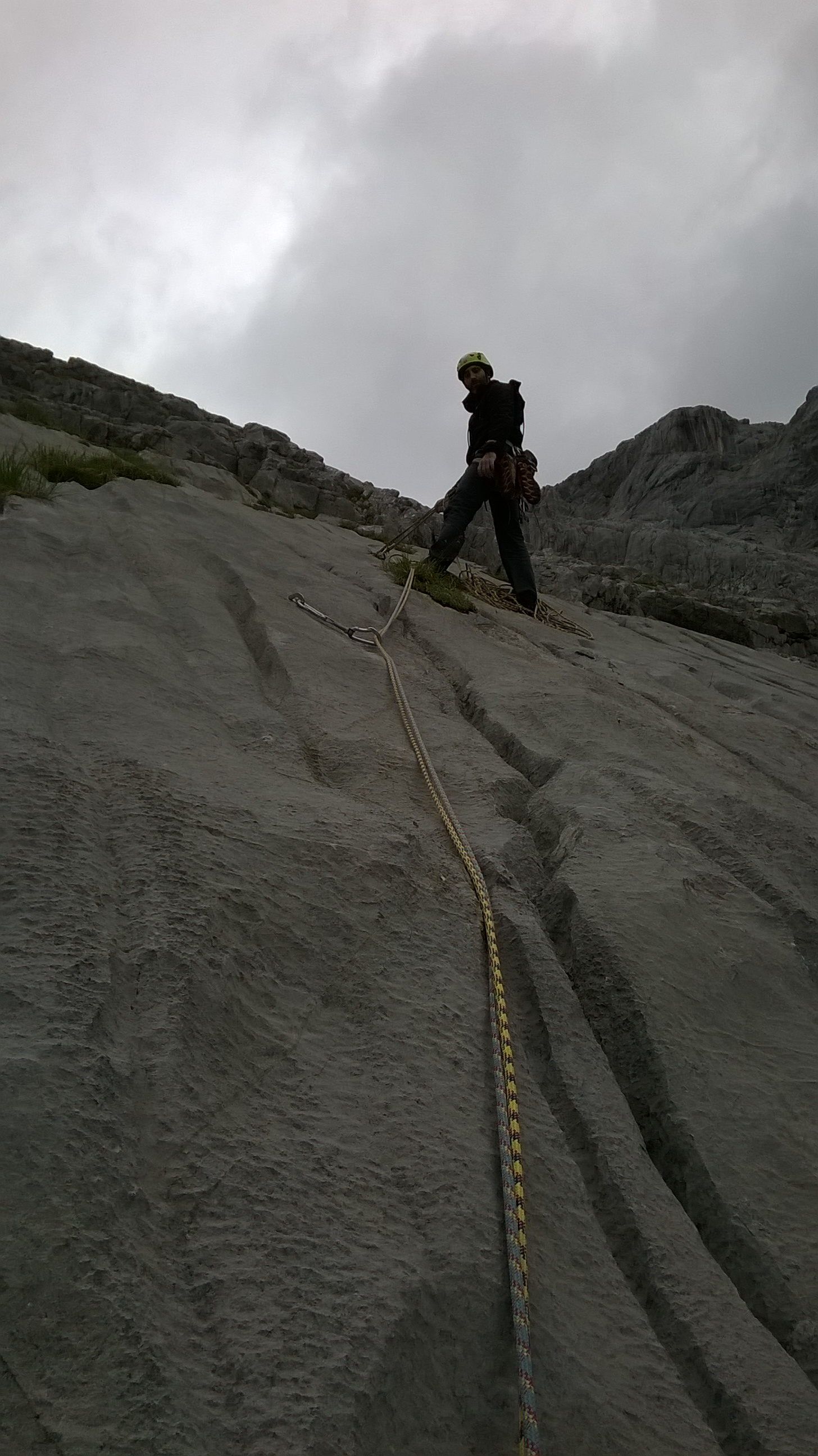 La prima lunghezza scorre veloce, sarà un 4° grado, spittatura lunga, anche una dozzina di metri, ma l’aderenza è ottima e gli appigli abbondanti. Recupero Manuel che sale lesto, finalmente oggi concretizziamo promesse che aspettano da 2 anni.