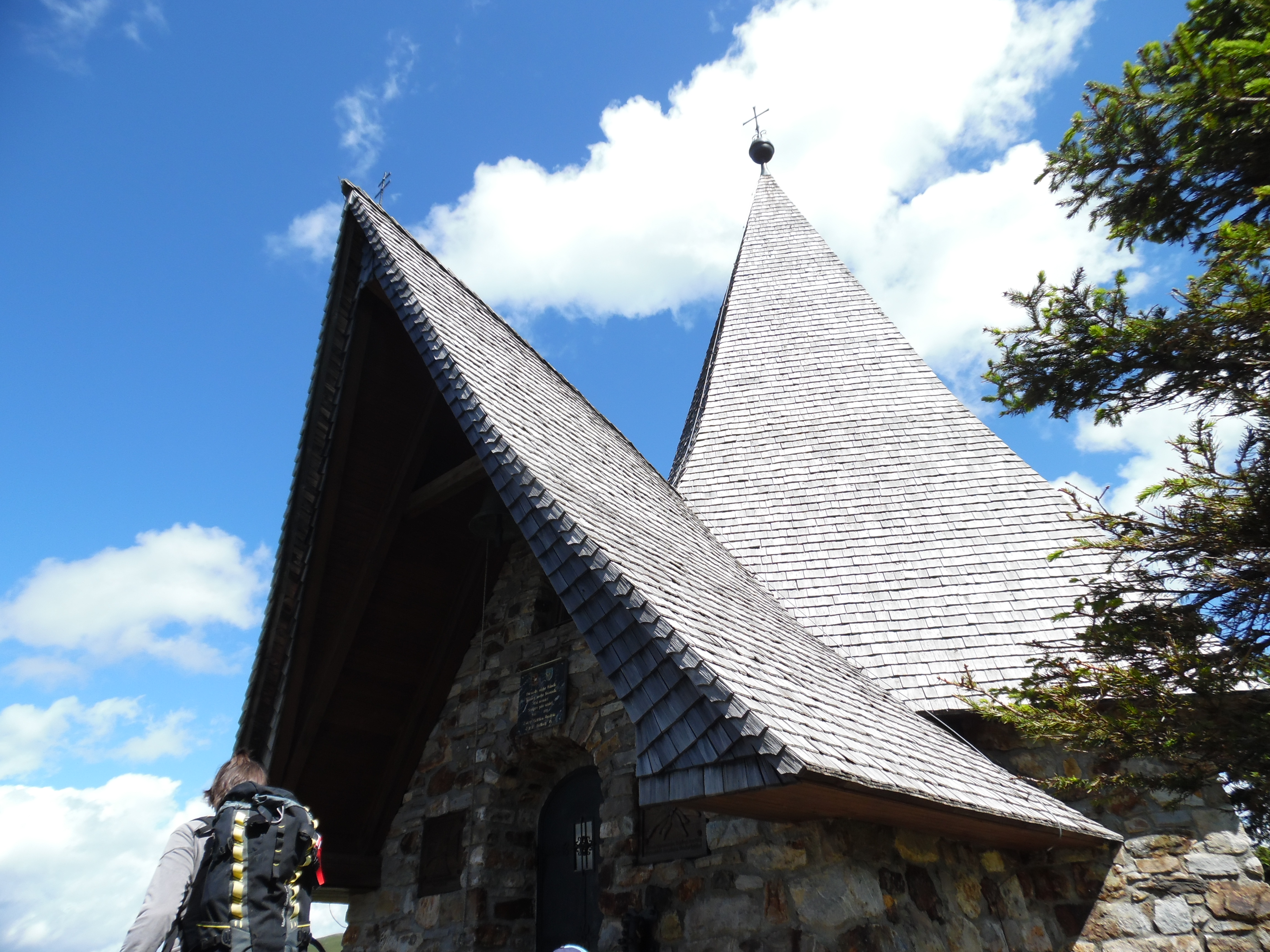 Prendiamo quindi la strada sterrata in direzione del rifugio e della chiesetta di guerra, posti su un’altura vicina. Attorno mucche atterrate digeriscono quest’erba che nelle tinte verdi della prima estate riempiono lo sguardo di chi, come noi, si muove camminando e assaporando gli odori e le luci di quassù. Oggi pochissime persone, meglio così.