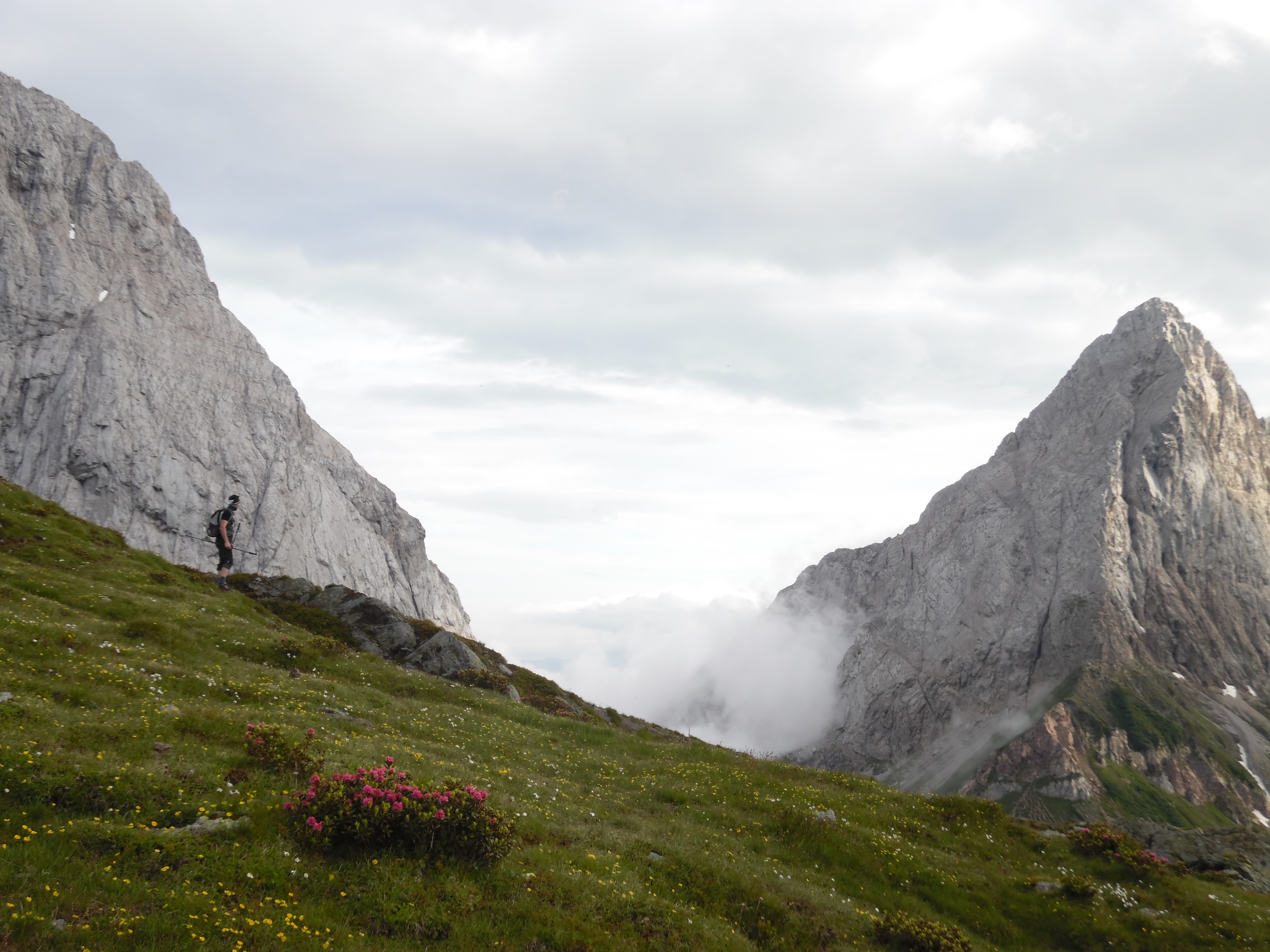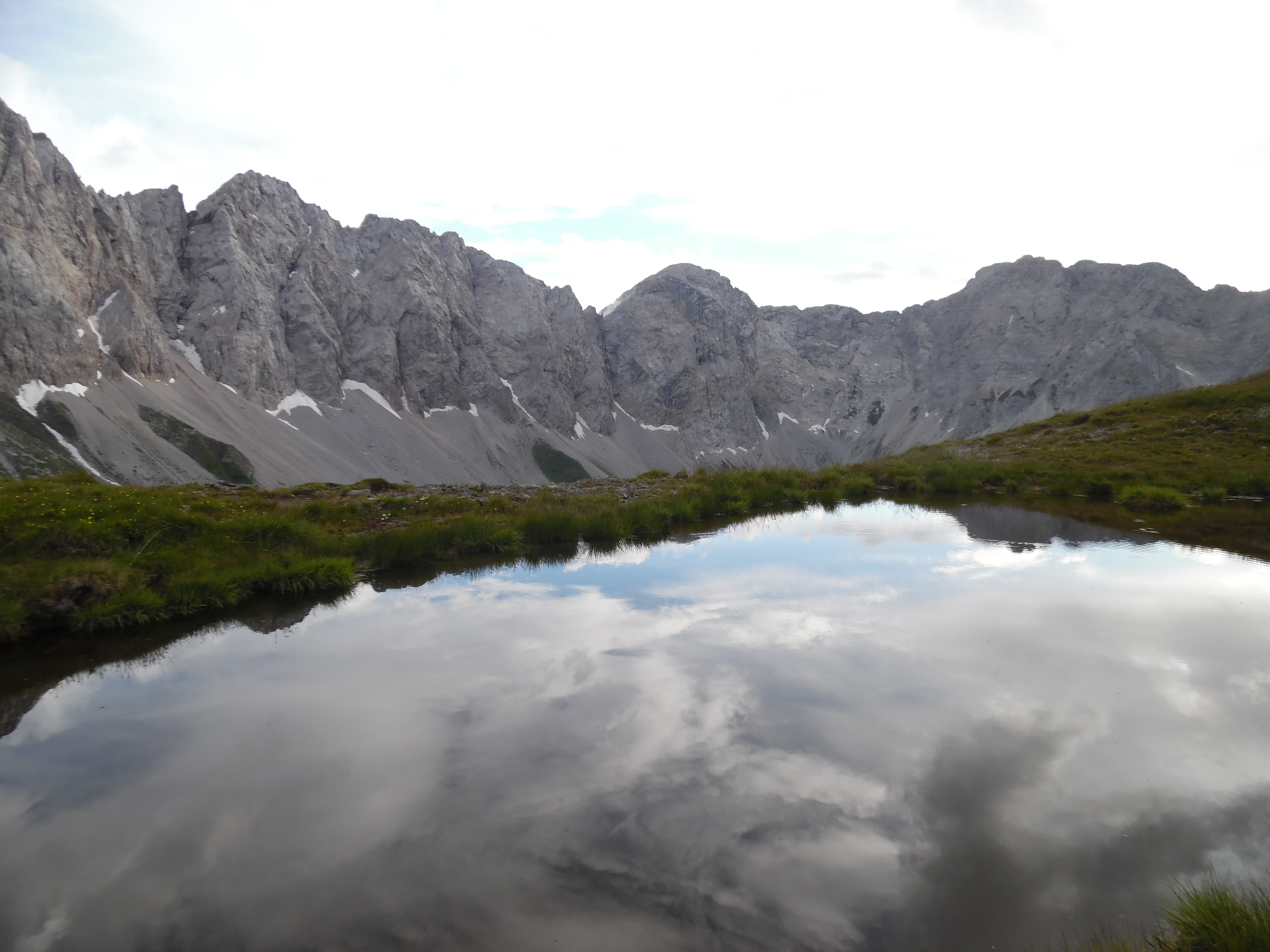 Finalmente, dopo l’ennesima rampetta di erba, cielo e roccia sbuchiamo su un pianoro che offre la possibilità di traversare in quota verso l’inizio delle creste erbose del Maderkopf; non perdiamo l’opportunità e fra incredibili macchie di neve ancora persistenti, guadagniamo la successiva dorsale.
