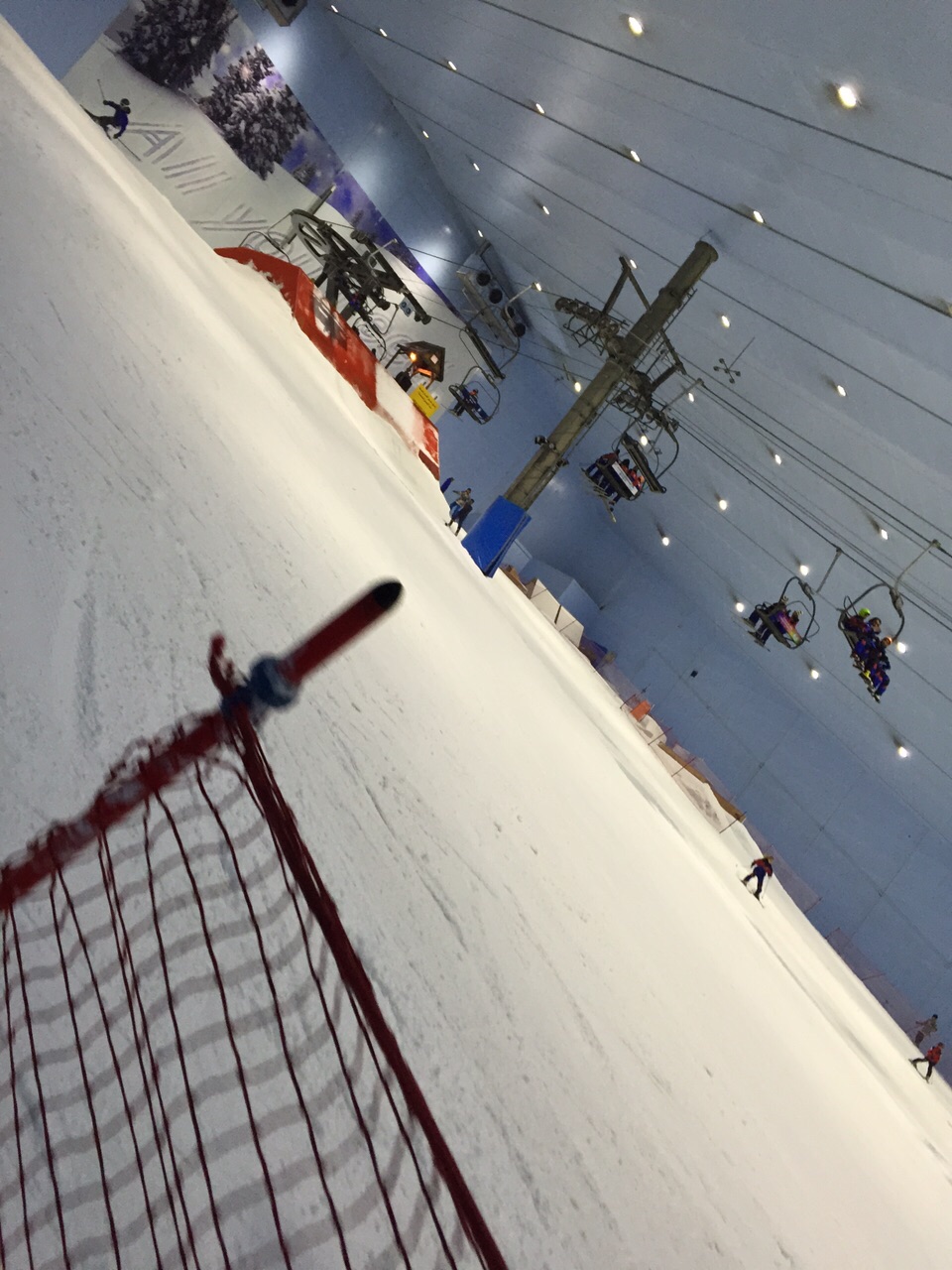 La neve mi sembra abbastanza buona, mentre risalgo scendono alcuni ragazzi del posto, l’equivalente dei nostri Omarut, Ale, Marco etc, e guardo la neve sotto i loro sci; non sembra male, per essere in un tubo di cemento che fuori tocca anche 50 gradi, non è male. Schivo il bastoncino perso dal ragazzino davanti a me (tutto il mondo è paese) e finalmente arrivo in cima. Dislivello totale….85 metri, lunghezza pista 400 mt (la più lunga).
