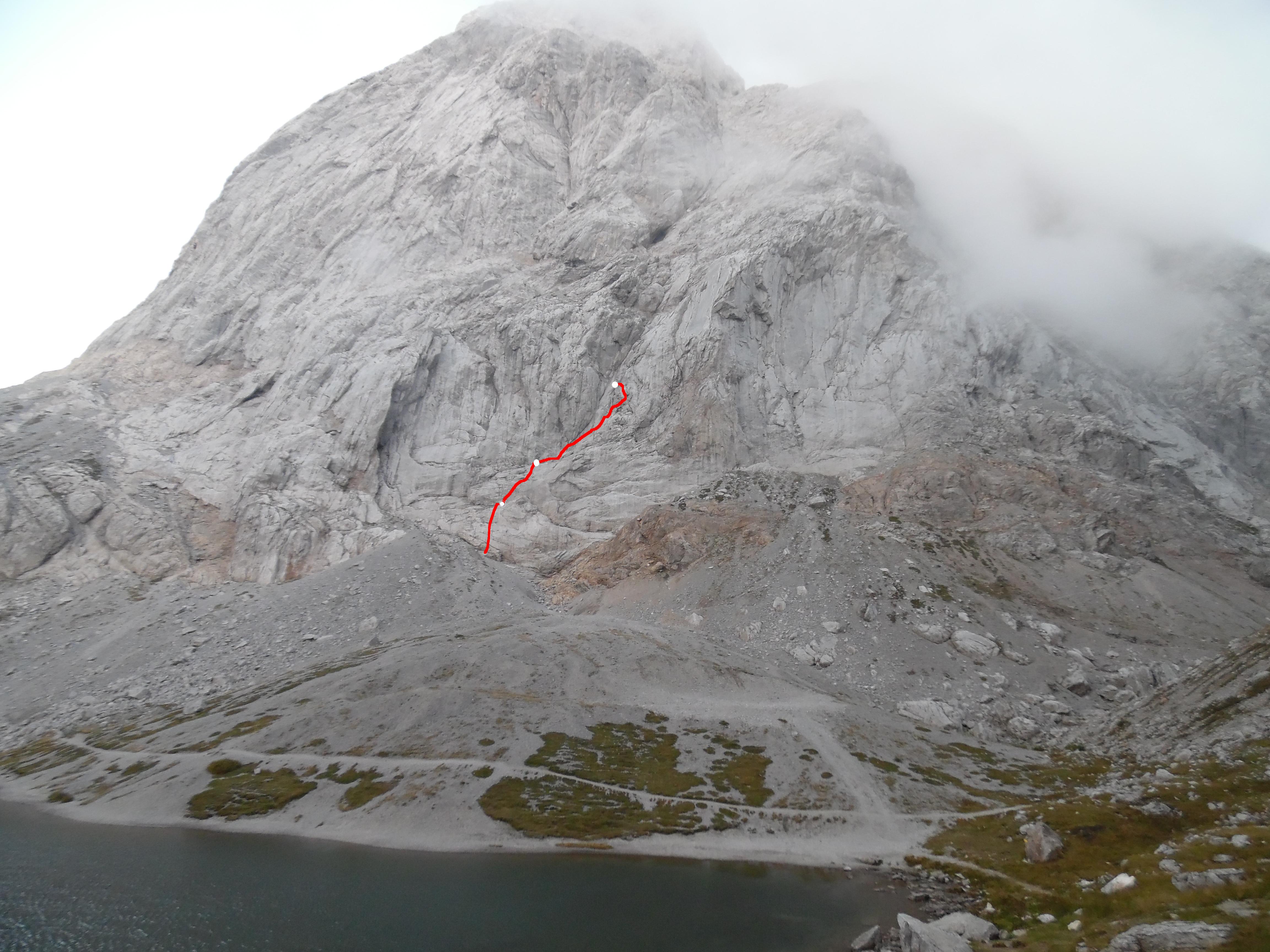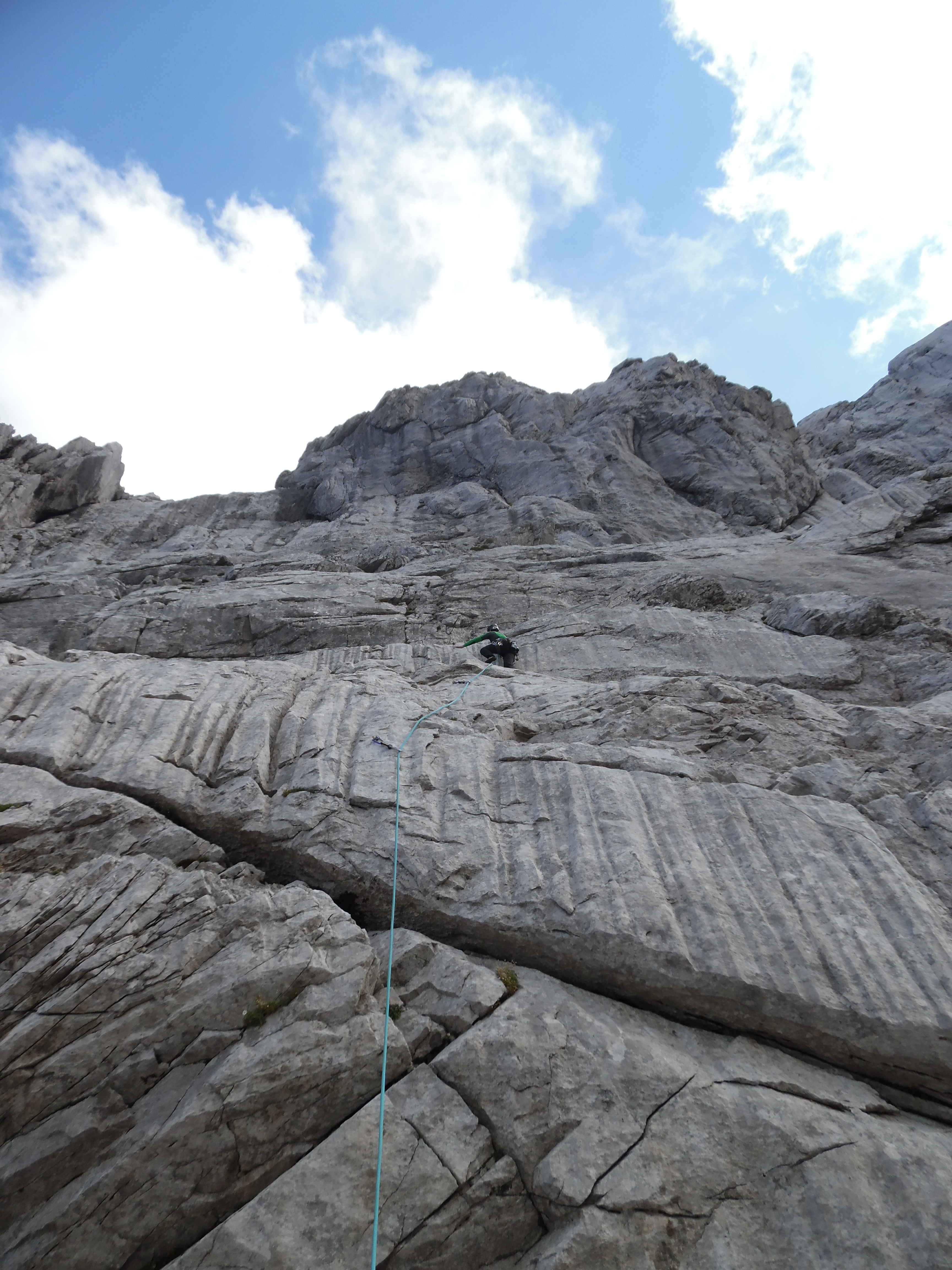 Detto fatto. Mi lego nuovamente in un tiro sui 15 m realizzato poco a destra di una baracca dalle pietre squadrate e ferri arrugginiti, resti del primo conflitto mondiale. Qua era terra di nessuno. Alla base della parete nessun riferimento, arrampicata a vista. La migliore.