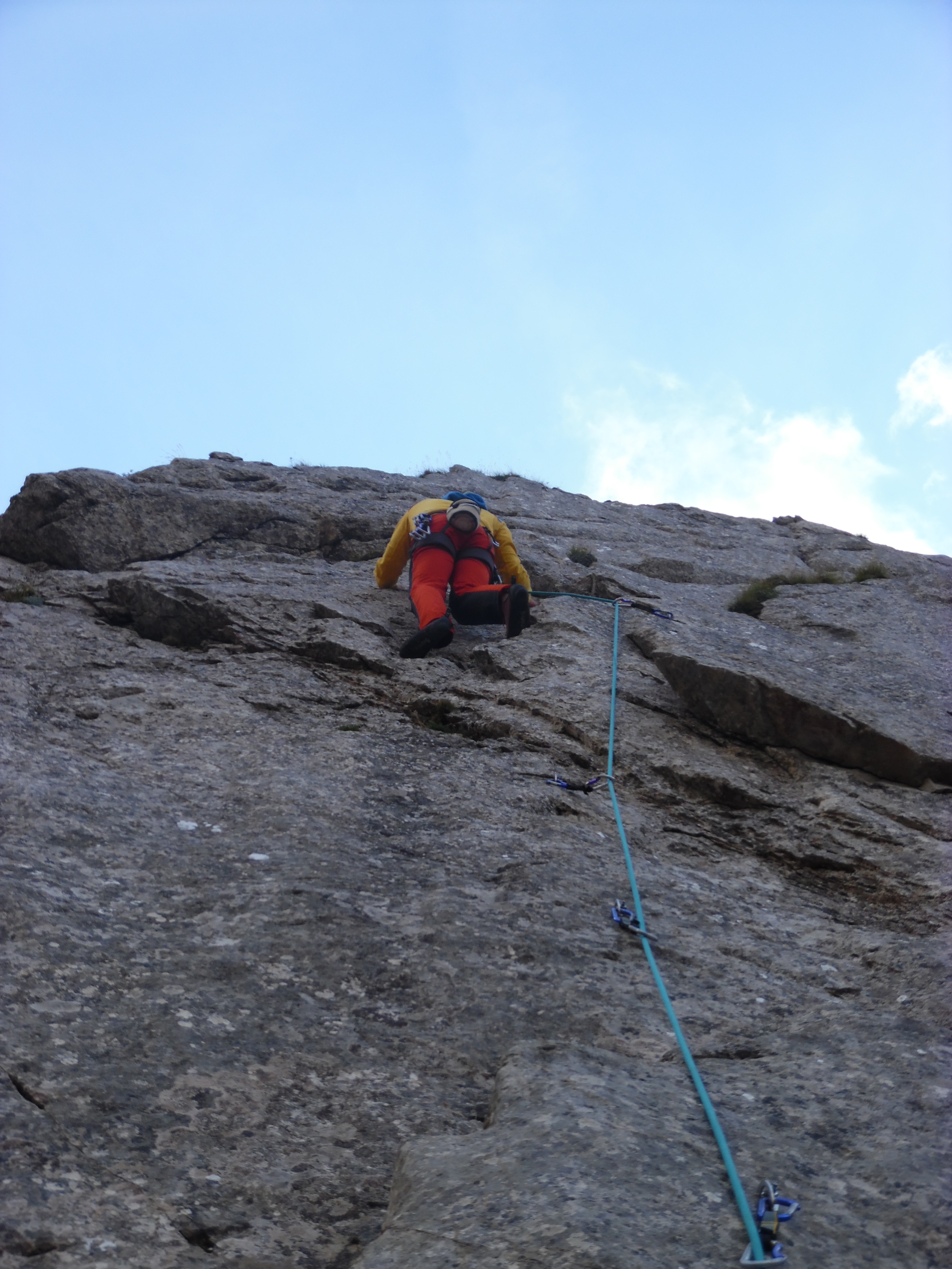 L’ultimo tiro sale ancora a destra, dapprima un canalino appoggiato che va raddrizzandosi per trasformarsi in un diedro. Max scompare alla mia vista, capirò poi salendo a mia volta che le placche verticali che sembrano insuperabili, in realità, sono aggirate dal tracciato della via senza tanti fronzoli. Ancora una decina di metri e l’ultima sosta è ricavata su un terrazzino più esiguo.