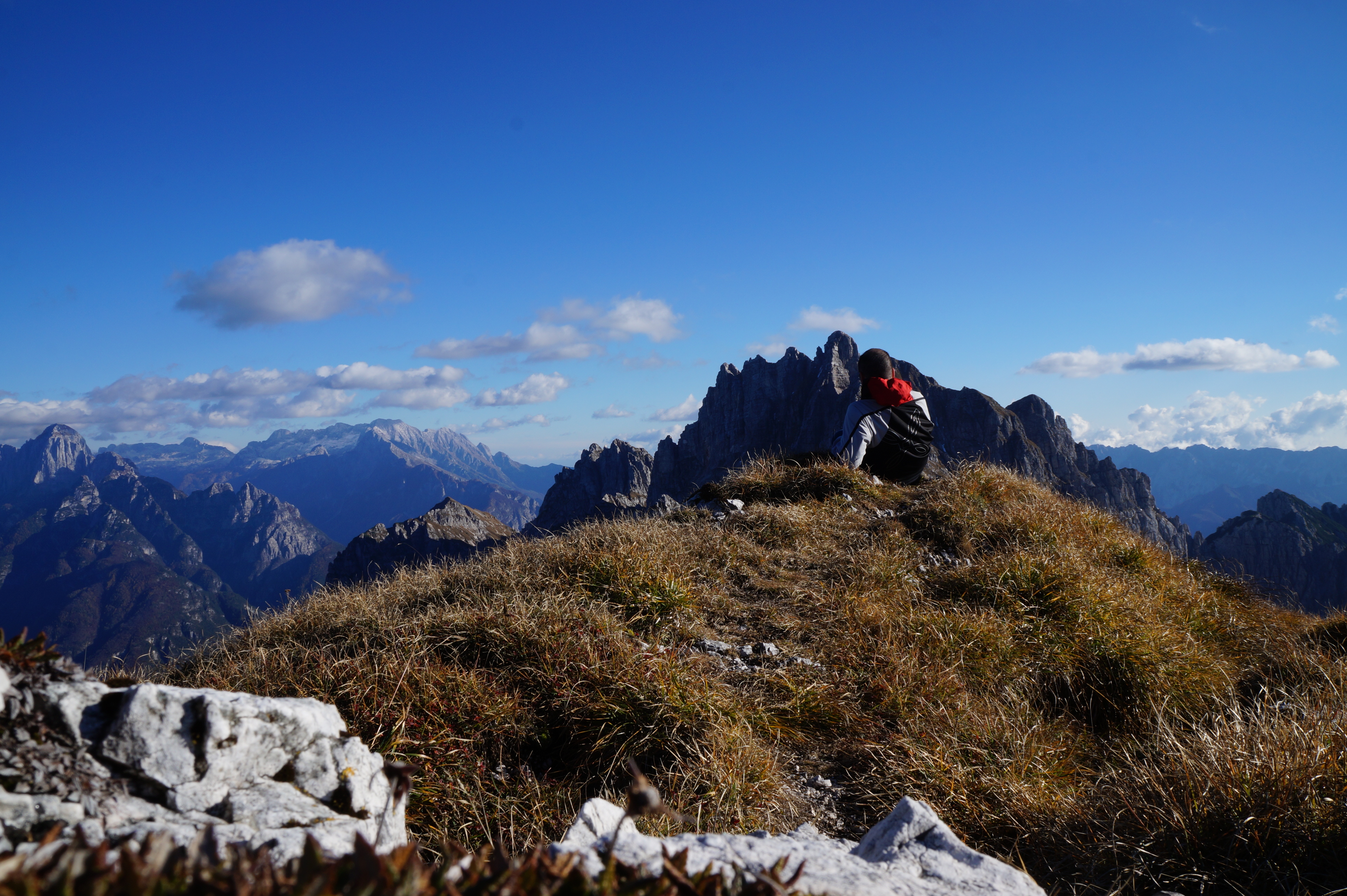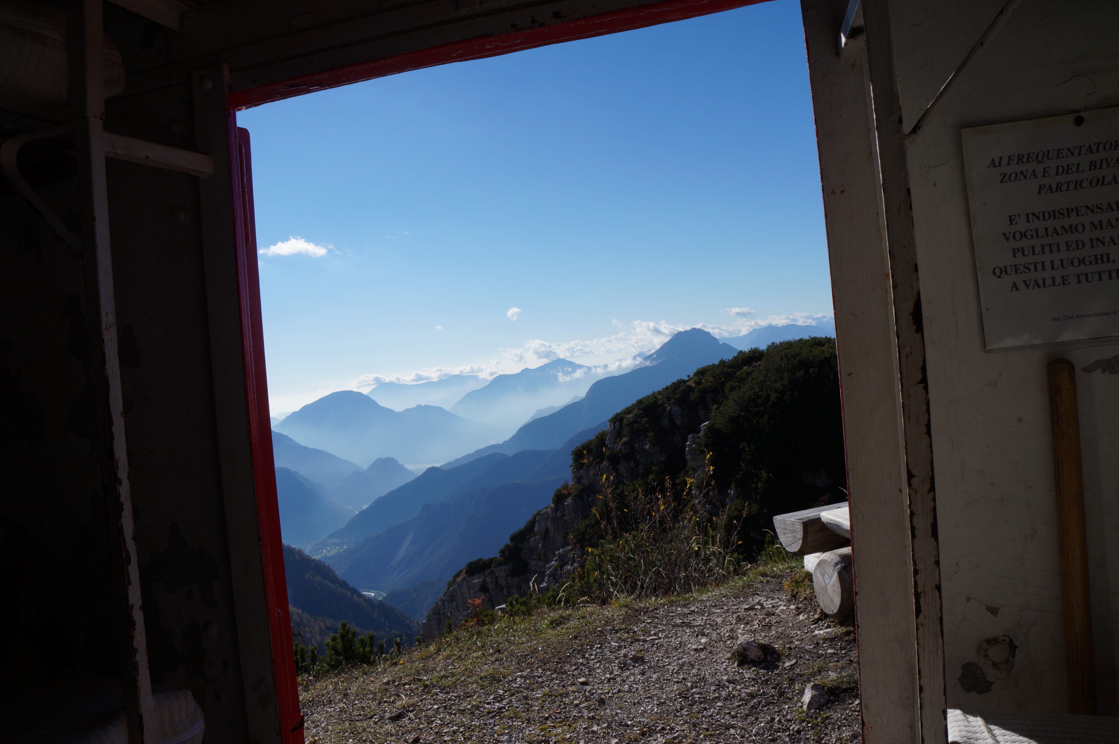 Mi affretto, voglio lasciare questa zona triste e guadagnare i panorami aperti verso la cima. Più su il sentiero si fa mulattiera a curve strette e cenge per oltrepassare una zona di rocce e canali. Saranno i prati e i mughi delle quote a darmi il benvenuto nei pressi del pianoro dove sorge il Bivacco Bianchi. Quassù di certo la frenesia del Mondo non arriva e non resta che fare una pausa contemplando dalle grosse panche di legno antistanti il rifugio un “panorama mozzafiato” (questa è dedicata a Simonetta) che si perde fino alla pianura friulana.