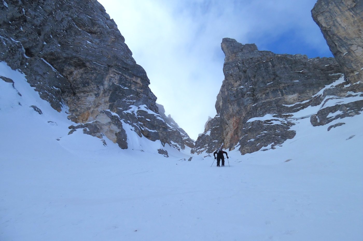 Poi viene la volta della Forcella Mosè che scendo con quel paio di giorni di ritardo per trovare le condizioni perfette che tutti decantano. Discesa su neve strana ma il divertimento c’è lo stesso. Con Carlo e Max non può che essere così. All’Huda butto solo un’occhiata fugace, troppo fuori dalla mia zona di confort, troppo alta, troppo stretta, insomma… Troppo per me.