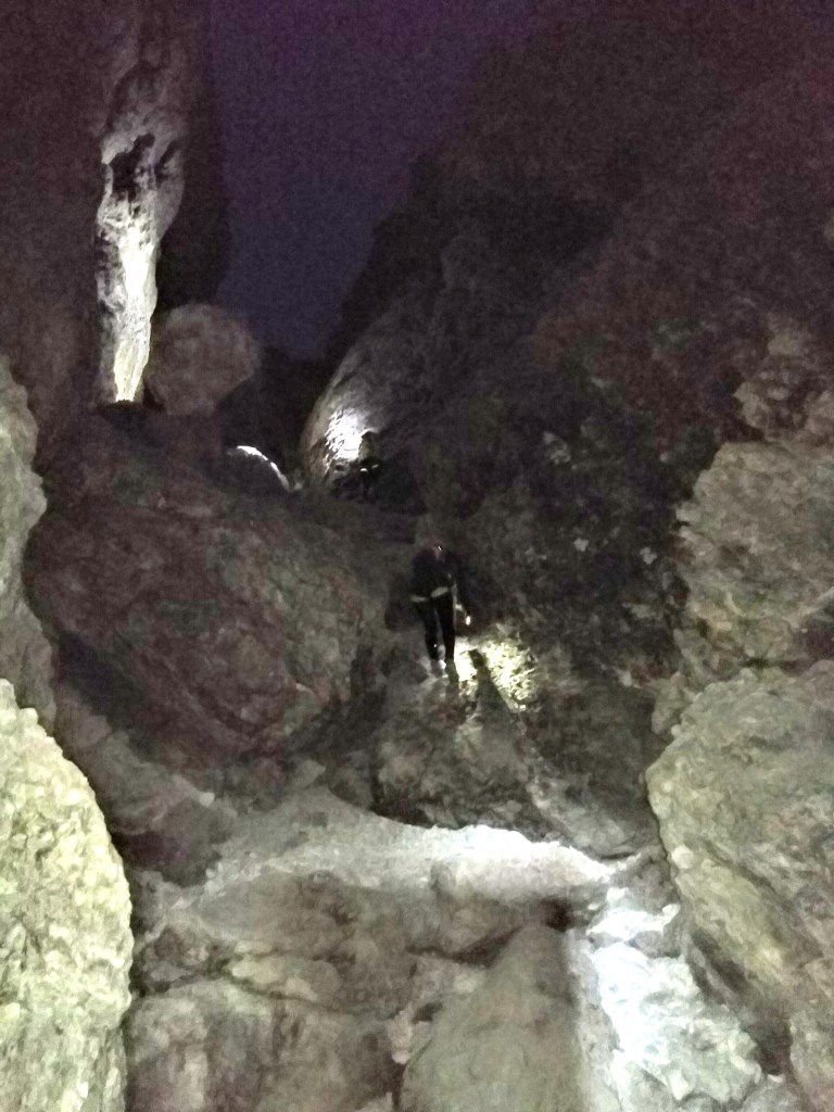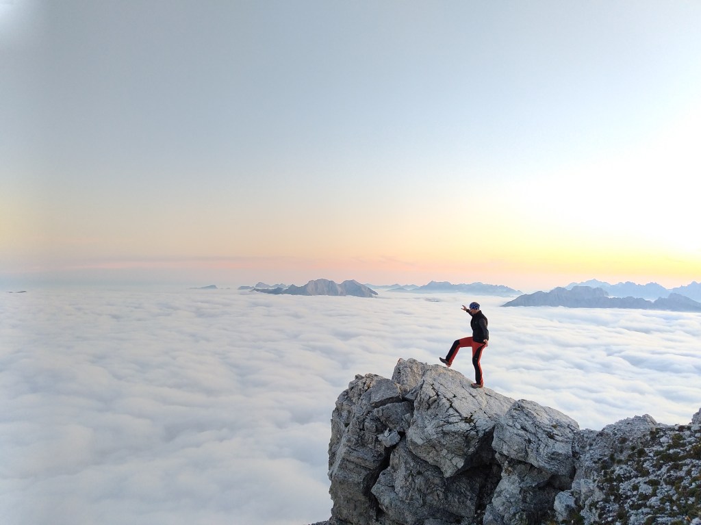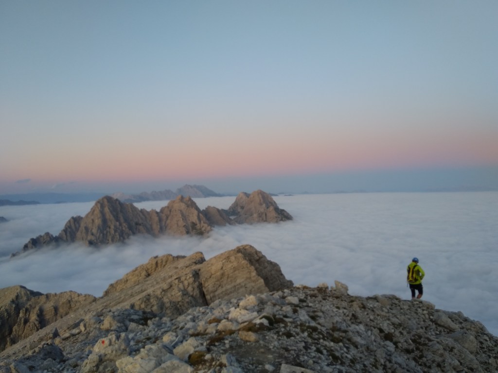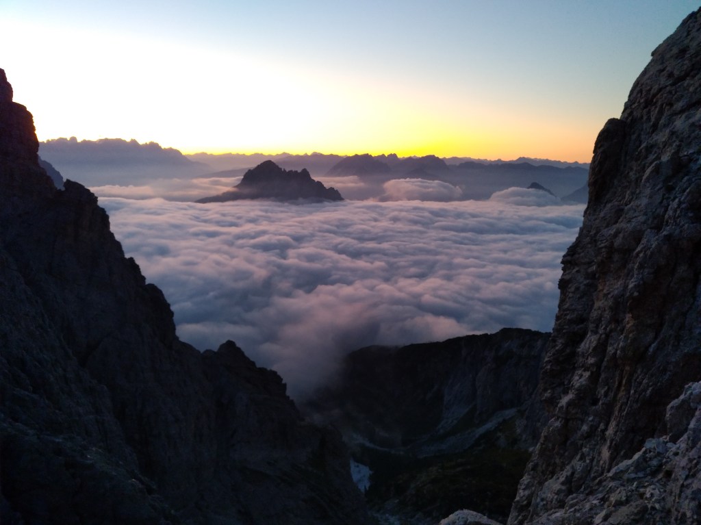 Saliamo quel sentiero che già dal nome invita al rientro a valle: il “Malavoglia” serpeggia stretto sulle ghiaie del Clap, giocando a rimpiattino tra le pareti e quei quattro abeti che vivono sopra i 1800m. La nebbia che ricopre questo calderone ghiaioso impregna lo spazio di umidità e quiete. Anche la montagna pare avere voglia di mutismo, una segretezza dal bianco lattiginoso che salendo perde consistenza. L’ascesa è rapida e sbuchiamo da un mare basso dov’eravamo inabissati proprio nei pressi dell’attacco della ferrata Gasperina. Incredibile come, nello spazio di qualche decina di metri, prospettive umori e pensieri cambino così repentinamente.