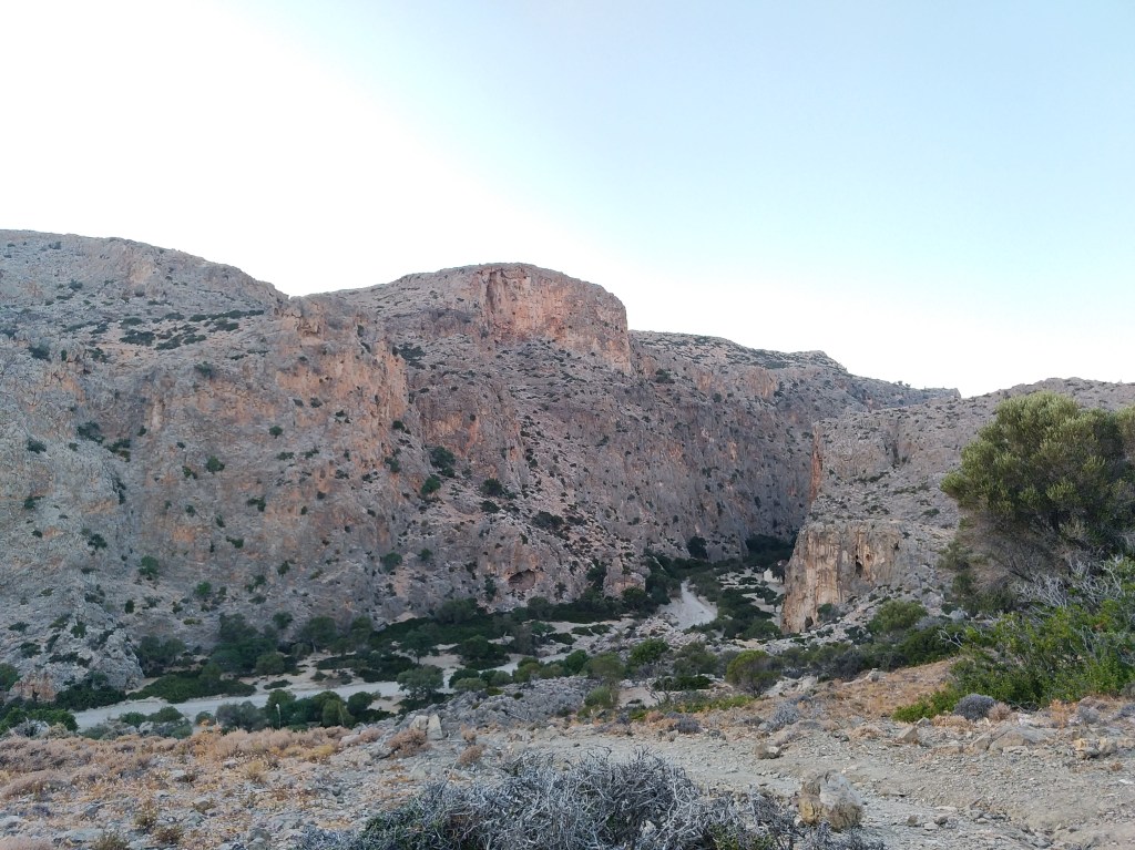 Ci stiamo dirigendo verso la gola di Agiofarago (Gorge of Saints) dietro consiglio della signora del noleggio, ma Google maps ci indirizza lungo una strada sterrata decisamente poco adatta alla nostra auto così decidiamo di raggiungere la meta da Kaloi Limenes. Da lì, lungo la rocciosa costa, ci aspetta una passeggiata di un’ora circa accarezzati dal vento che increspa questo Mediterraneo dal blu intenso: percorso decisamente meno frequentato e più nei nostri gusti da montanari poco avvezzi al classico turismo. La gola si prospetta davanti a noi quasi al suo sboccare al mare. Una piccola chiesa greco-ortodossa (Aghios Andonios) del XIV o XV secolo sorge in quel luogo circondata da pareti calcaree e da ulivi. Scopriremo poi si tratti di una delle prime testimonianze della presenza cristiana nell’area assieme alla vicina piccola grotta protetta da una grata, luogo dove gli asceti del Monastero di Odighitria, presente all’imbocco della gola, si ritiravano un paio di volte l’anno.