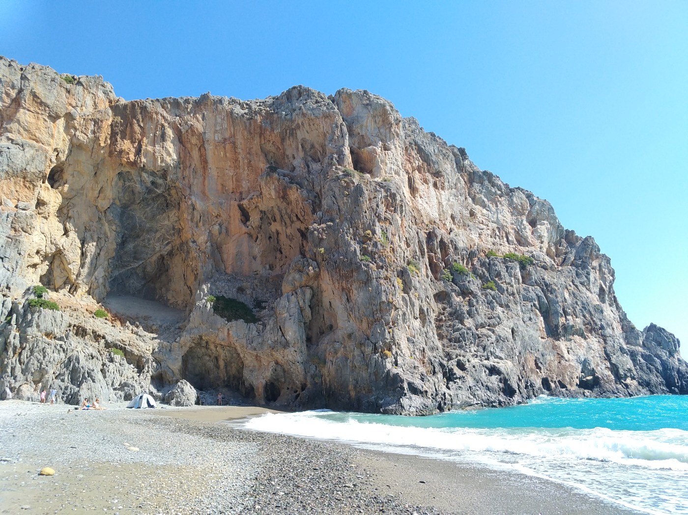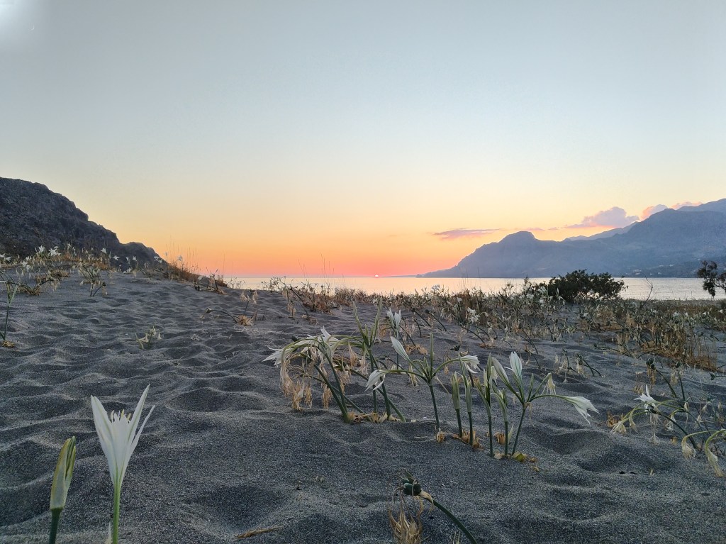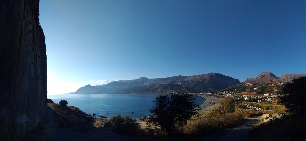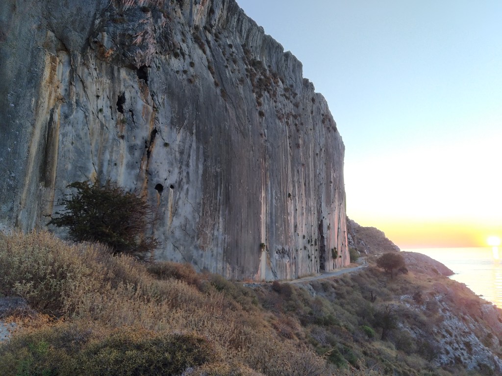 La mattina successiva, dopo un’omelette per colazione fatta sicuramente con almeno quattro uova, ci avviamo verso la falesia per cui mi ero fissata cercando alacremente informazioni su internet durante l’attesa in aeroporto: Plakias. Un nome, una garanzia: la parete che ci si presenta dinanzi pare artificiale per la sua forma e “placcosità”. È letteralmente una lastra calcarea verticale. Impressionante. La zona è discretamente frequentata dai turisti trovandosi a pochi passi da una spiaggia meravigliosa (la falesia è proprio sopra all’area nudista della baia!). Quando raggiungiamo la parete in tarda mattinata già una decina di climbers sono alle prese con essa e fortunatamente possiamo chiedere a un trio francese la possibilità di consultare la guida (decisamente più aggiornata e precisa del sito). Riusciamo così a scalare nell’ombra fino al tramonto essendo la parete esposta a nord-ovest; ci concediamo poi un bagno rigenerante nelle acque che si tingono del rosso sole che vi si tuffa.