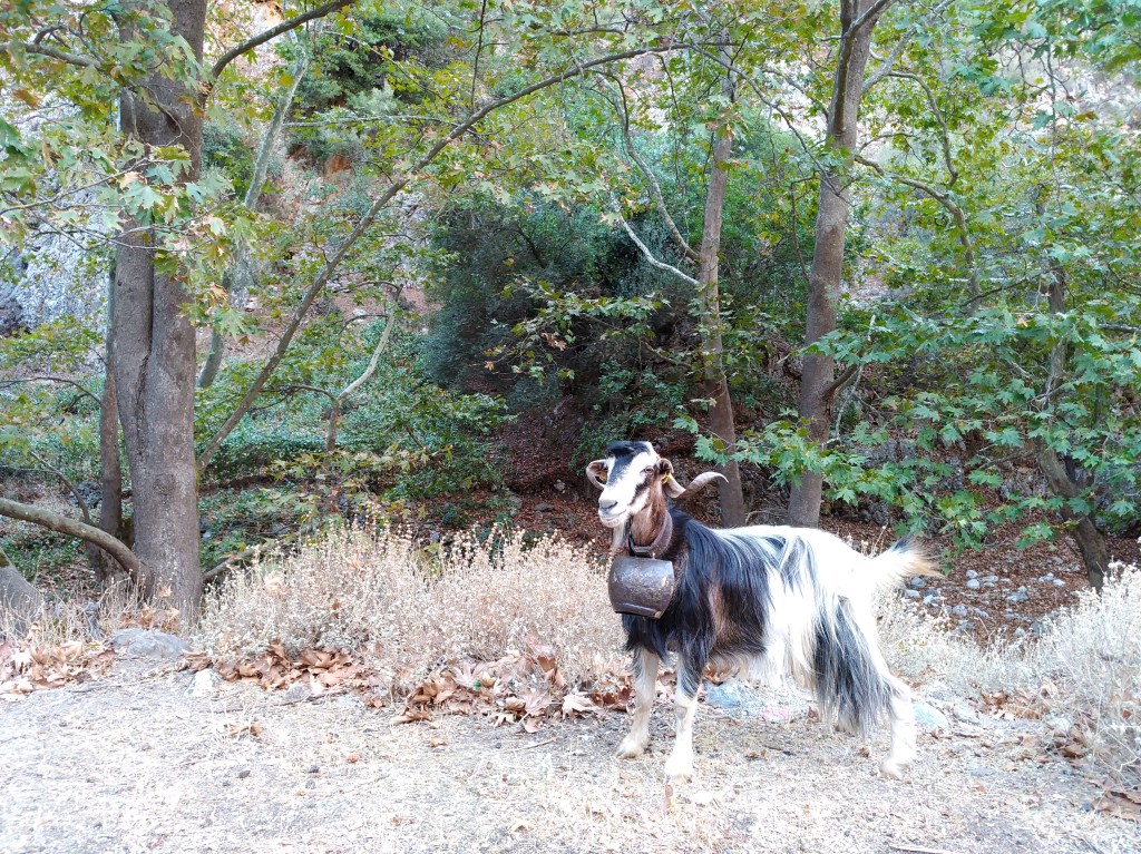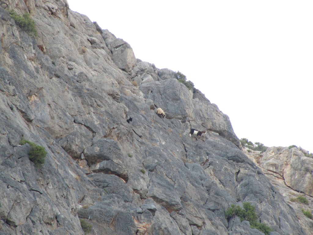Guardo verso l’alto e sento un vivace belare e un piccolo sasso volare verso la strada appena sottostante: capre. Pare a Creta ci siano più capre che abitanti… e come scalano! Estraggo dal sacco da recupero orgogliosa il casco e lo indosso a mo’ di soldatino pronto alla battaglia: sono pronta ad affrontare le scariche caprine! Ci divertiamo sul calcare rossastro con tiri fisici divertenti e restiamo a farci fotografare dai turisti finché non cominciamo a sentire i morsi della fame e la stanchezza. Una veloce visita al borgo che pare una grande osmiza triestina e ci dirigiamo verso un paesino in una gola limitrofa dove abbiamo prenotato per la notte: un’ora di macchina per stradine di montagna e almeno un centinaio di pecore dopo ci ritroviamo in quello che pare essere un revival balcanico anni ‘90: un albergo attempato con un gestore dai lineamenti duri e baffi pronunciati, di fronte una taverna molto rustica con una tavolata di militari in mimetica che sorseggiano goliardicamente vino e fumano con i kalashnikov poggiati al tavolo. Scopriremo la mattina di essere finiti nel paese più vicino all’imbocco della gola di Samaria, meta di un intenso turismo per via del parco nazionale ed un trekking che vi si snoda per 16 km raggiungendo il mare. Incantati dalle aspre montagne ci balenata l’idea di provare questa esperienza, ma veniamo dissuasi dal viavai turistico e dai 5 euro di ingresso per una passeggiata che non ci potremmo godere per il poco tempo e per la scarsezza del cibo che abbiamo nello zaino. Facciamo dietrofront tornando alle falesie del giorno precedente e fermandoci ad un settore con una piccola grottarella che strapiomba con un calcare giallo pulitissimo. Ci accompagna un clima caldo e ventilato, capre, pecore e turisti curiosi che ci fotografano.