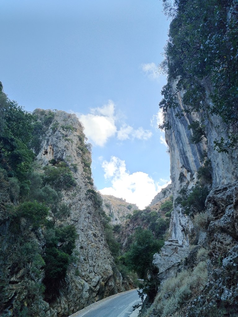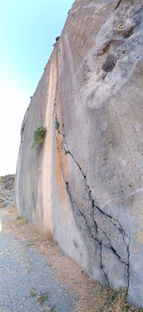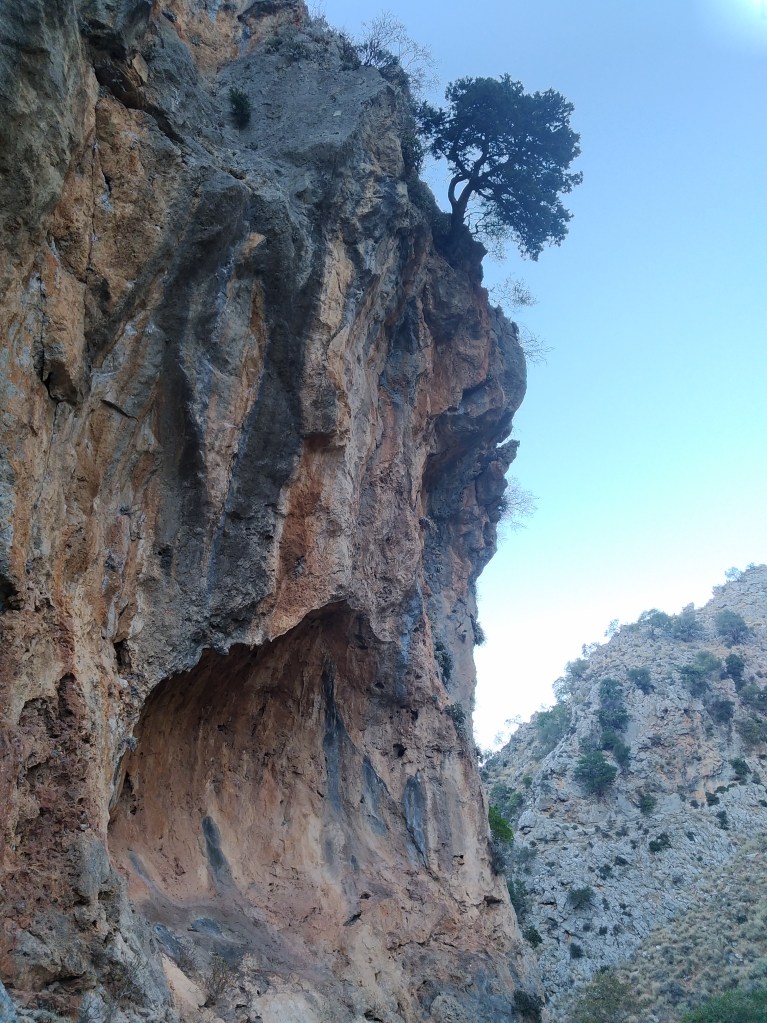 Therisso, un piccolo paesino incastonato a sud di Chania (una delle principali città dell’isola, sulla costa settentrionale), è la meta successiva. Dopo uno smodato tempo percorso in auto imbocchiamo la stretta gola verdeggiante: nella parte settentrionale dell’isola il clima è decisamente più clemente e permette una vegetazione più rigogliosa tant’è che la prima parte della strada è circondata da magnifici platani e non capiamo bene dove possano essere questi settori di cui parla il sito finché, dietro ad una curva, ci si presenta un’ immensa parete strapiombante con tanto di strane conformazioni rocciose pseudocarsiche. Mi fanno ancora un po’ male mani e piedi, ma la curiosità aumenta ad ogni curva della stretta stradina: non sappiamo che settore scegliere ed infine ci fermiamo estasiati davanti ad uno con delle pareti rossastre e alcuni tiri apparentemente sul sesto grado. Fortunatamente c’è un greco con due giovani ragazze che arrampicano e proviamo a chiedere informazioni; pare sia uno dei chiodatori e ci consiglia questa parete assieme a “the big wall” poco più avanti. Siamo così stufi di starcene seduti che decidiamo di restare lì e provare quelle vie dai nomi evocativi (una si chama εφιάλτης, incubo!).
