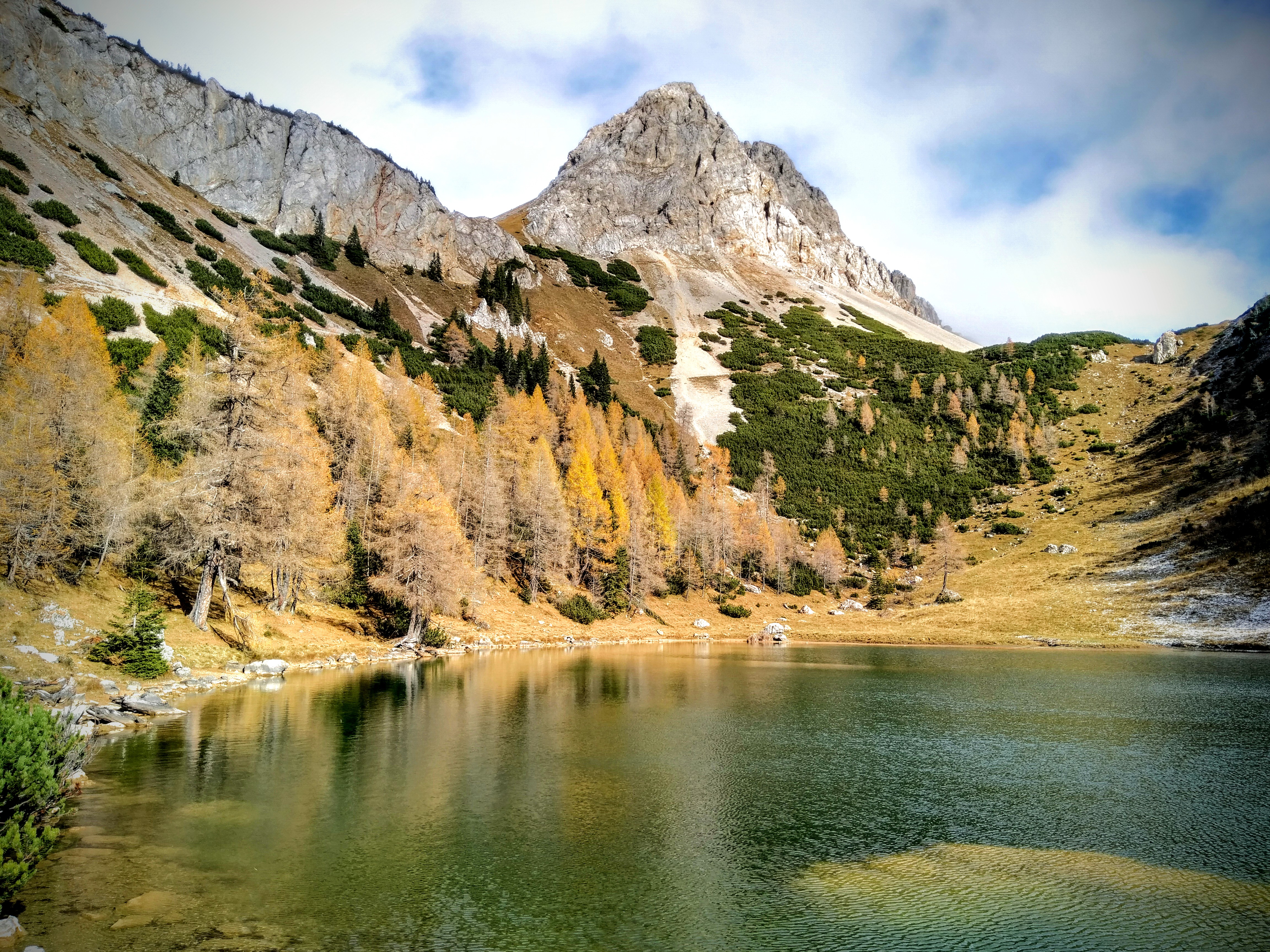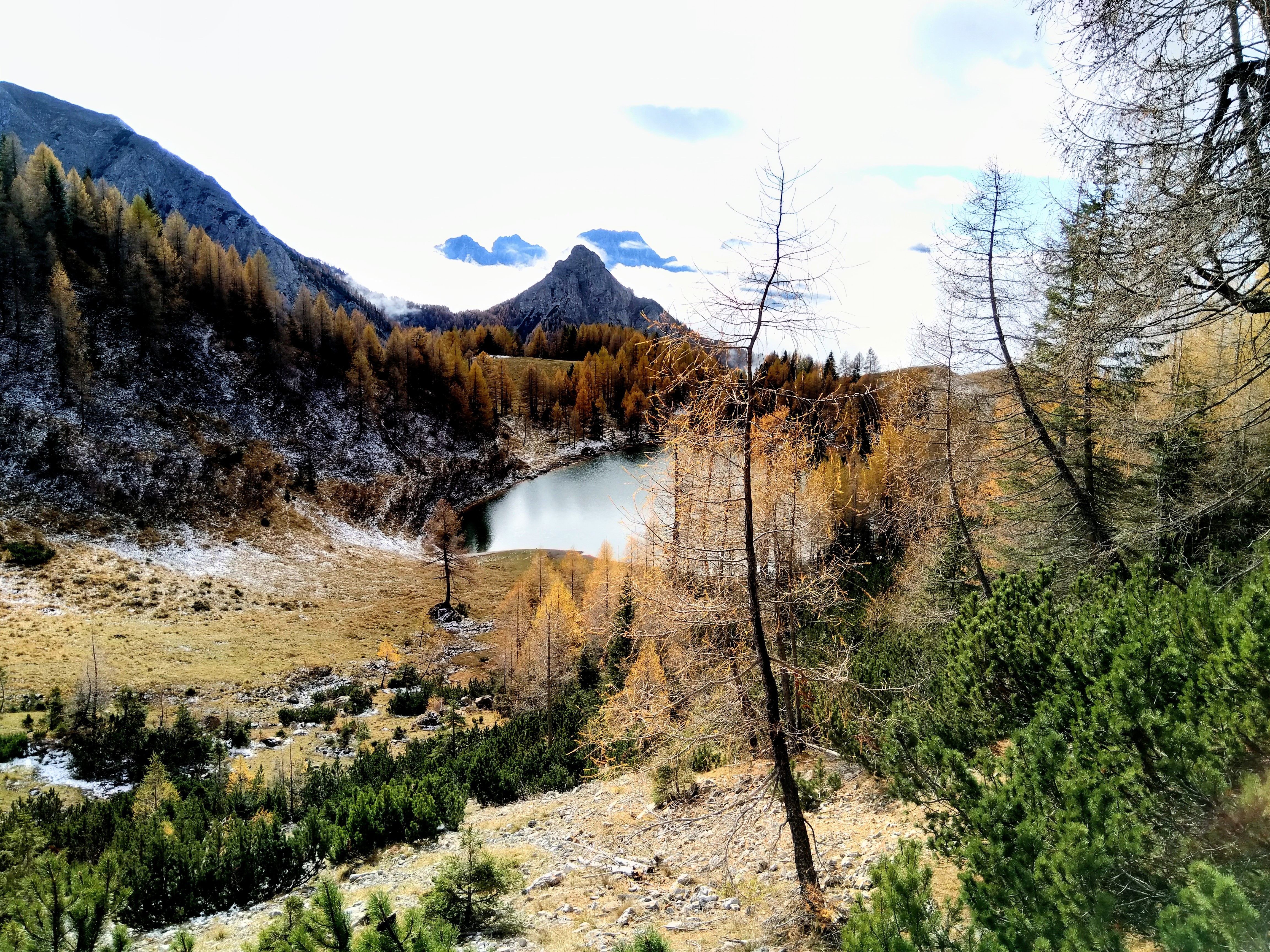 Saliamo ancora. Sappiamo che la perla della zona è racchiusa in una conca oltre questi boschi, verso quota 1800. Una perla che si svela all’ultimo, nascosta dal sipario di larici che nelle giornate d’autunno sfavillano nei colori caldi come fossero il rimasuglio dell’estate.