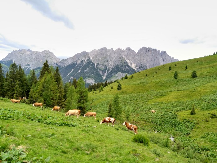 Ed eccomi qua, sbucato dal bosco in vista di quelle formiche bianche che si sono trasformate in delle placide manze al pascolo. Sono in vista di Malga Malins, finalmente raggiunta. L’edificio è posto in un contesto idilliaco, con le Dolomiti Pesarine dall’altro lato della valle e che forse, oggi, sono anche un po’ gelose. Ma il posto è talmente bello che mi concedo una lunga pausa. Il camino fuma, l’odore della tradizione della nostra terra: odore di faggio, segno che l’affumicatura delle ricotte è in corso. E scoprirò successivamente che la malga gira a pieno regime, con la gentile gestrice che facendomi da Cicerone mi porta negli angoli più intimi dell’edificio dove il casaro accarezza le nuove forme in produzione e le braci fumano essenze da trasmettere a quei pezzi bruniti che diverranno prelibatezze sulla tavola.