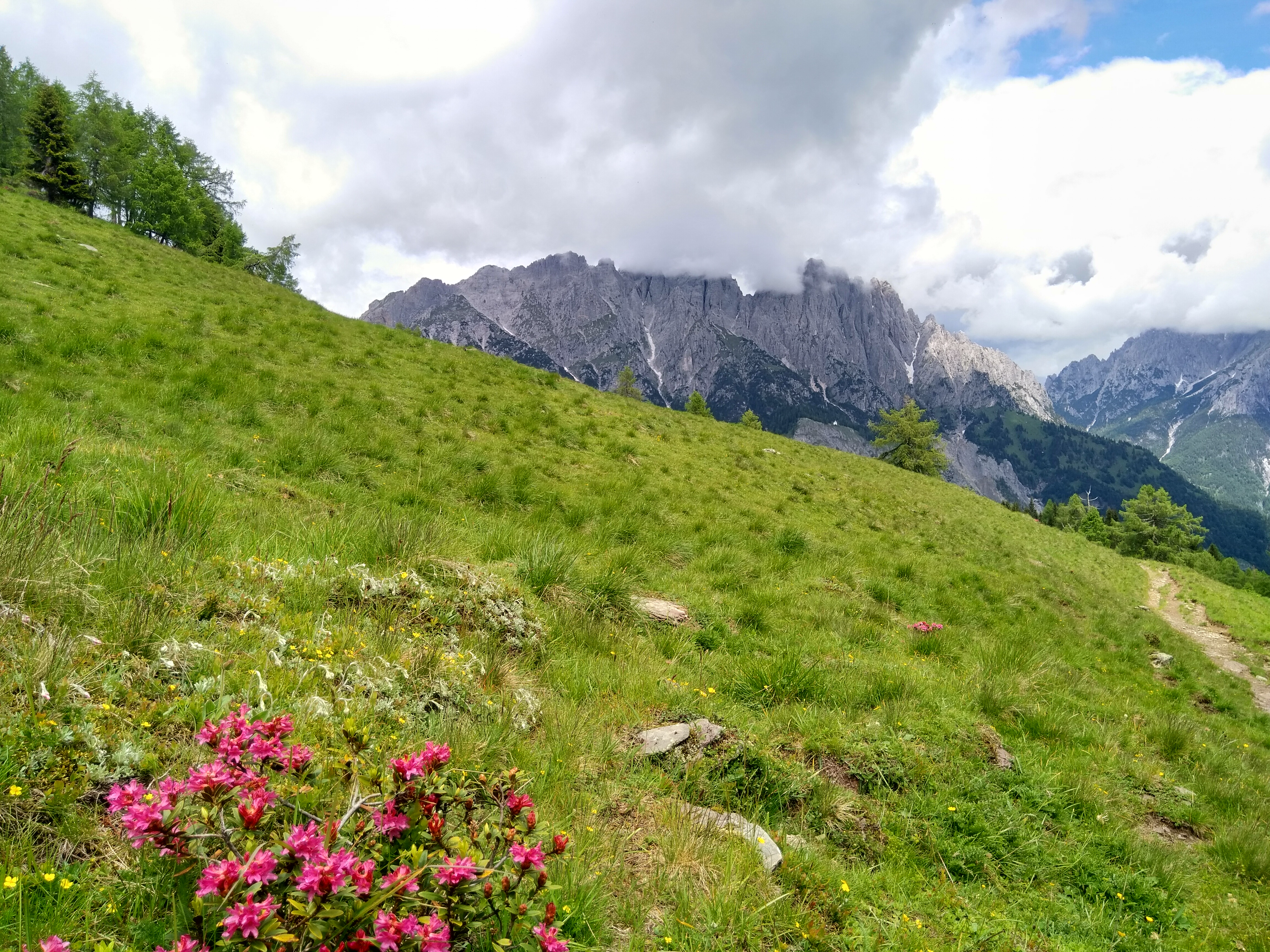 Meglio non fare da parafulmine! Scendo zigzagando verso i laghi di Festons, che paiono dall’alto delle mie riprese aeree il Rio delle Amazzoni. L’idea di proseguire sulla dorsale di cresta viene abortita alle prime gocce che mi raggiungono. Continuo allora verso la conca di Malga Rioda, che vedo in lontananza oltre i giardini di rododendri che mi circondano.