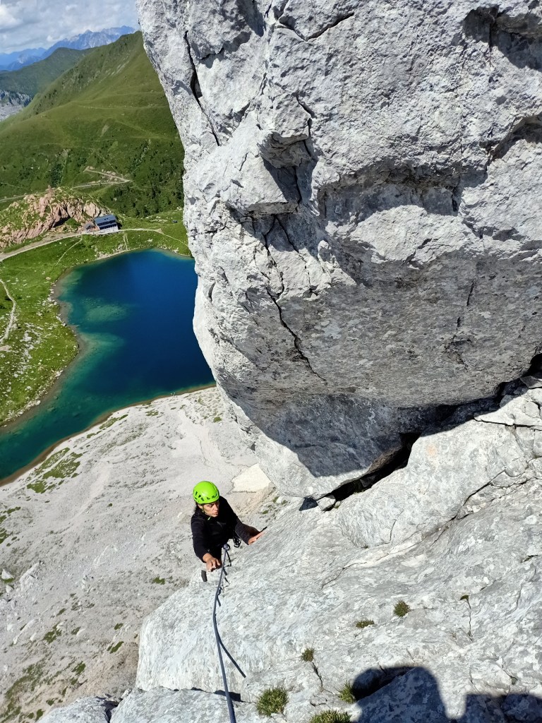 Tizi mi raggiunge veloce, forse anche lei vuole prendere le distanze dal popolo vociante del lago. Quindi non mi perdo in chiacchiere e seguito verso destra dalla sosta, lungo una bella placca compatta con un movimento delicato. Tutto risulta ottimamente attrezzato con fix da 10mm e la progressione propone stupende placche del colore del cielo. E’ qua che il calcare delle pareti si fonde con le acque del lago che ci fanno da sottofondo, in una tinta indefinibilmente affascinante. Alla placca segue una facile fessura prima della sosta (5C – 25m – 7spit).