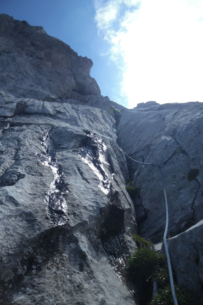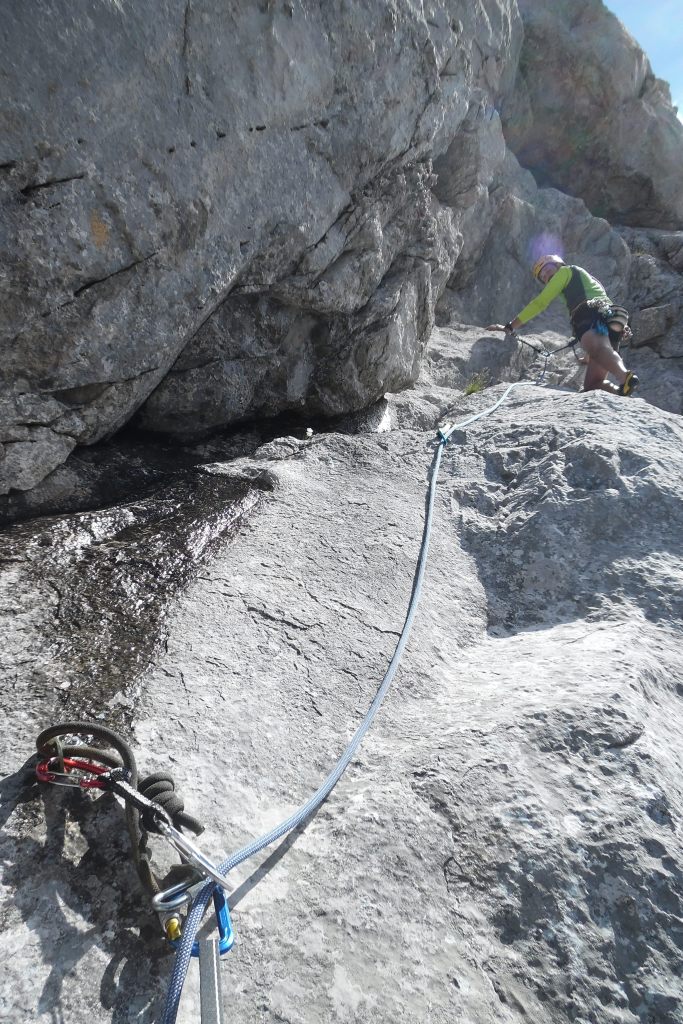 La sesta lunghezza conduce all’aggiramento dello spigolo su rocce particolarmente rotte e delicate. Le uniche solide sono state sfruttate, in alto, per posizionare i punti di ancoraggio in maniera adeguata e cerco di restare alto sotto a queste rocce per muovere meno sassi possibili. Nonostante tutto, il fatto di avere girato “l’angolo” della parete mi da’ una certa tranquillità visto che eventuali pietre smosse non interesserebbero la sosta ma cadrebbero nel vuoto verso il rifugio Lambertenghi. Mentre recupero Tizi in sosta ho tempo di ricordare le belle ore passate con gli amici Stefano, Alex e Giulia dentro a quella struttura che attualmente è sventrata dai lavori di sistemazione che il comune sta apportando. E mi chiedo se non fosse stato possibile trovare un compromesso, una via meno dolorosa per la realizzazione di queste opere che ho sotto il naso. Il fatto che sia stata chiusa, spero momentaneamente, la loro carriera da gestori dopo tutti i sacrifici e le fatiche fatte la dice lunga. E nessuno quanto me può capire cosa rappresentino quelle 4 mura di vita estiva per chi le vive, così come quanto dura sia lasciare il costruito e un pezzo di vita per l’ignoto. Tiziana arriva in sosta e mi distoglie da questi pensieri che mi avviliscono, meglio così, meglio pensare alla roccia, all’arrampicata, a questo sole che ci sta scaldando fin troppo e al magnifico posto in cui stiamo facendo quello che ci piace. (3° – 20m – 3spit).