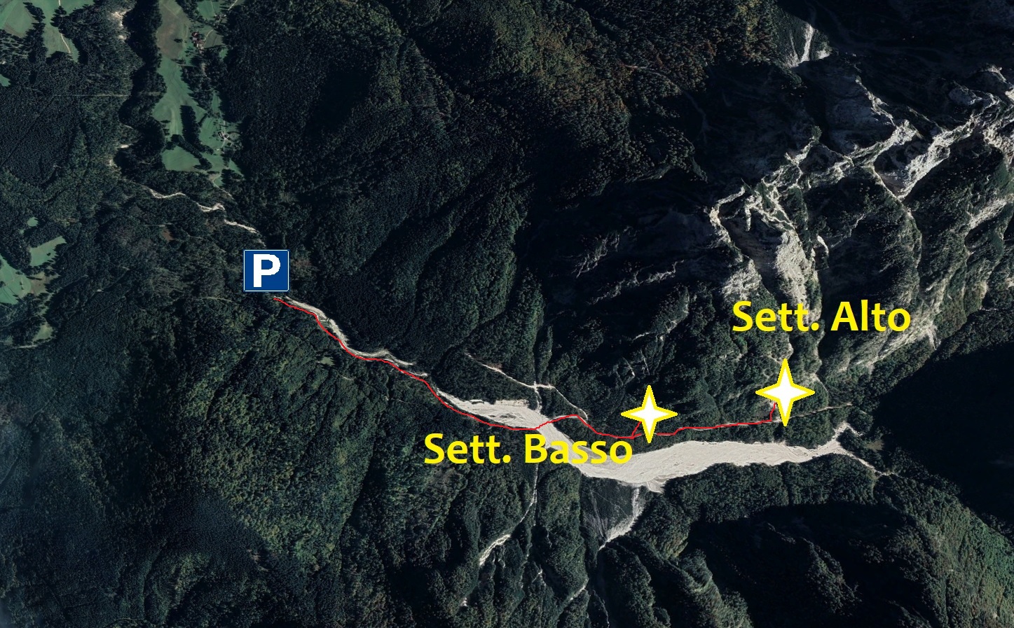 Accesso: da Tarvisio seguire la strada verso Fusine. Poco prima di un cavalcavia, svoltare a destra in salita seguendo le indicazioni per Rutte Piccolo. Oltrepassata questa frazione mantenere sempre la sinistra inoltrandosi nel bosco fino ad un grande piazzale di ghiaia con divieto al transito e cartelli indicanti le falesie (parcheggio). Lasciata l’auto si continua a piedi si strada sterrata, lungamente paralleli all’argine del torrente superando una centralina idroelettrica e oltrepassando poi l’alveo piatto in secca poco più in su. Seguitare sulla strada sterrata che risale nel bosco, in breve sulla sinistra di rinvengono i cartelli del settore basso (30 min) e con altri 5 minuti di camminata si è alla base del settore alto.
