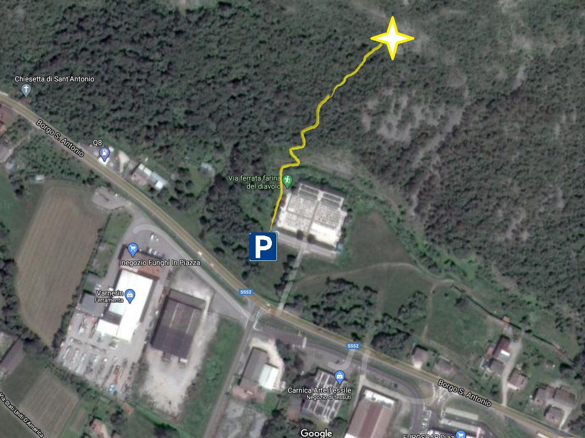 Accesso: da Tolmezzo lungo la SS52 verso Villa Santina, oltrepassata la rotonda all’ingresso del paese (nei pressi dell’Eurospar), tenere la destra raggiungendo in breve sulla destra il parcheggio nei pressi del cimitero.