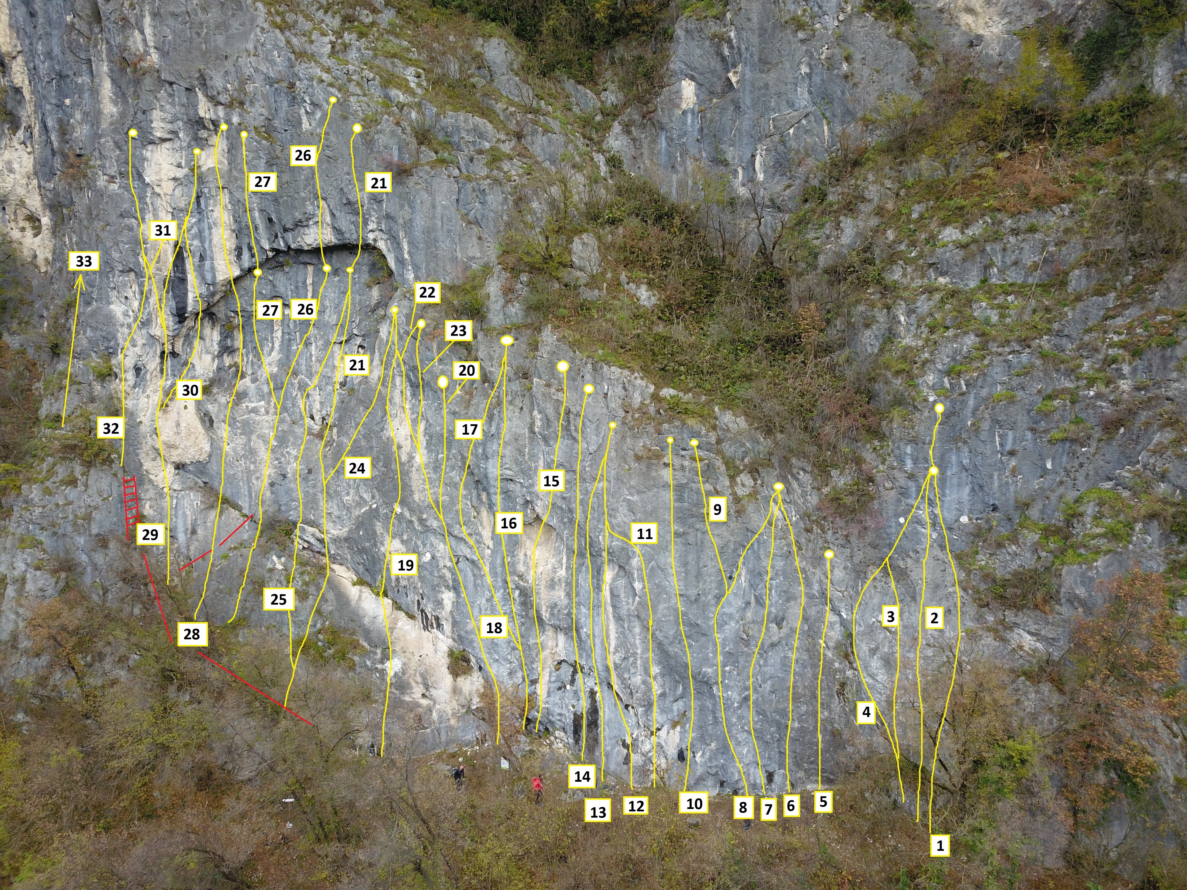 N.B. Attenzione, soprattutto in primavera, alla possibile caduta di sassi dall’alto. Si consiglia il casco di protezione e la permanenza alla base stando il più possibili prossimi alla partenza delle vie!