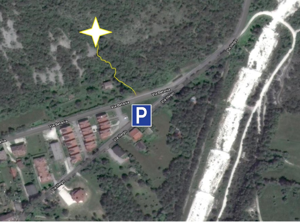 Accesso: da Tolmezzo risalire la strada principale della frazione di Betania che porta verso Illegio (indicazioni alla rotonda nei pressi del Bar Al Benvenuto). In corrispondenza delle ultime case dell’abitato, vicino ad un bivio, la parete è visibile in alto a sinistra sulle dorsali rocciose soprastanti. Piccolo parcheggio erboso antistante a delle villette a schiera azzurre.