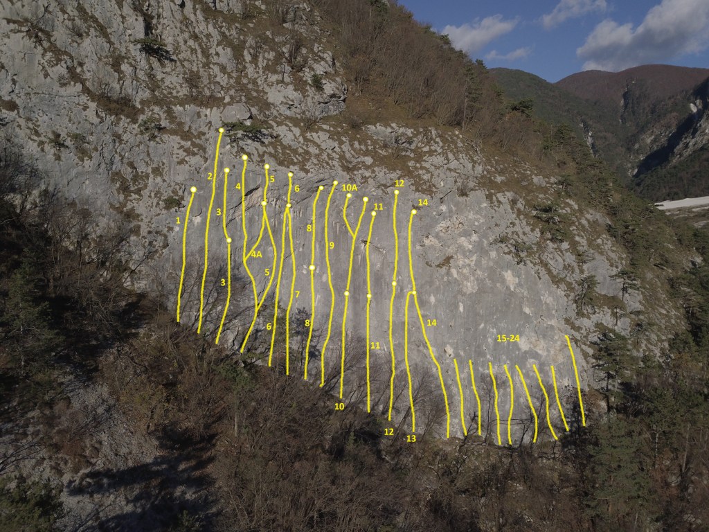 Le vie di destra risultano in fase di ultimazione e si sconsiglia (attualmente) la ripetizione in attesa dell’ok del chiodatore (Stefano Veritti – che si ringrazia anche per la disponibilità nella stesura della presente topo).