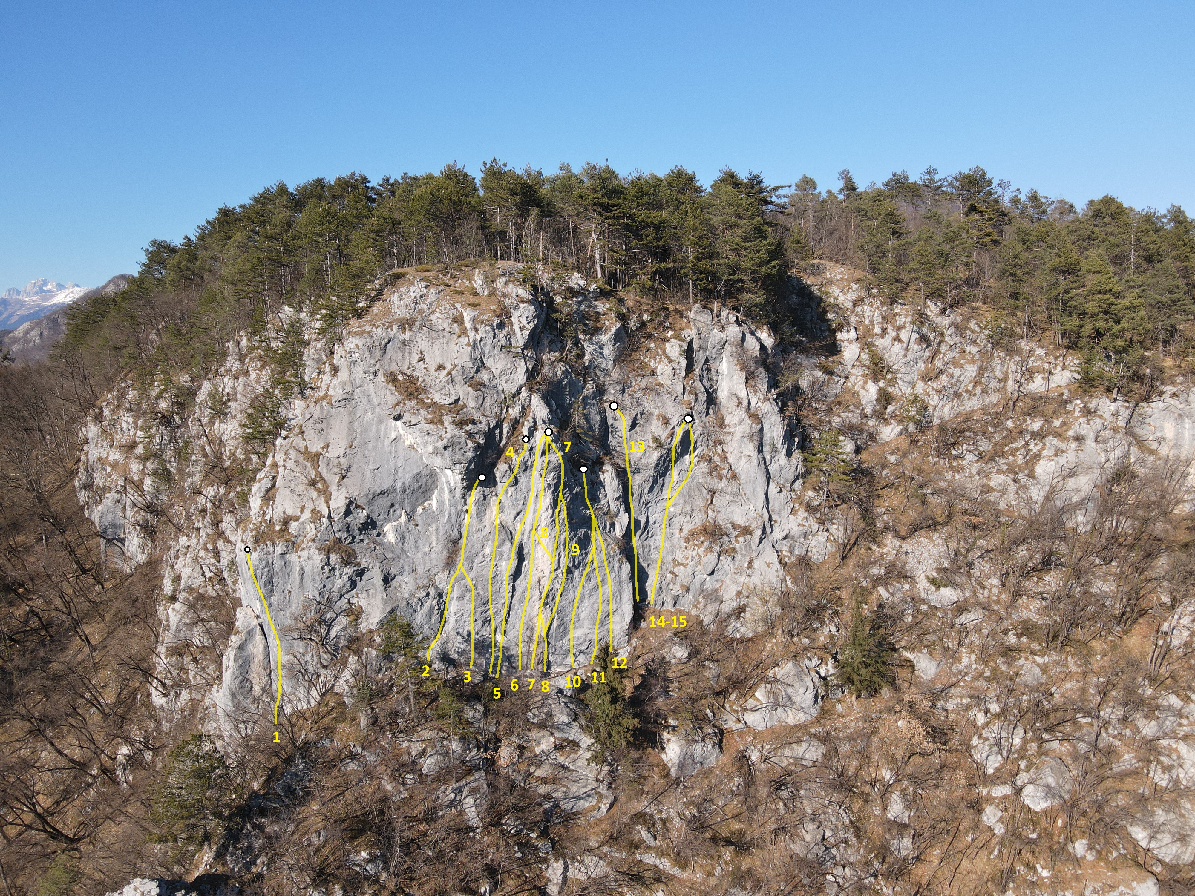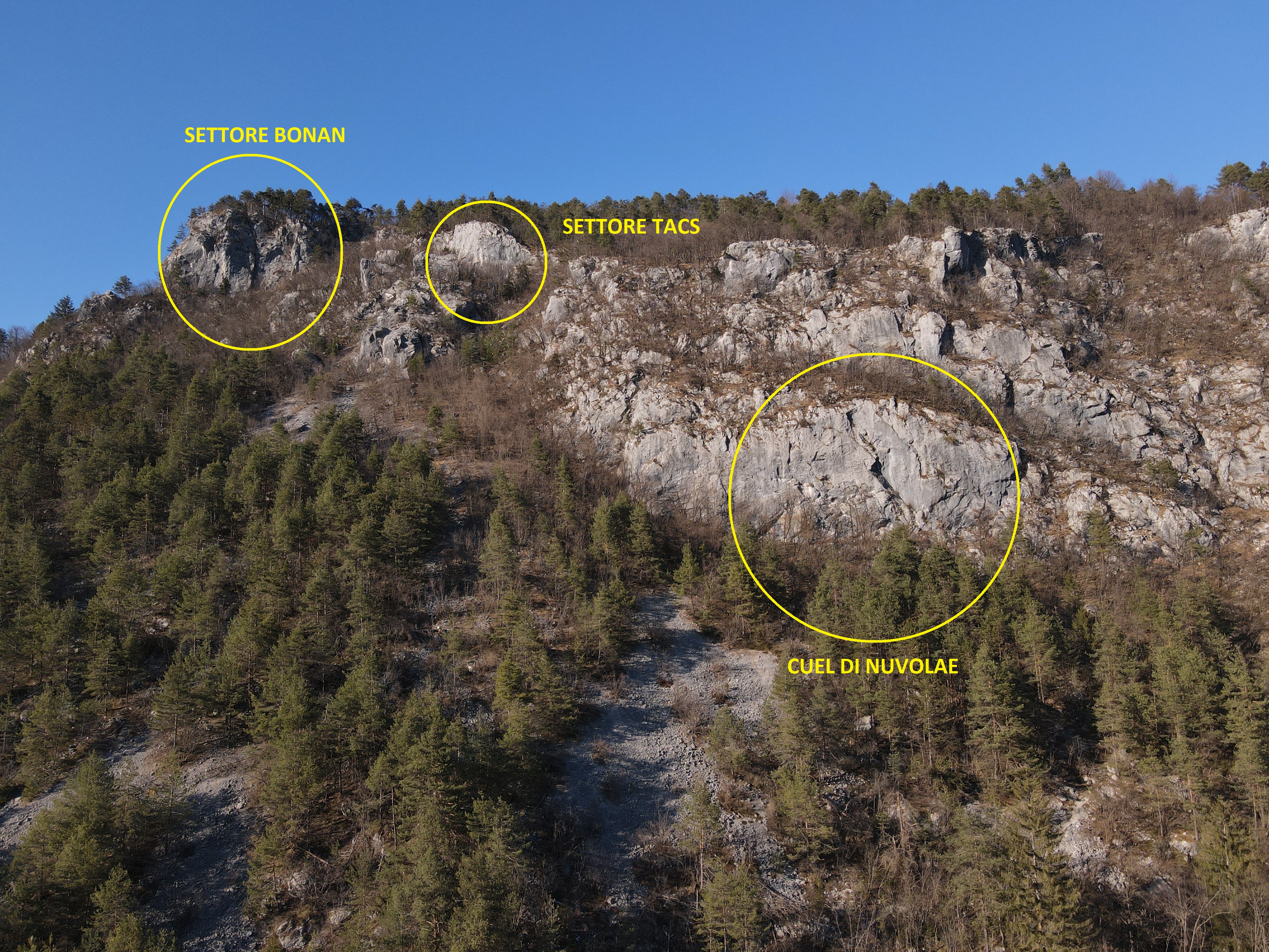 Tempo totale: 10 min alle vie del settore Cuel di Nuvolae, 20 min al settore Bonan e 23 al settore Tacs.
