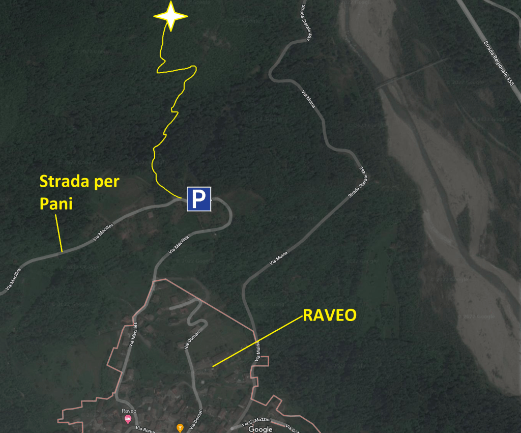 Accesso: da Tolmezzo sulla S.S. 52 in direzione di Villa Santina e quindi verso l’abitato di Raveo. All’ingresso del paese, alla piccola rotonda, mantenersi verso destra oltrepassando in seguito il monumento della piazzetta successiva per inoltrarsi in leggera salita nell’abitato. Poco prima di una curva a sinistra, in corrispondenza di una fontana, sulla destra si stacca la strada che sale verso la località di Pani (indicazioni). La strada sale tra le ultime case del paese e raggiunge un piccolo parcheggio sulla destra poco oltre una curva/tornante nei pressi di uno stavolo.