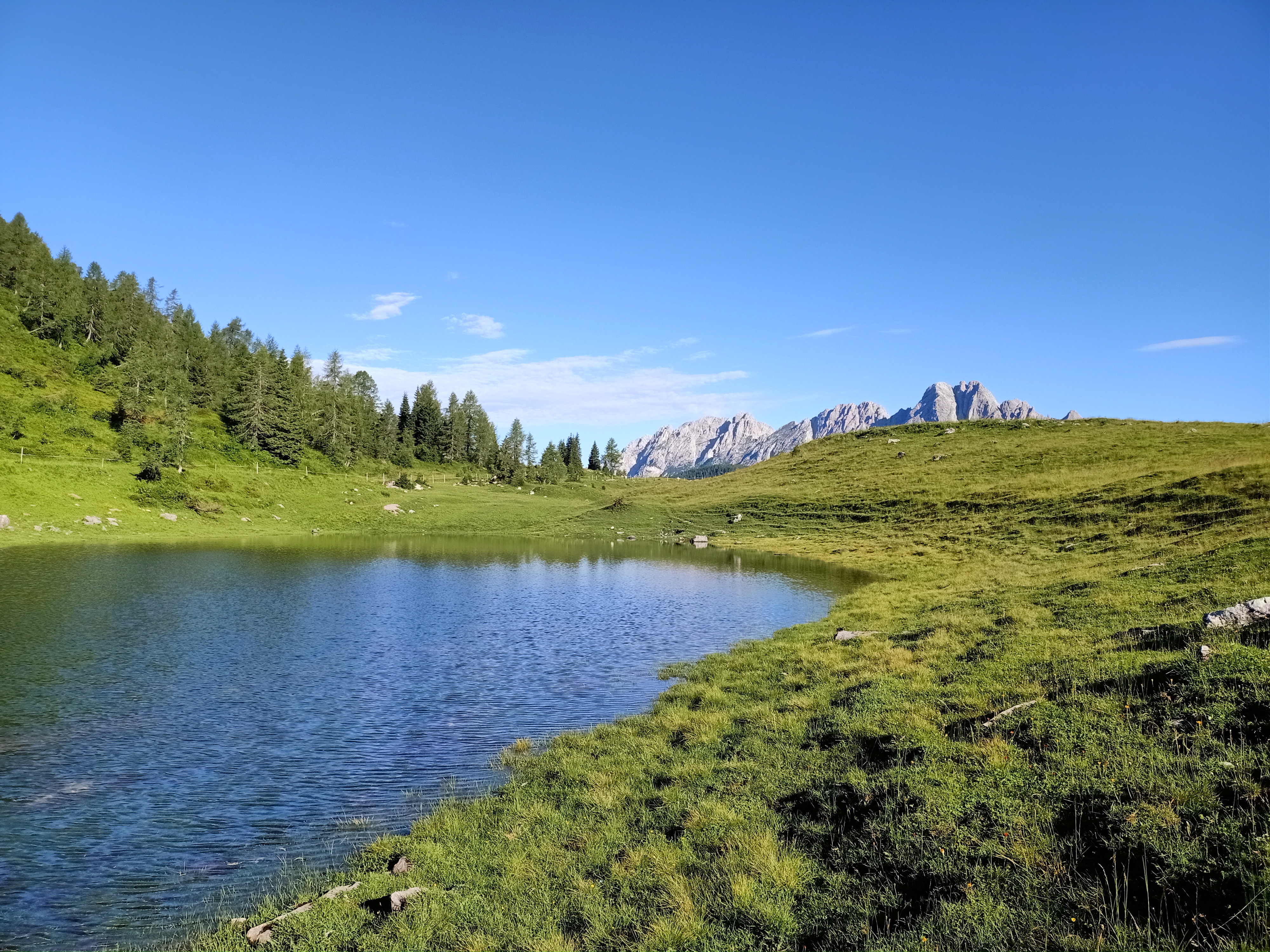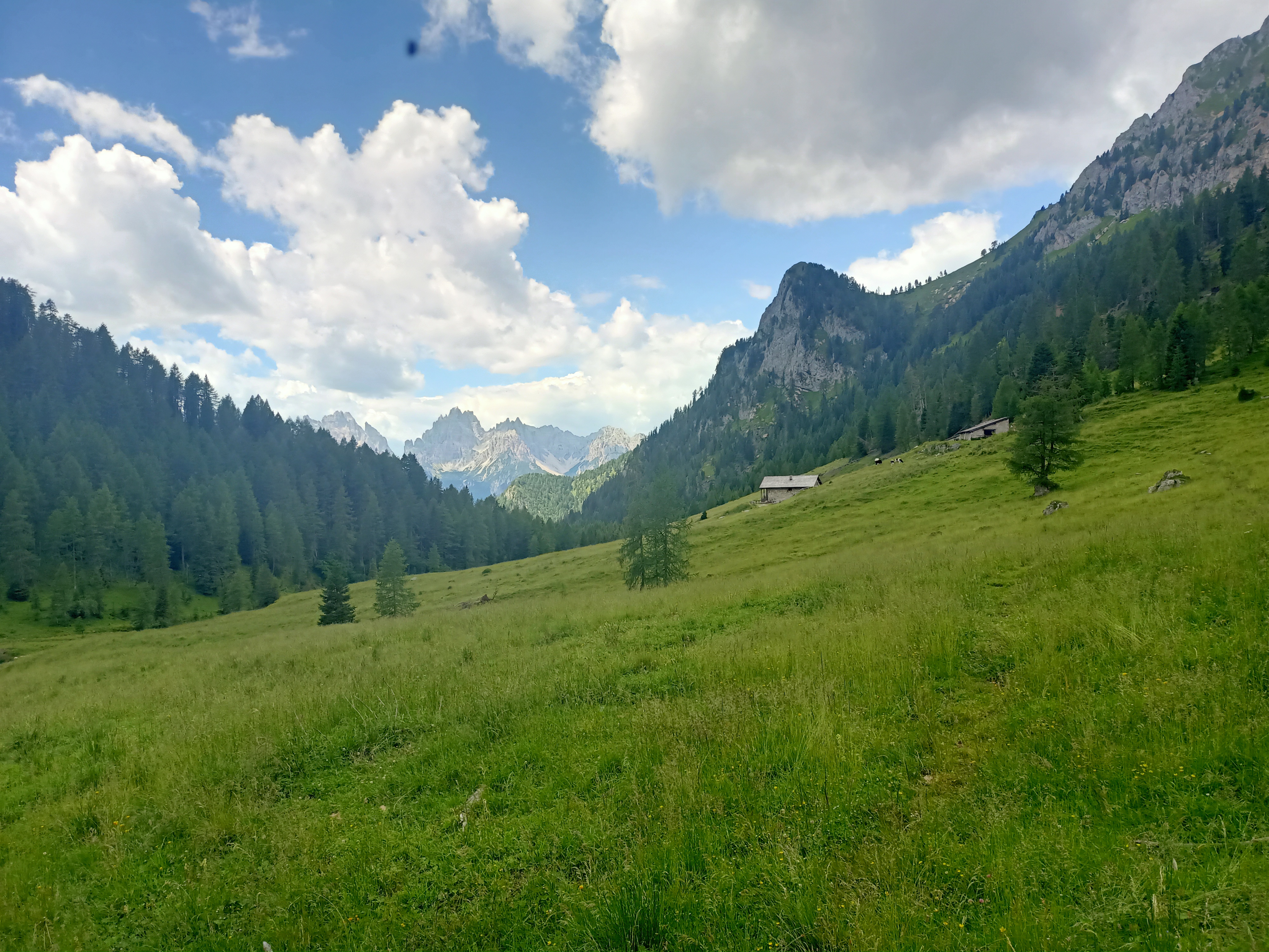 Discendo lungo la piccola valle del torrente Tolina, lungo tappeti bucolici di erbe, rododendri e piccoli alberi. Sento già lontano il suono di alcuni campanacci. Le mucche circondano gli ampi spazi di Casera Tragonia, oasi dal panorama assoluto sulle cime delle Dolomiti Friulane.