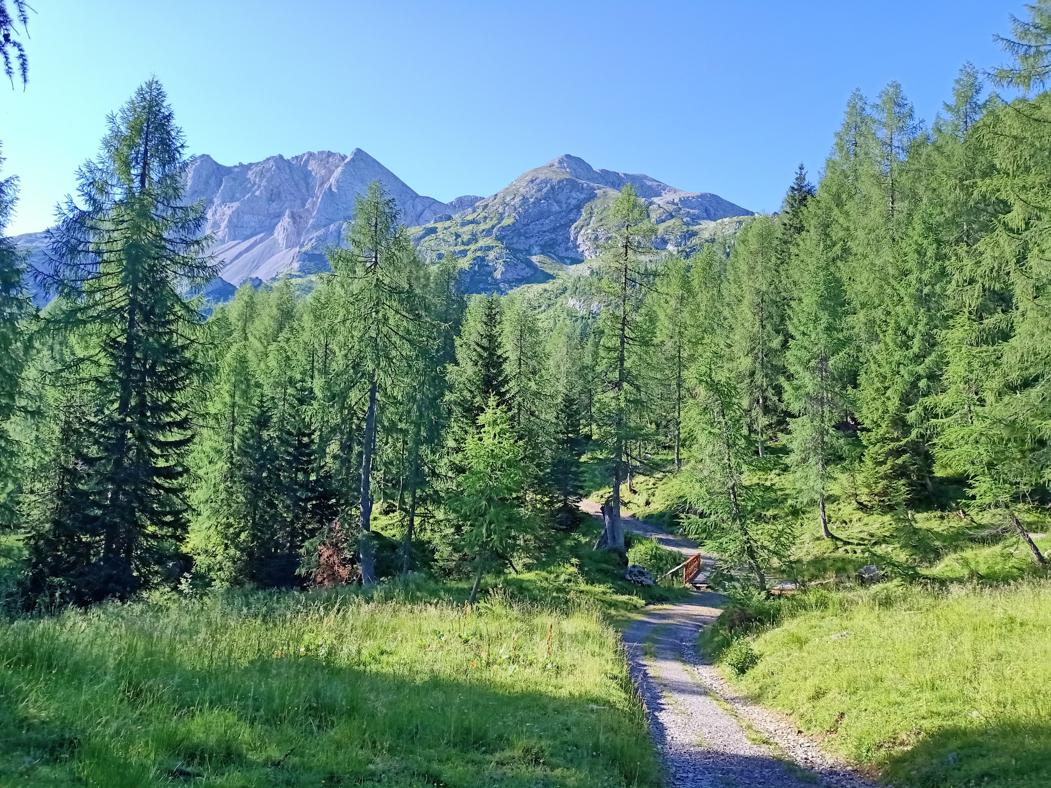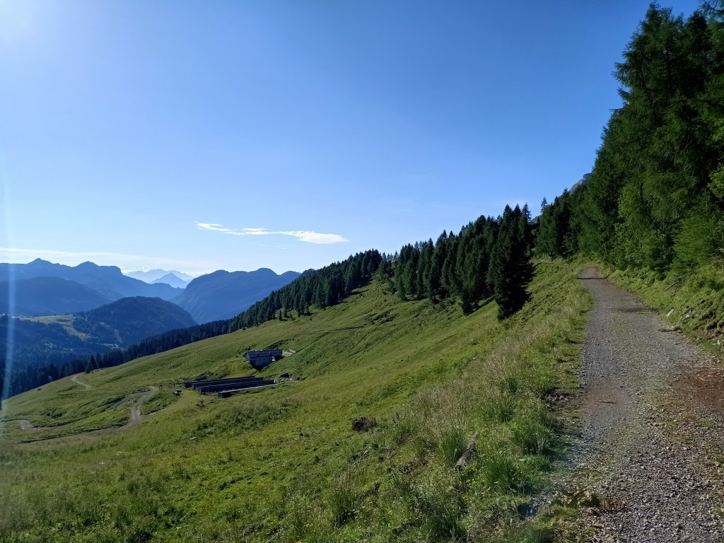 La lunga sterrata attraversa in leggera discesa una serie di praterie, di lariceti e di piccoli corsi d’acqua che cantano nonostante la tremenda siccità di quest’anno.