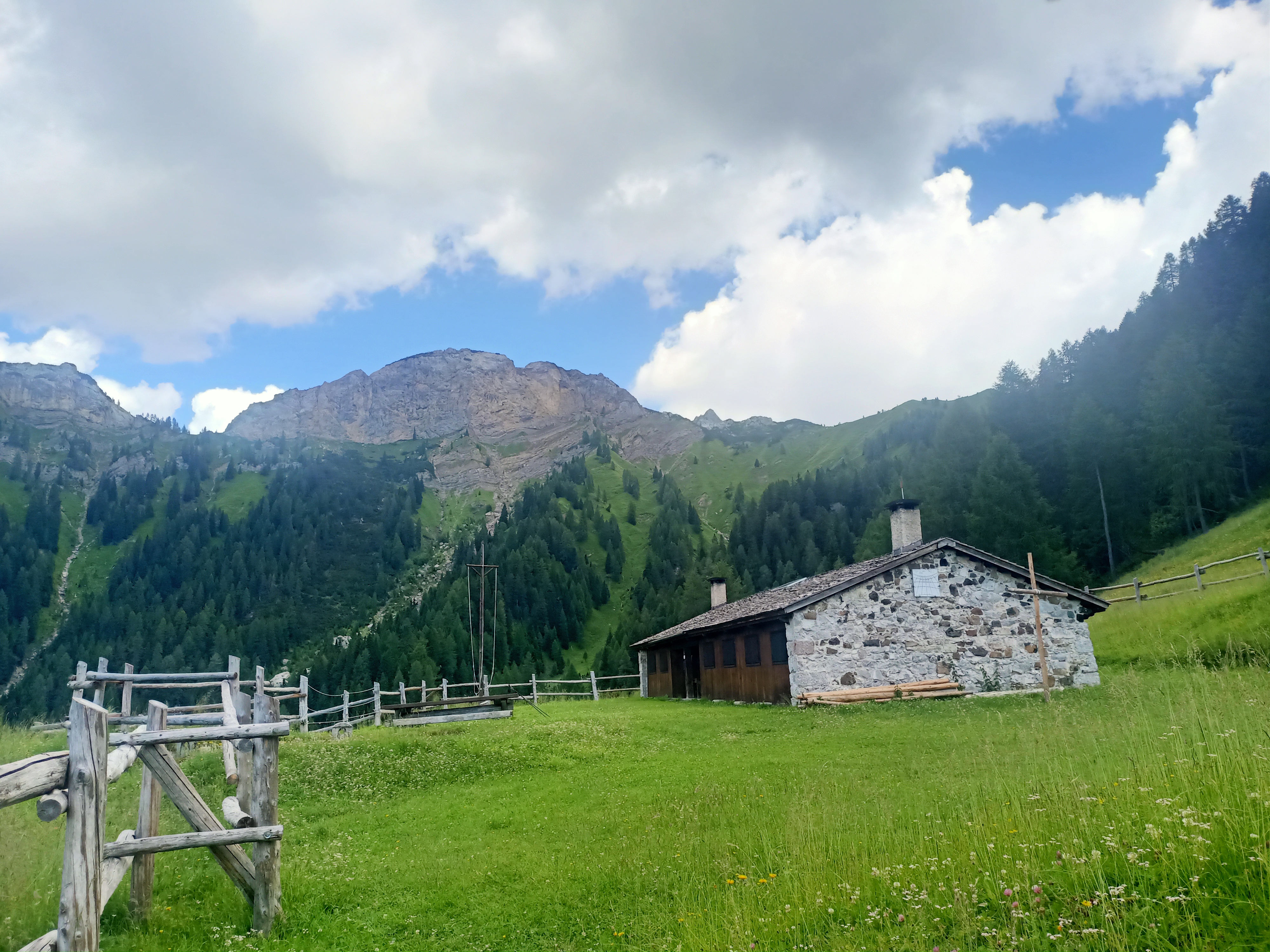 Ai primi lamponi a terra capisco di essere vicino alla casera. Spunta tra le erbe, grande nella sua realtà trasandata ed è simbolo di una vita alpina che è già storia andata. Vedere queste strutture in declino e abbandono mi fa sempre pensare a come sarà il futuro. E’ strano: le malghe, la vita di fatica e sacrifici che riempiva la nostra montagna solo fino allo scorso secolo, la cura per ogni piccolo fazzoletto di prato così lontano e così conquistato. Valori che rapportati all’oggi fanno, semplicemente, sorridere. O interrogarsi? Sul piatto della bilancia, meglio una vita votata all’essenziale, vissuta ai ritmi della natura nel rispetto di queste terre o un’esistenza bombardata da milioni di informazioni superflue? Con ritmi frenetici, sbattuti da una parte all’altra di una società che si definisce del progresso ma che, in fondo, ha ben poco di buono? Pensieri di un solitario viaggiatore.