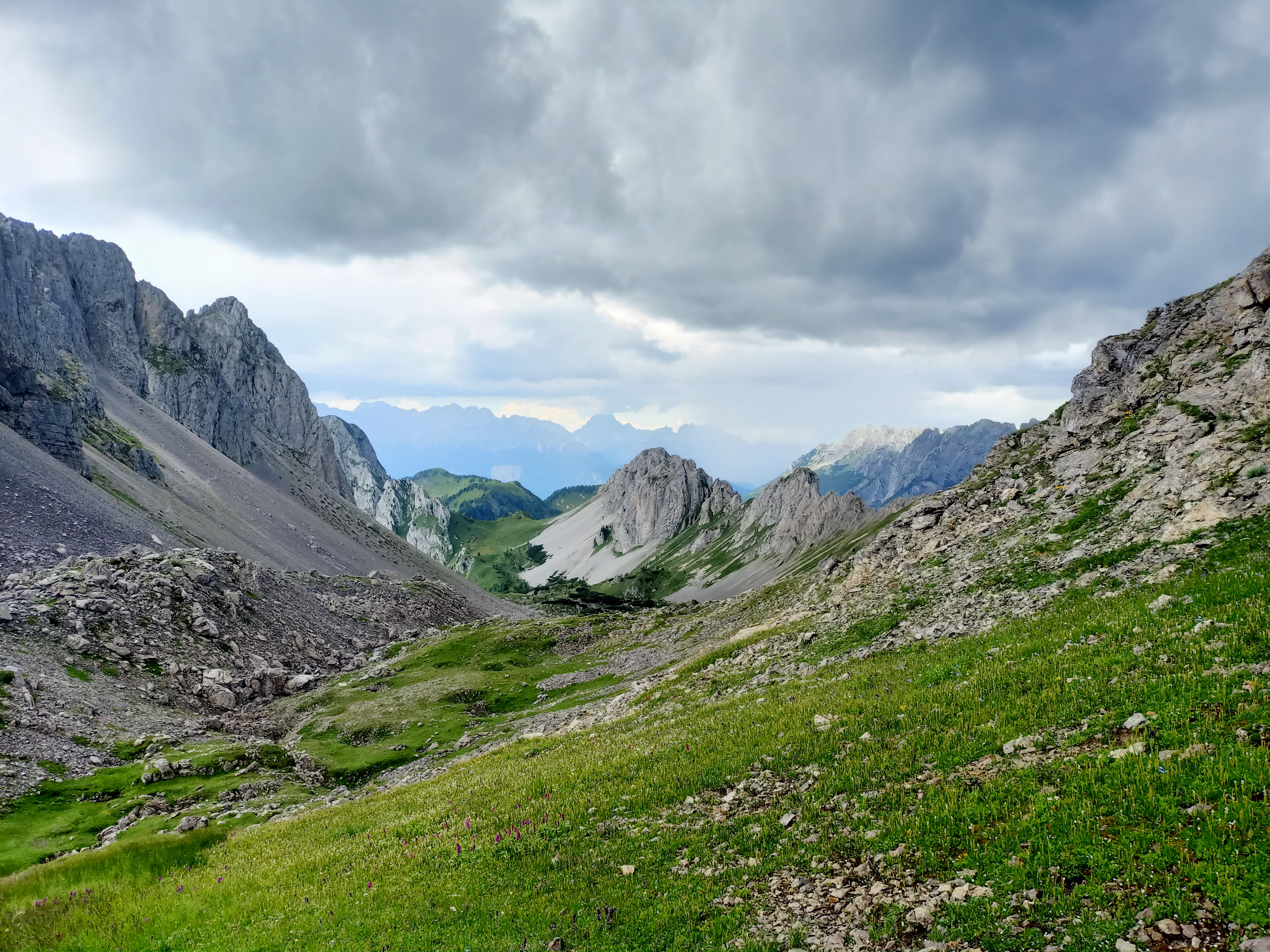 L’ultima ascesa di oggi mi porterà verso la forca Rossa, nel gruppo del Tiarfin. Un punto di passaggio obbligato che raggiungerò tra fitti nuvoloni neri che vanno addensandosi e tuoni che rimbrottano nel versante settentrionale, all’ombra di pareti che occludono la vista sul temporale già in atto verso nord.